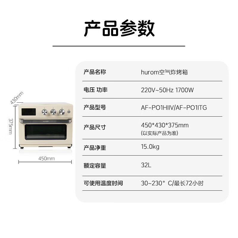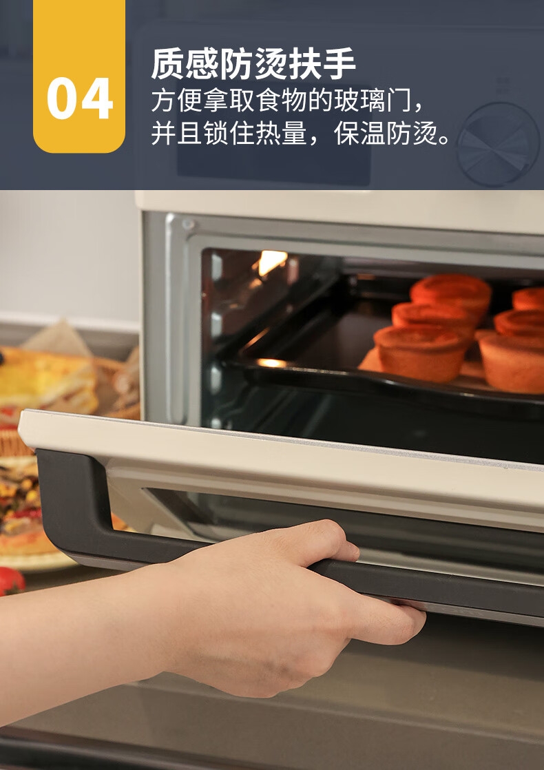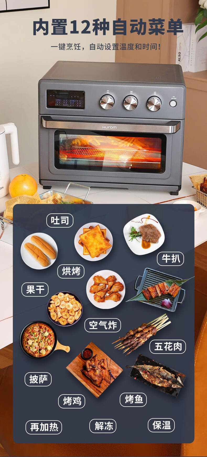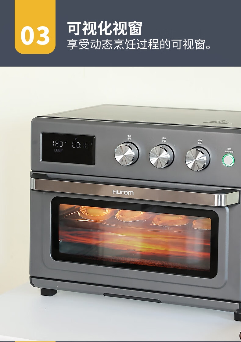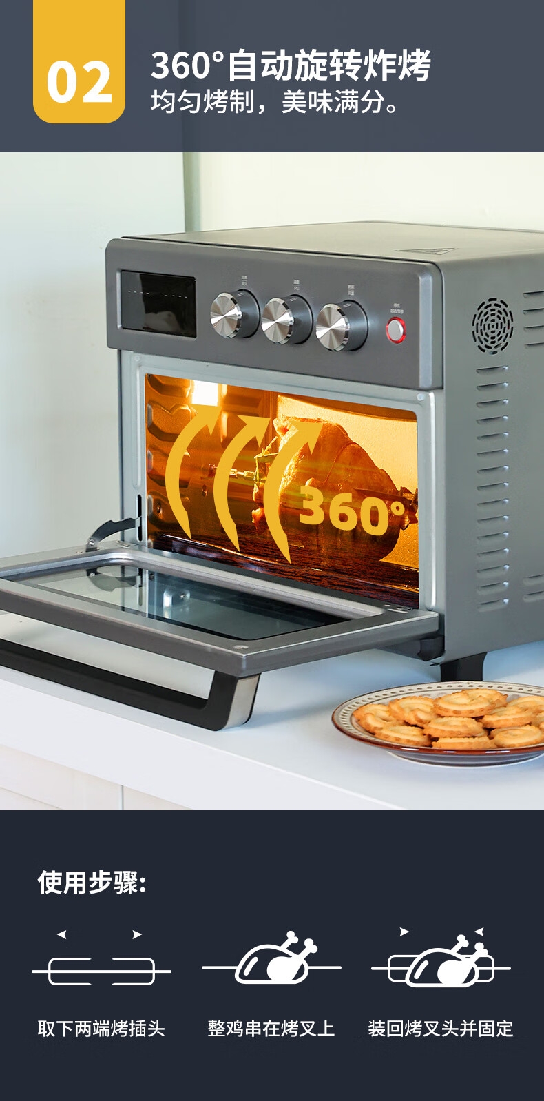 32升大容量,解放食材大小带来的局限。;双重玻璃锁住热量,保温防烫,还可以享受动态的烹饪;专业烤箱/吐司机/微波炉/酸奶机 空气炸锅/干果机