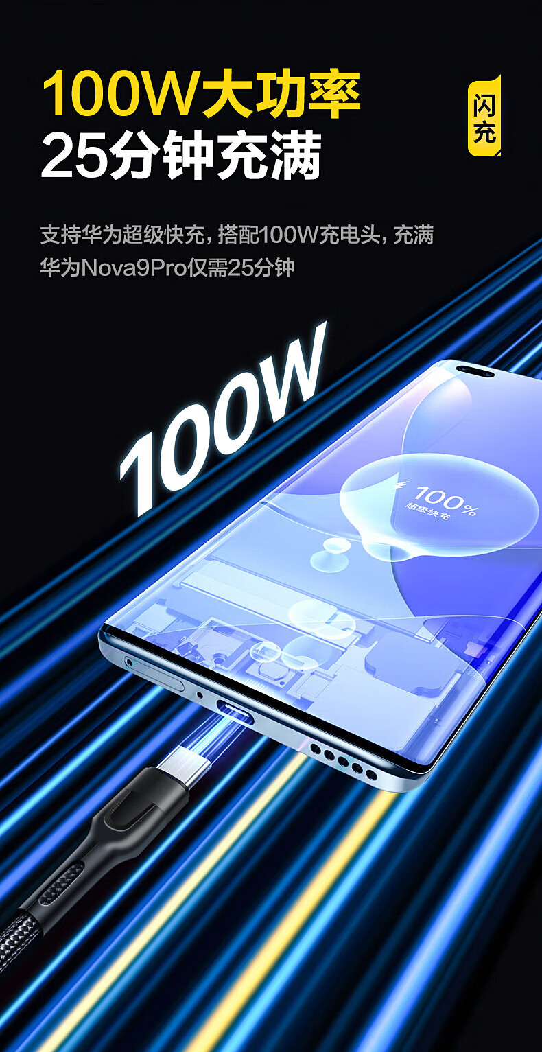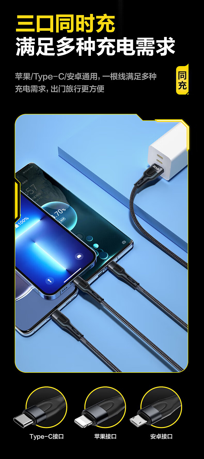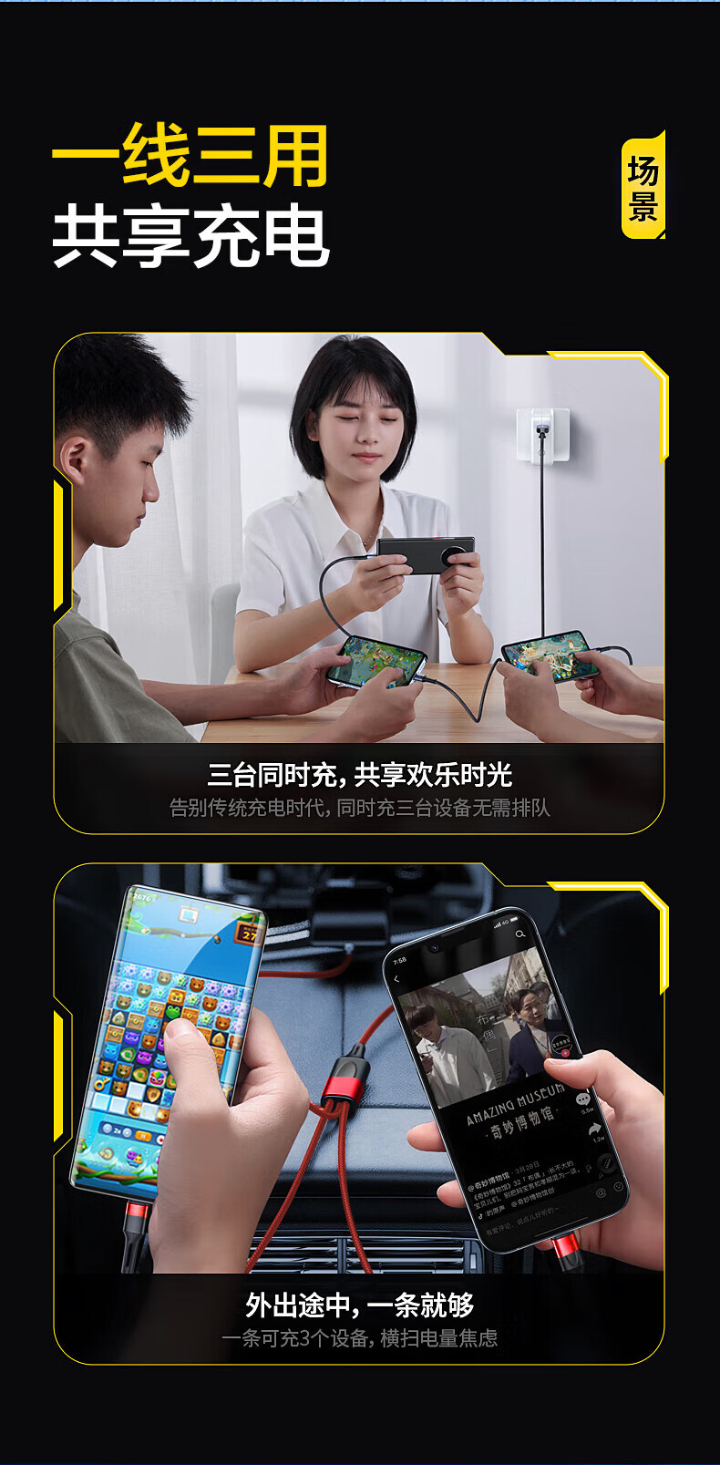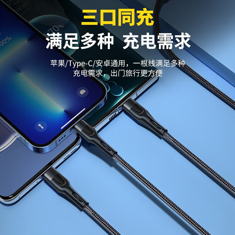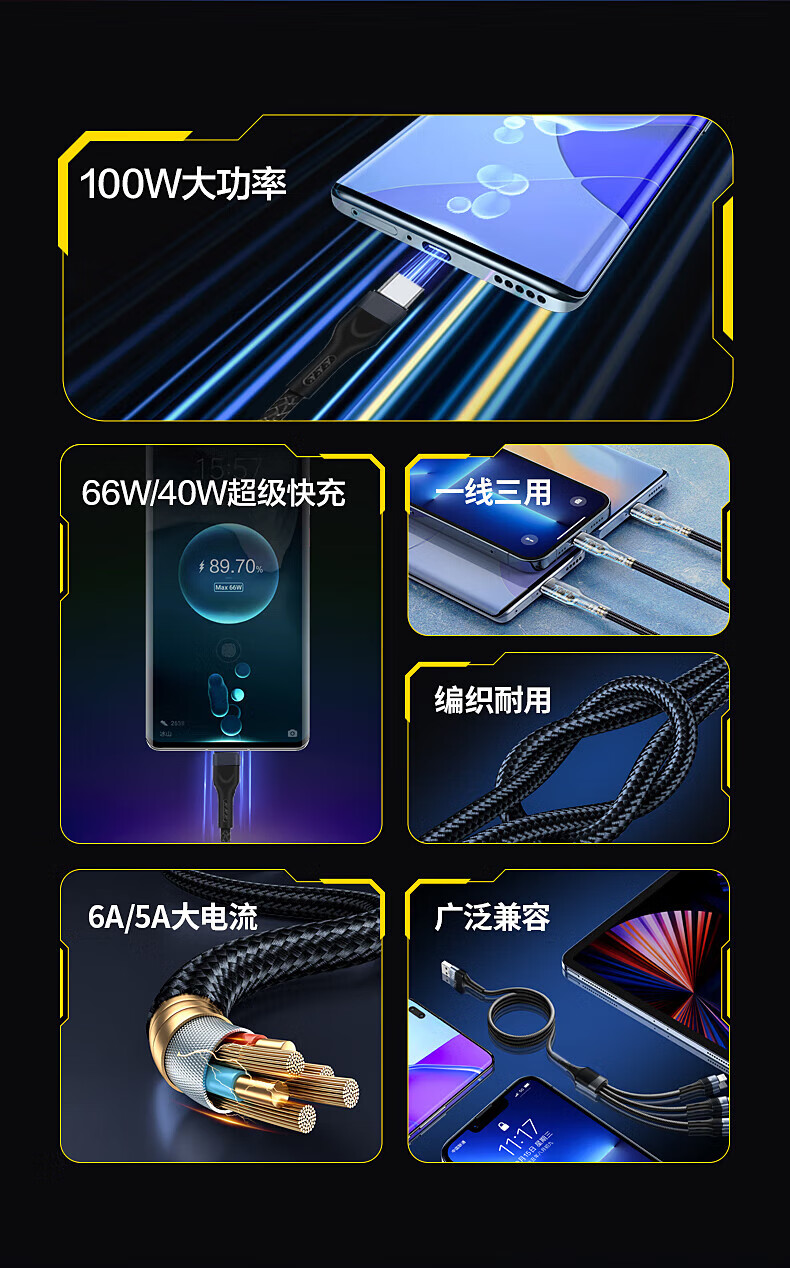 一线三充 桌面简洁/出门减负;5A输出,适用于闪充;尼龙拉车线,品质有保证,耐用结实