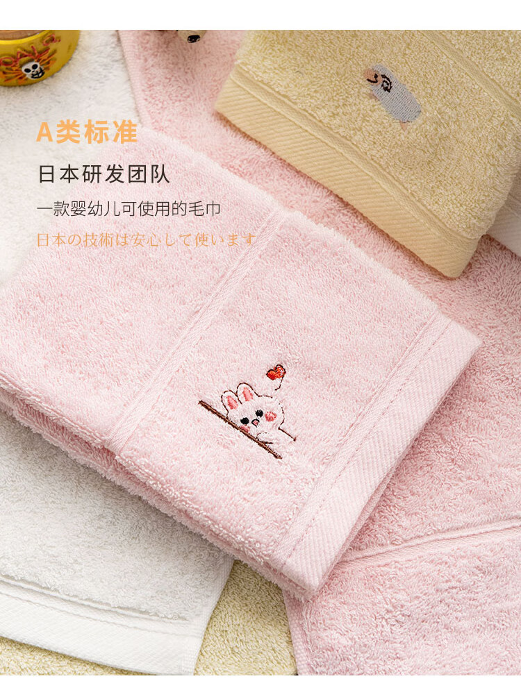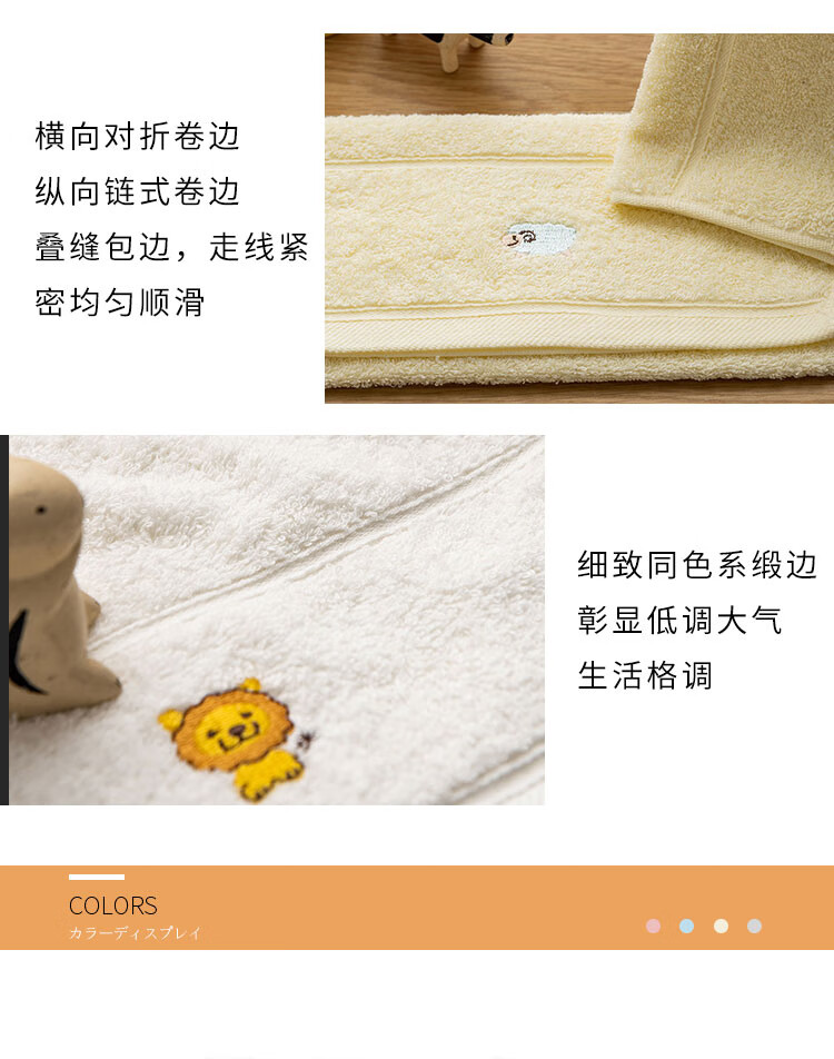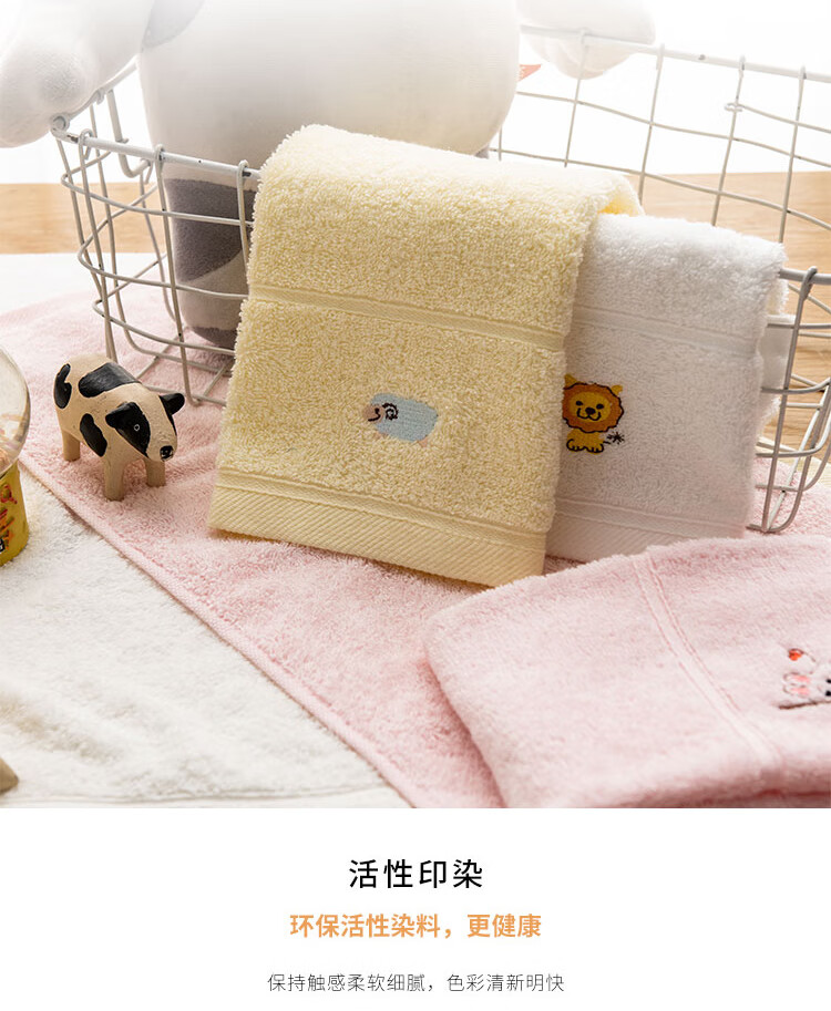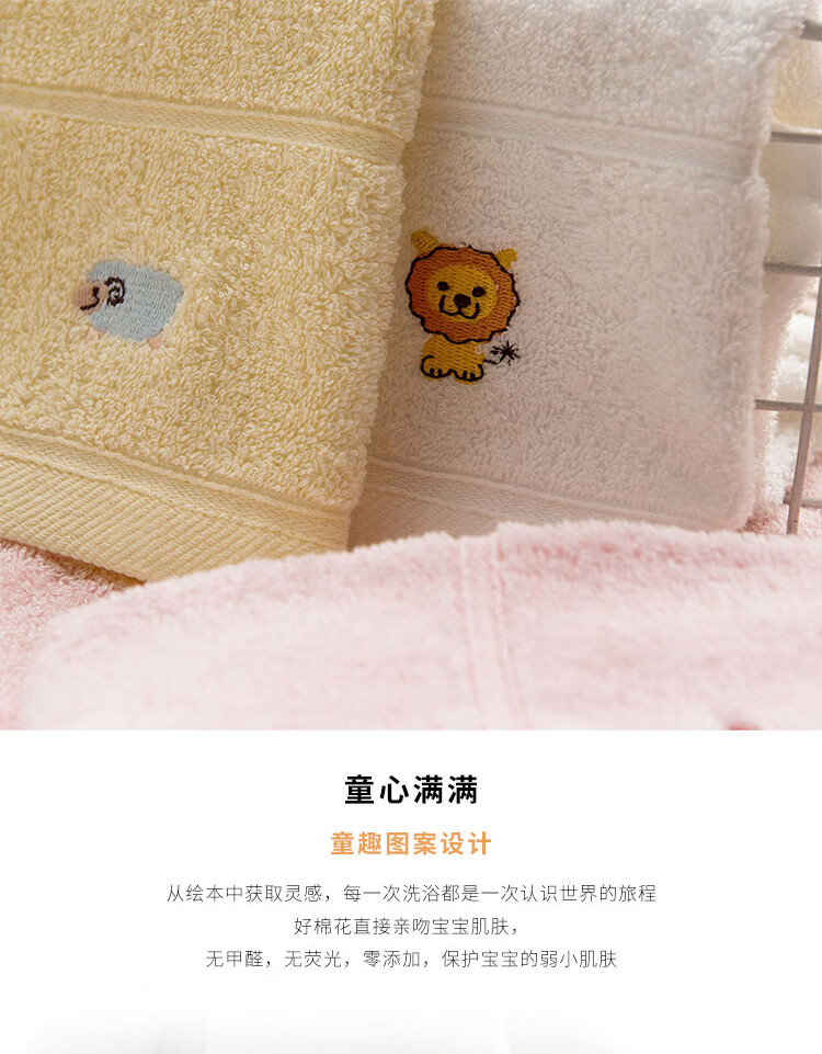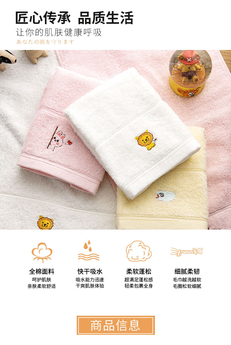 全棉面料,呵护肌肤亲肤柔软舒适;快干吸水,吸水能力迅速,干爽肌肤体验;毛巾越洗越软,毛圈松软细腻