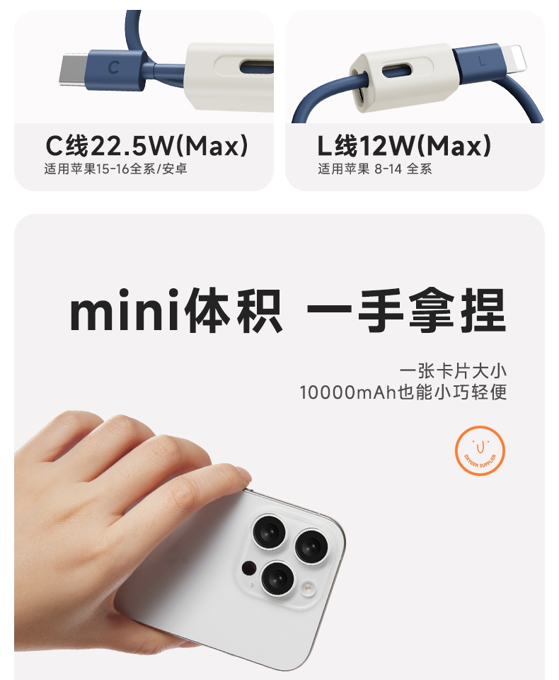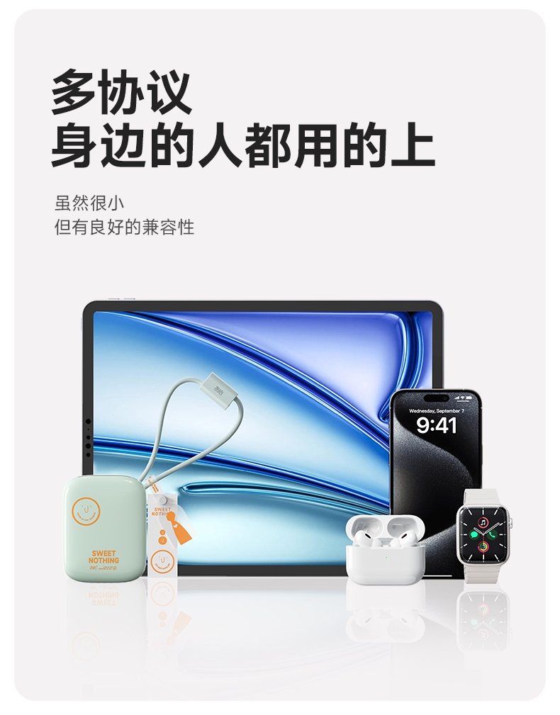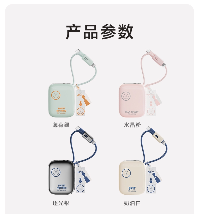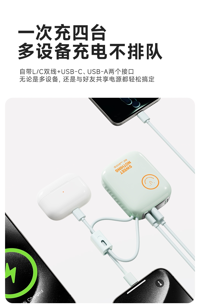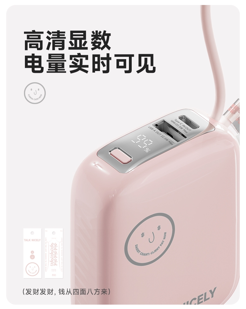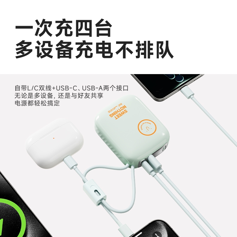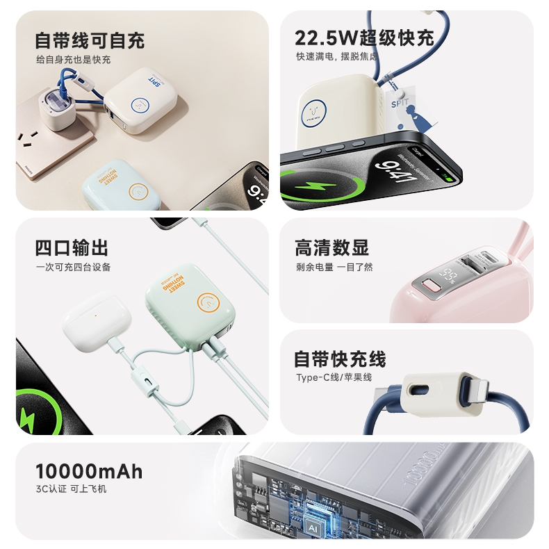 自带充电头,复古造型,自带双线快充,超迷你,卡片大;自带苹果/TC双线,USB-C:快充(22.5W);多重安全保护