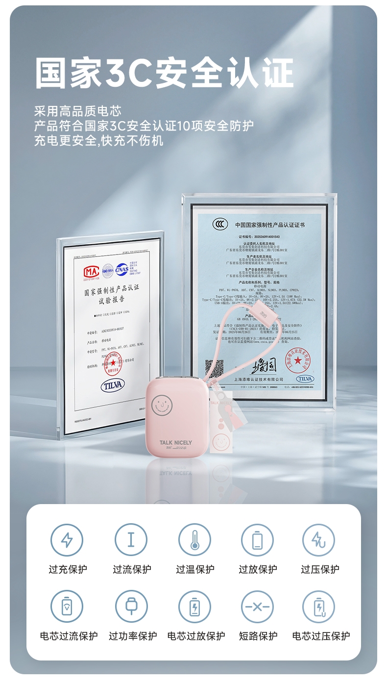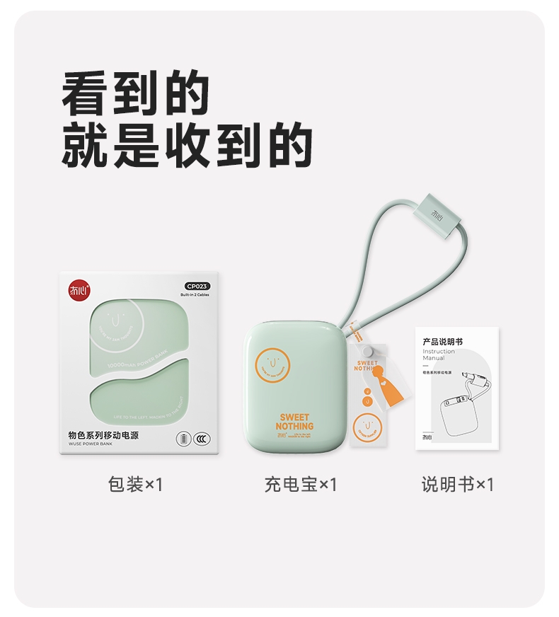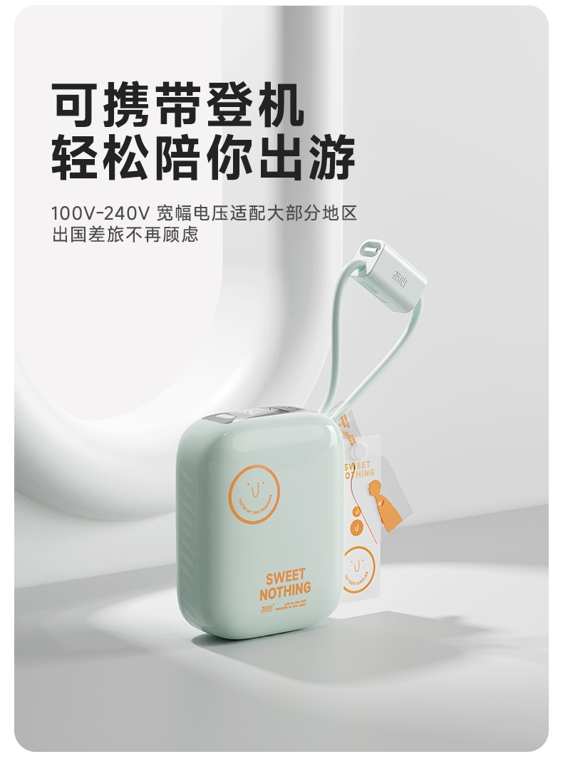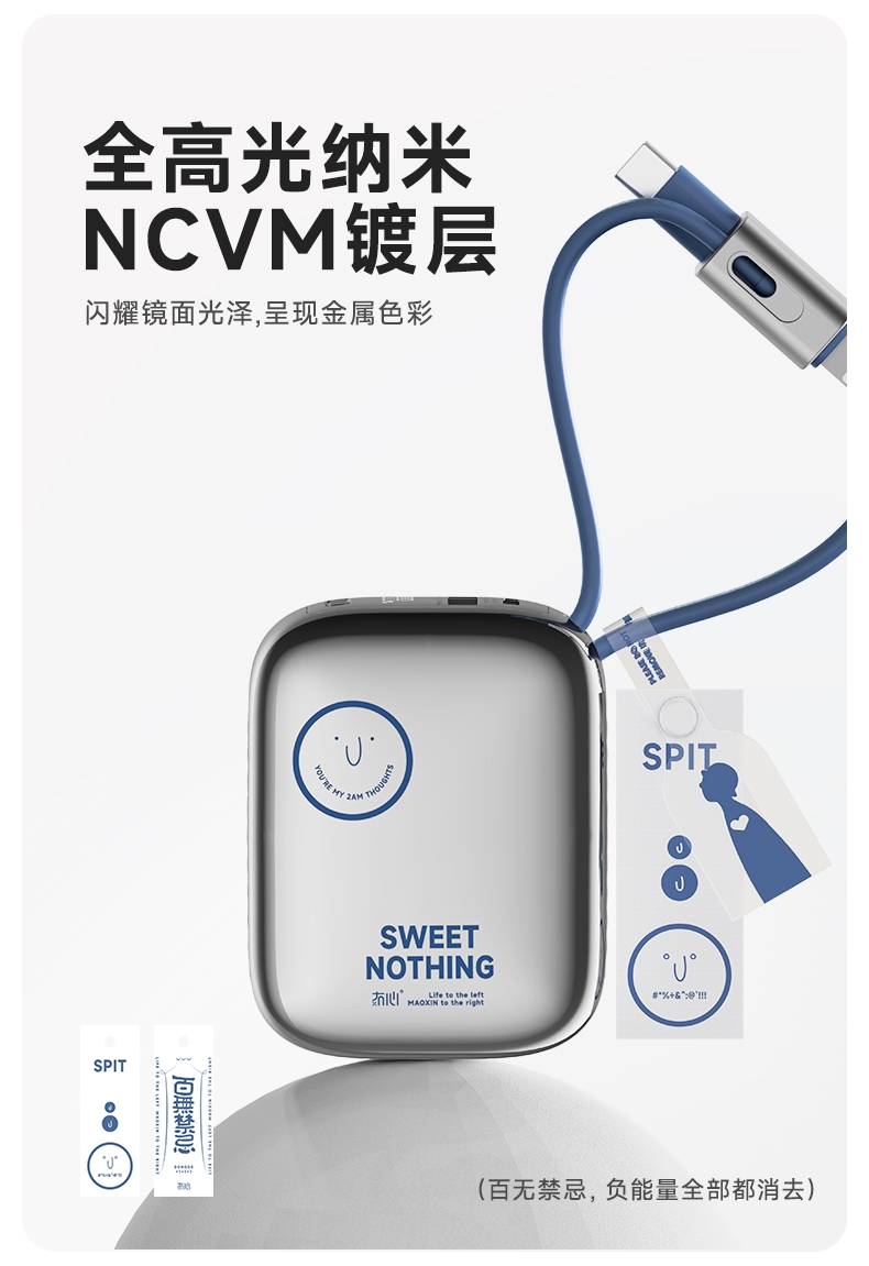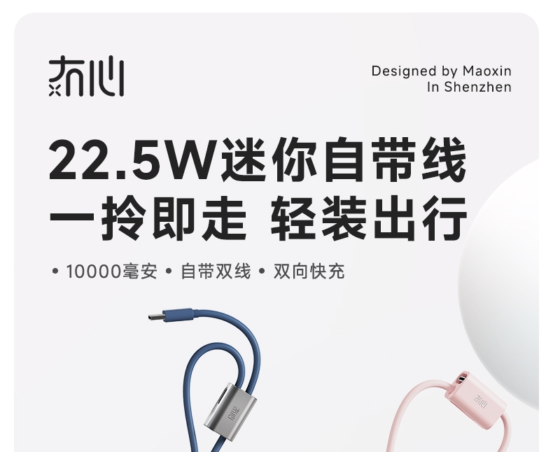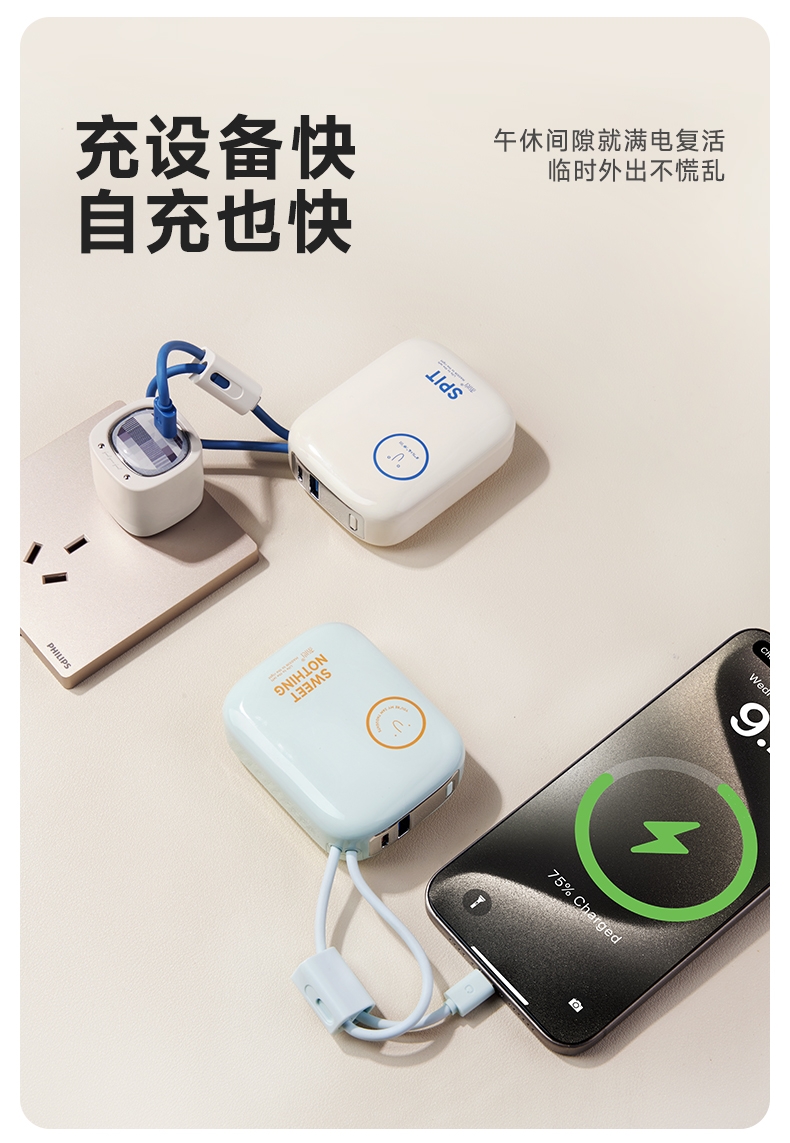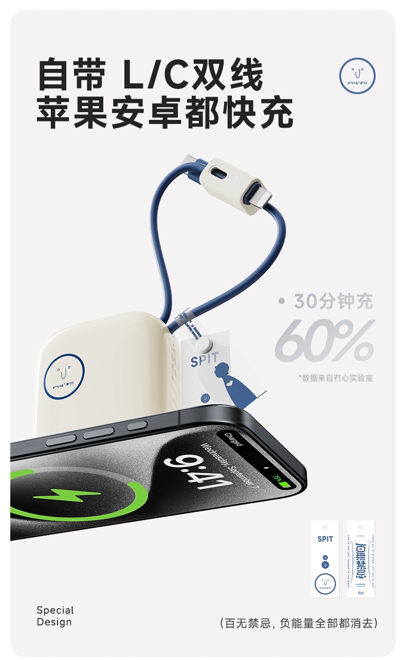 自带充电头,复古造型,自带双线快充,超迷你,卡片大;自带苹果/TC双线,USB-C:快充(22.5W);多重安全保护