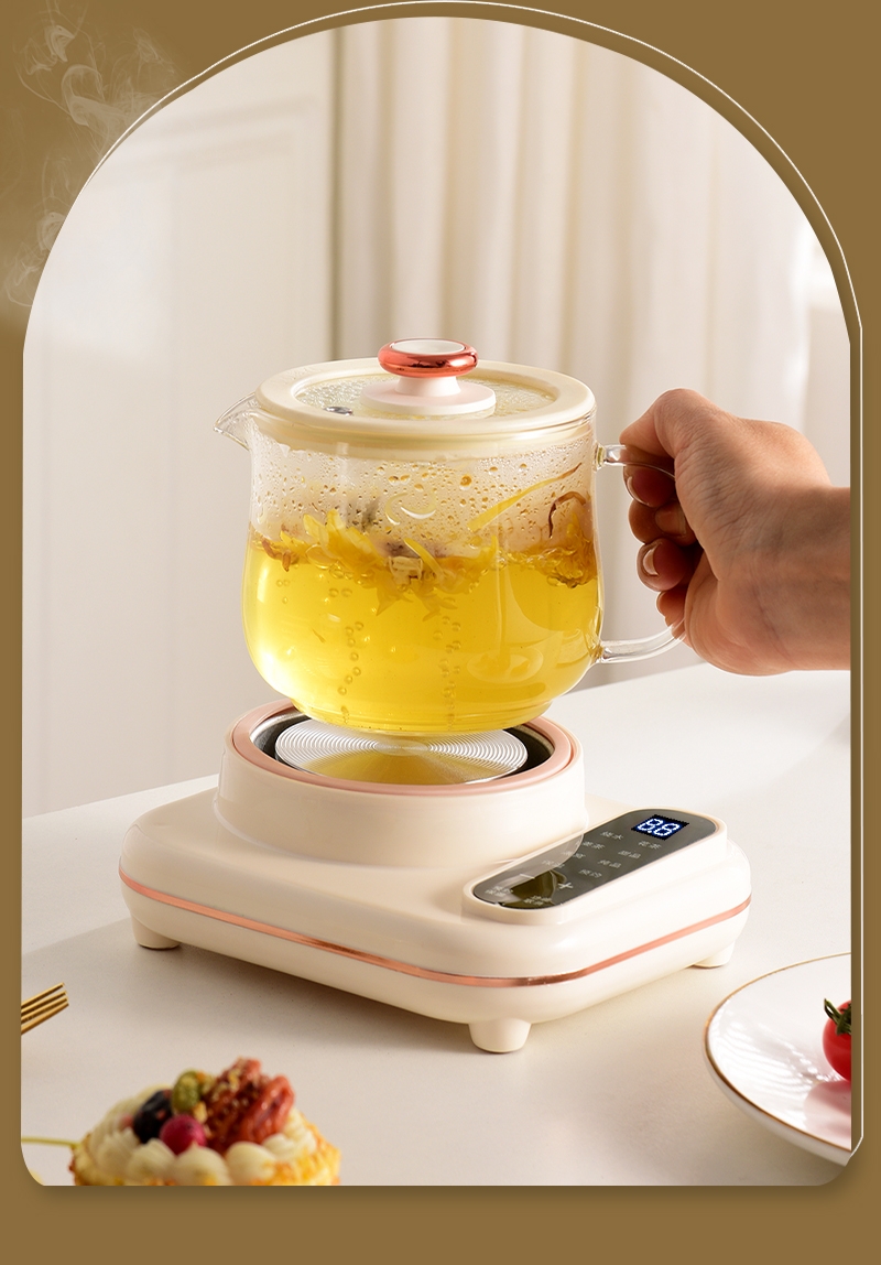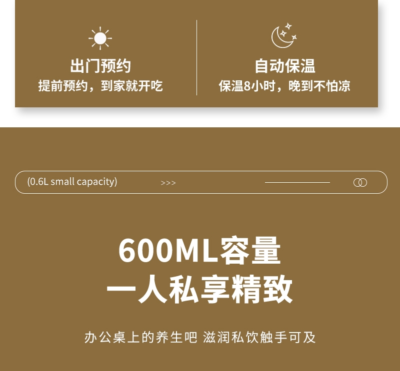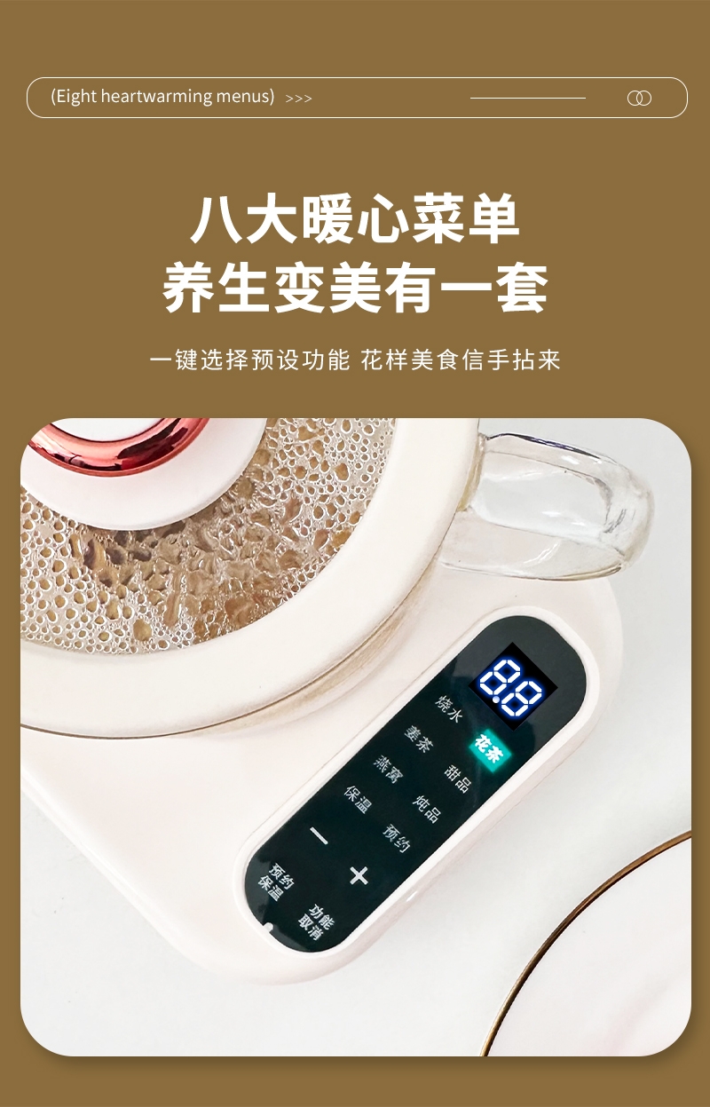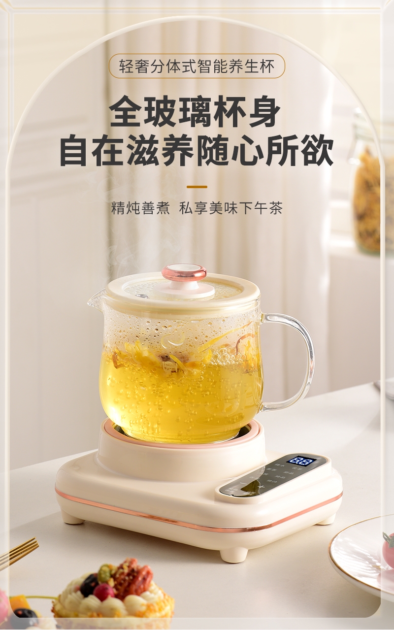 智能触摸控制,8大暖心菜单;30dB低噪纯煮,工作时也不惊扰;高硼硅全玻璃壶身,冷热交替不易裂;24小时智能预约,8小时长效保温;分体设计,清洗方便