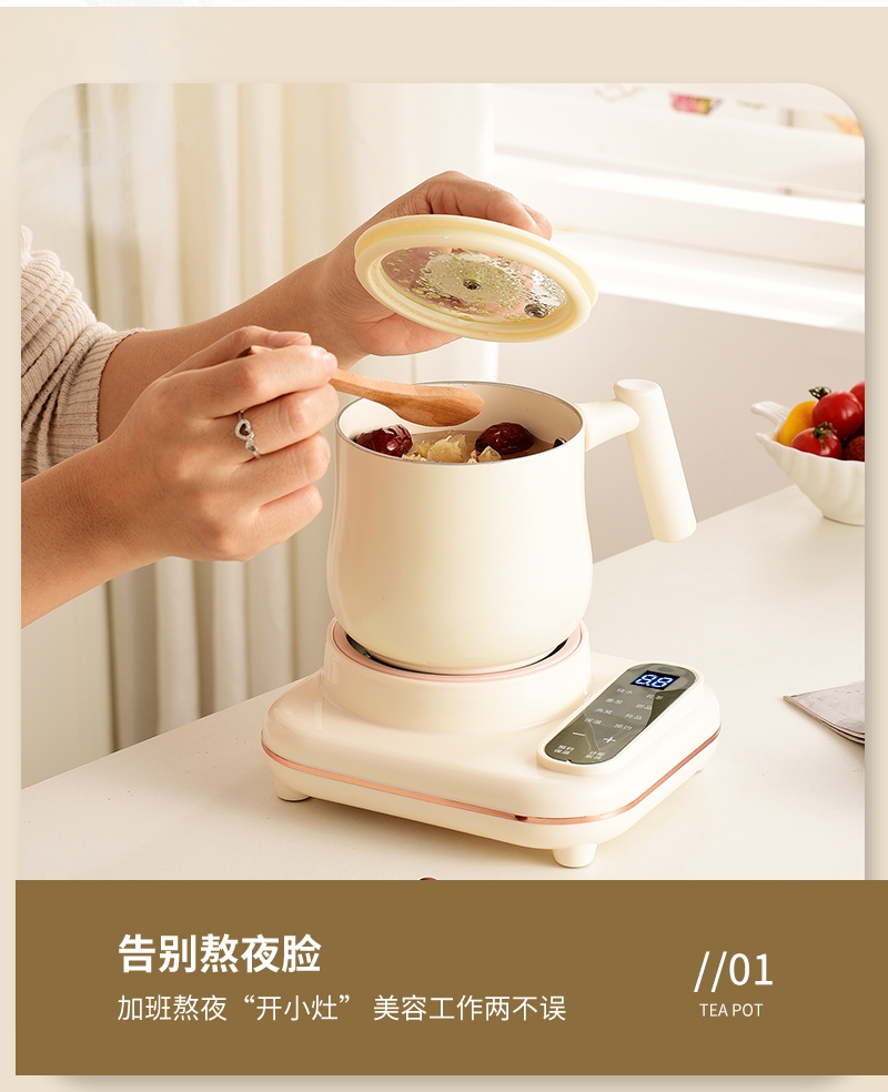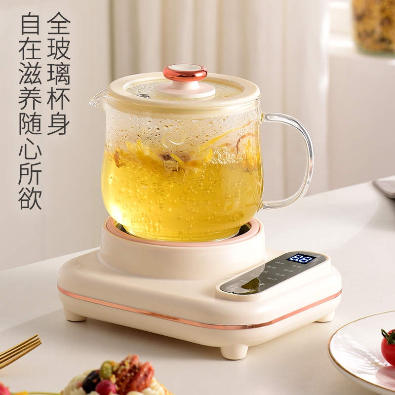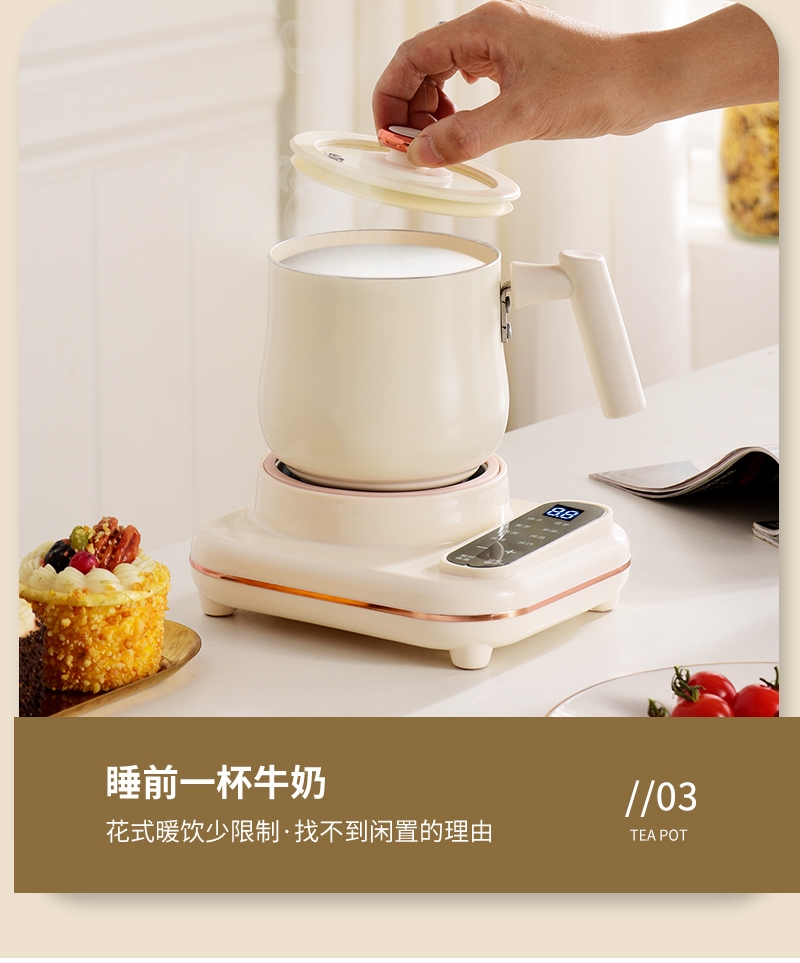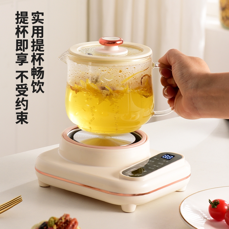 智能触摸控制,8大暖心菜单;30dB低噪纯煮,工作时也不惊扰;高硼硅全玻璃壶身,冷热交替不易裂;24小时智能预约,8小时长效保温;分体设计,清洗方便