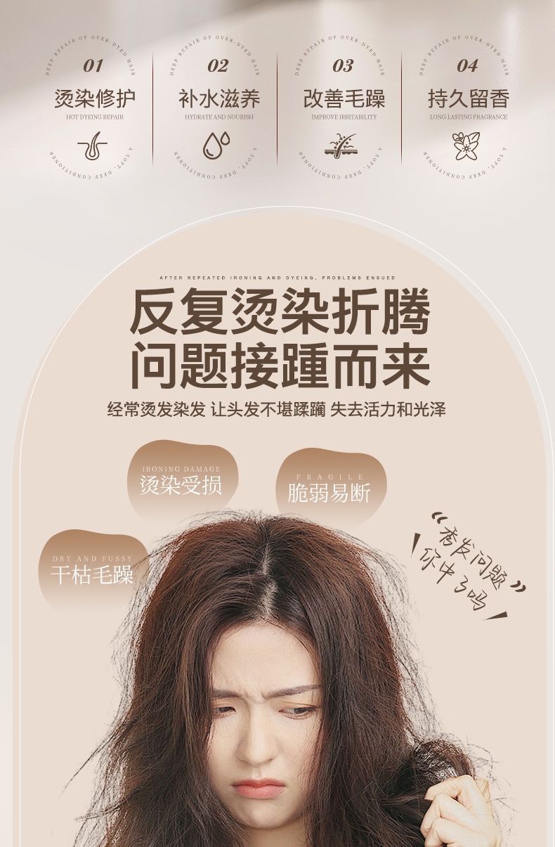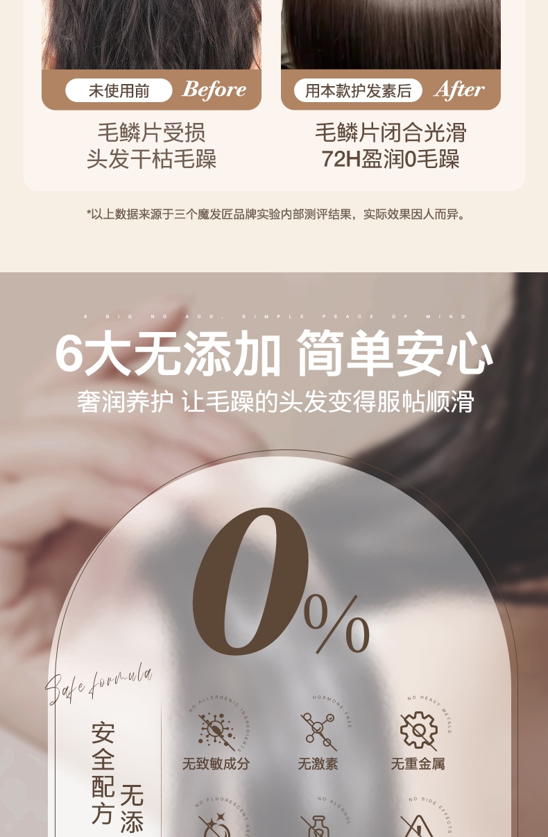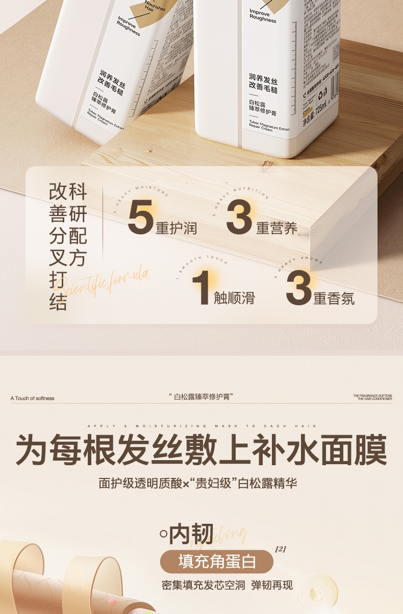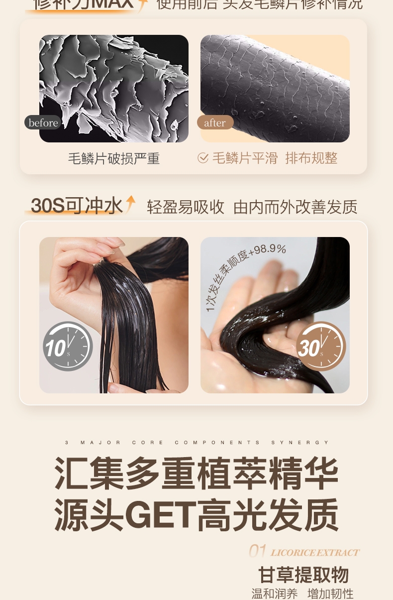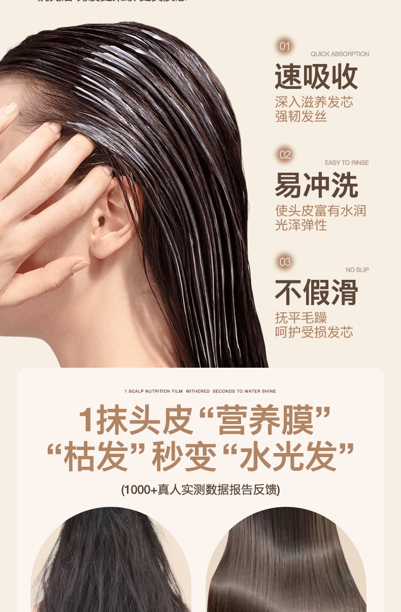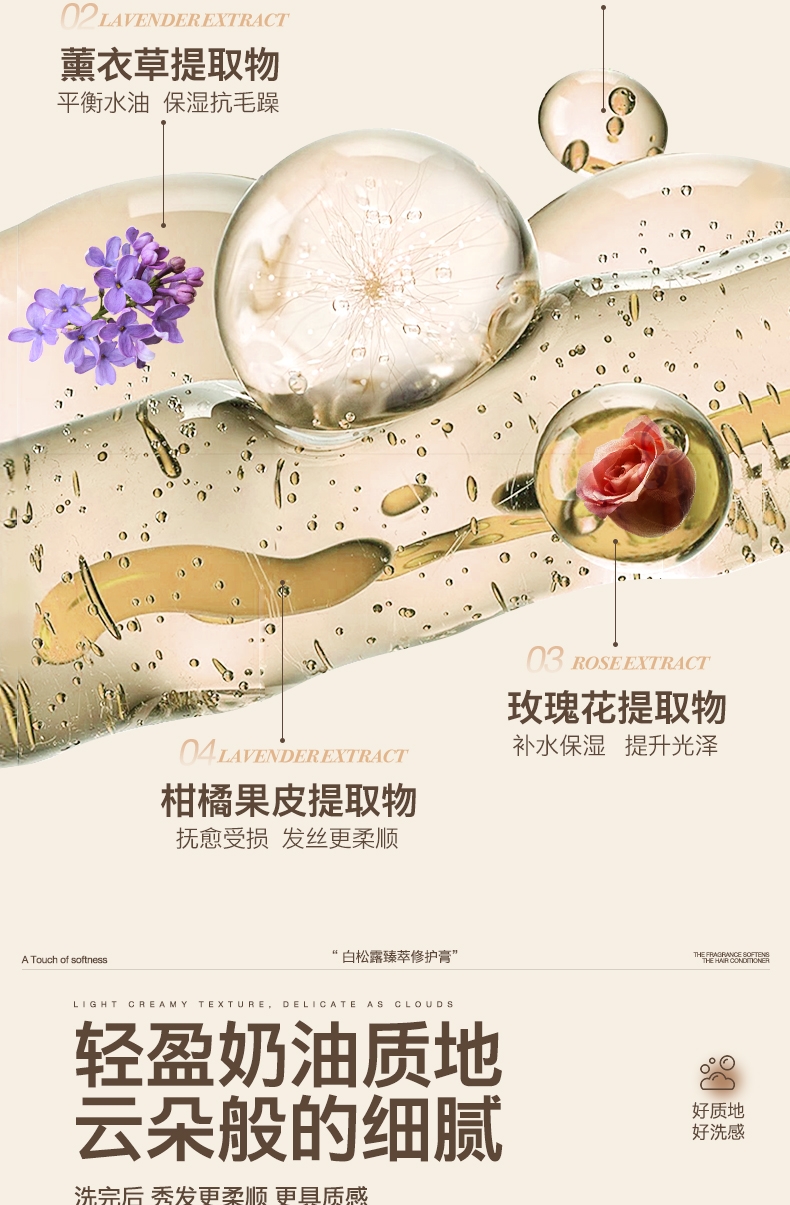 深入修护受损毛鳞片,告别干枯毛躁;空气感蓬松,细软扁塌发质的救星;为发丝注入光泽,秀发亮泽动人