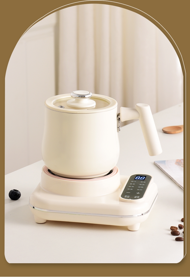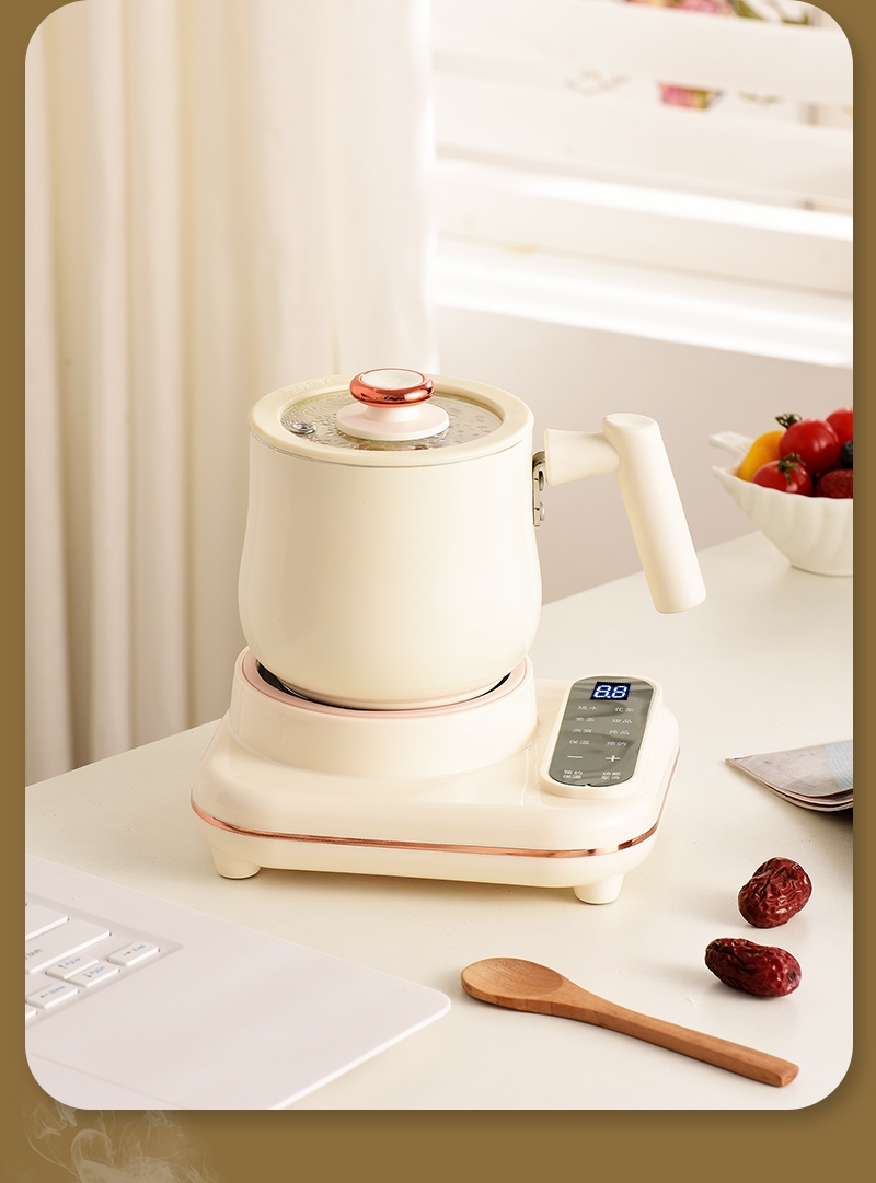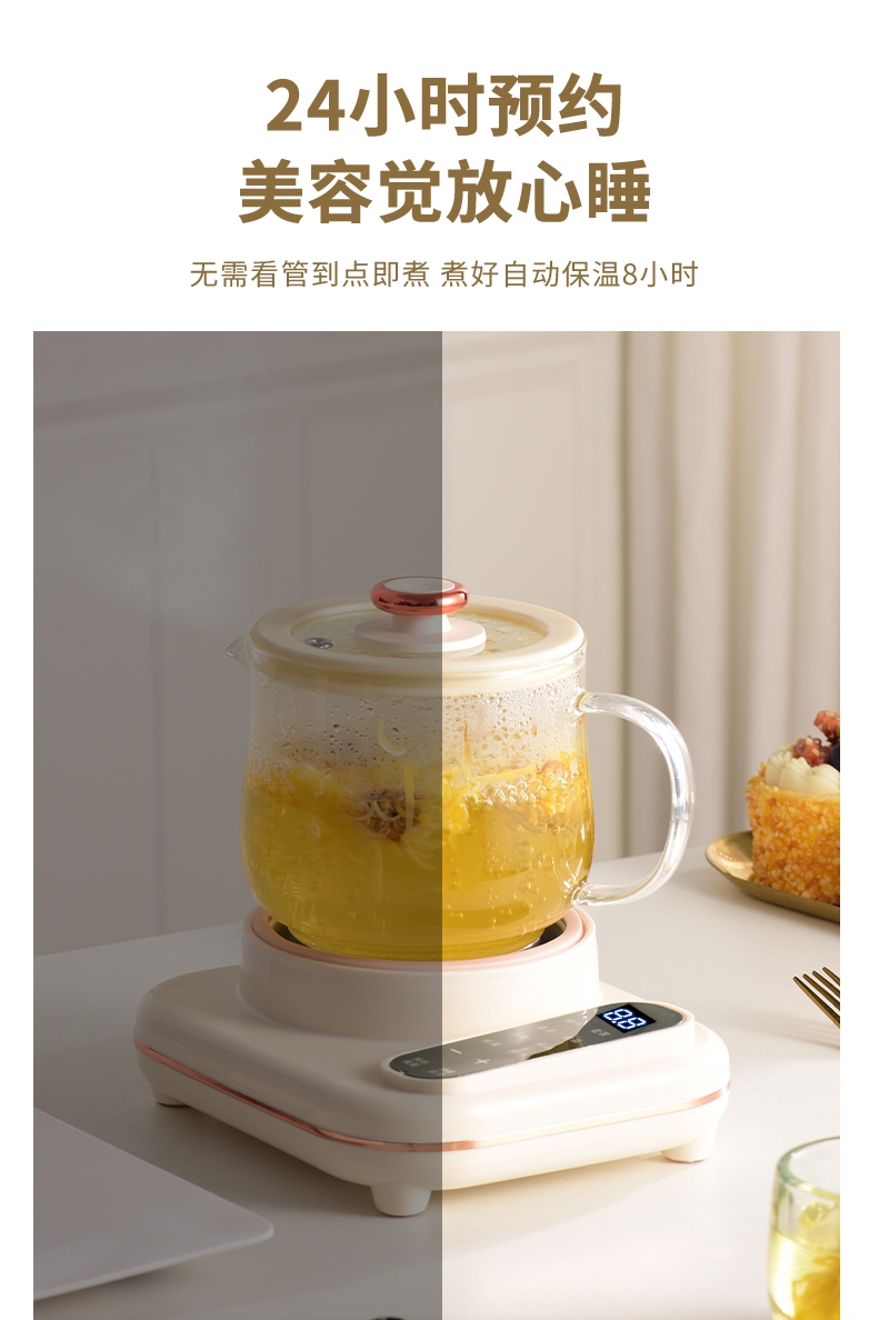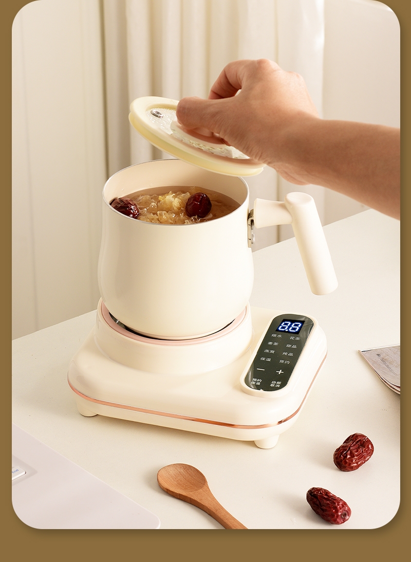 600ml精巧容量,私享大满足;智能触摸控制,8大暖心菜单;30dB低噪纯煮,工作时也不惊扰;24小时智能预约,8小时长效保温;分体设计,清洗方便
