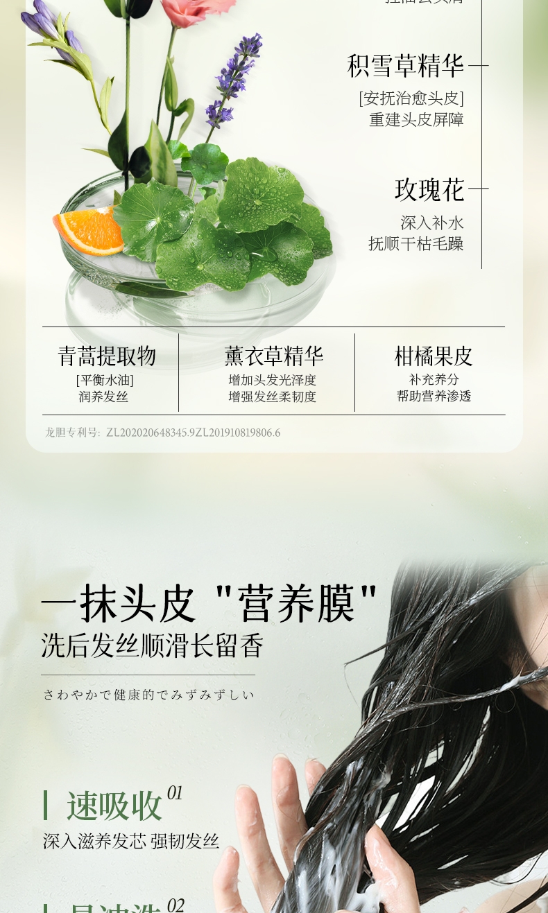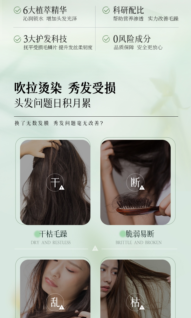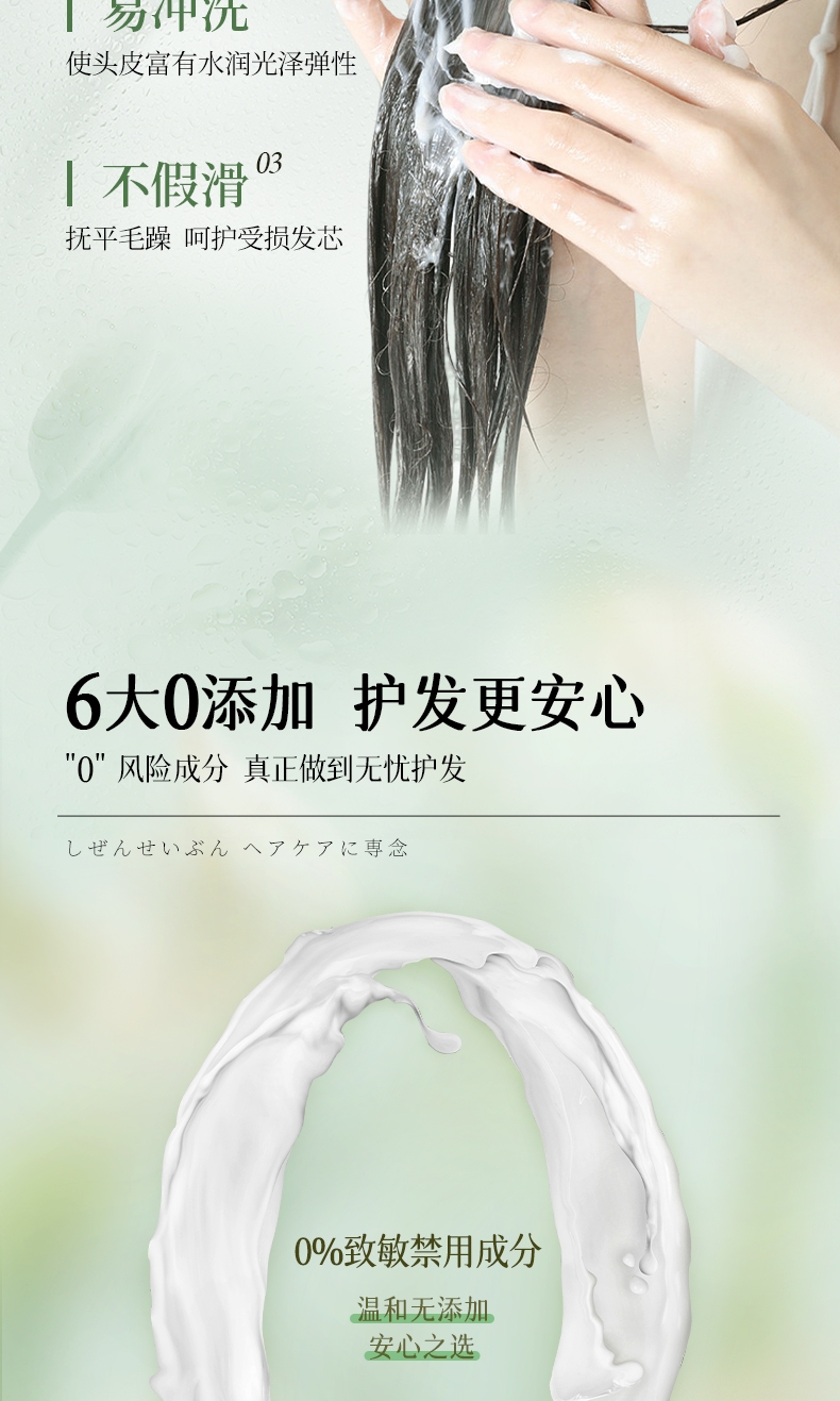 空气感蓬松,细软扁塌发质的救星;为发丝注入光泽,秀发亮泽动人;天然植萃配方,给头皮贴心呵护