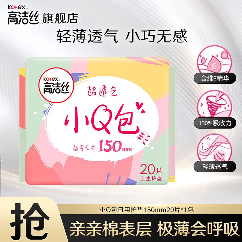 配置清单:高洁丝小Q包极薄无香150mm护垫 20片*1 高洁丝奢爽纯棉240mm 8片*2 高洁丝放肆睡丝薄棉柔350mm夜用5片*1 高洁丝超薄甜睡夜安裤L号 2片*1
