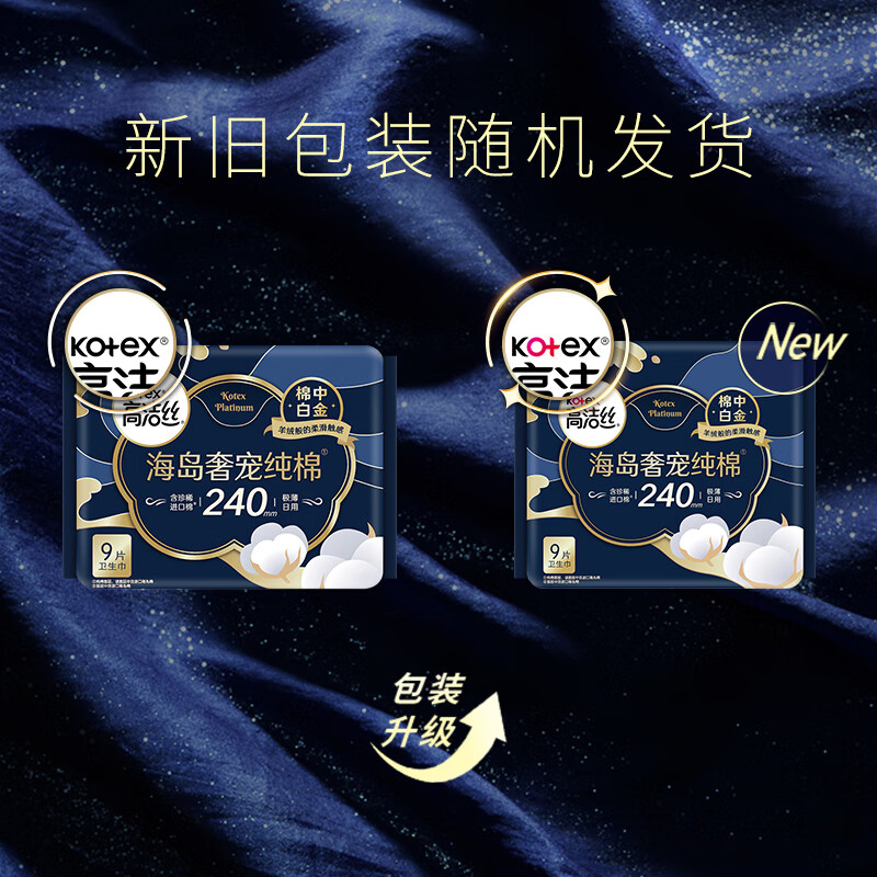 配置清单:高洁丝奢宠海岛棉纯棉卫生巾240mm9片*1 高洁丝海岛奢宠极薄纯棉280mm夜用 7片*1 高洁丝超薄甜睡夜安裤L号 2片*1