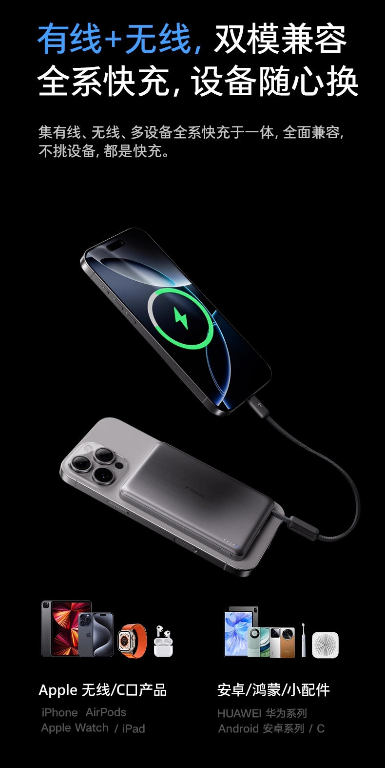 功能:磁吸充电,自带数据线,无线充电