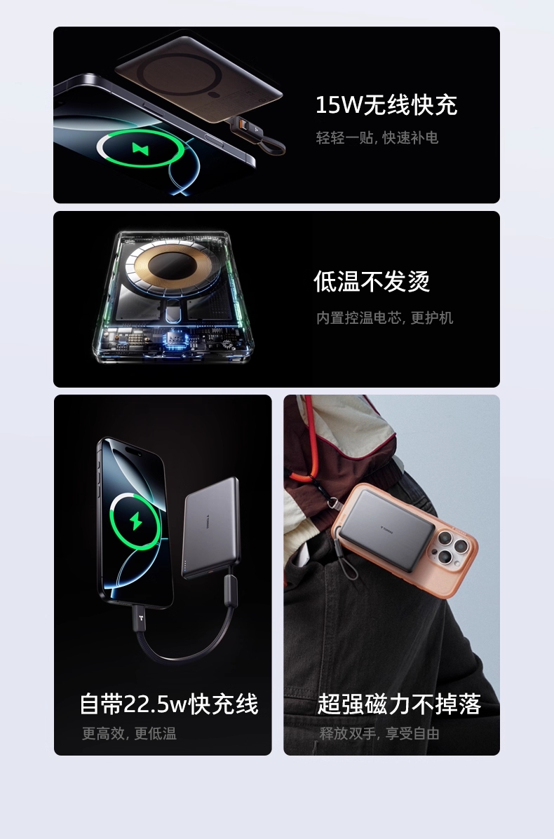 低温不发烫;超强磁力不掉落;自带22.5w快充线
