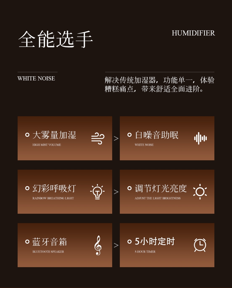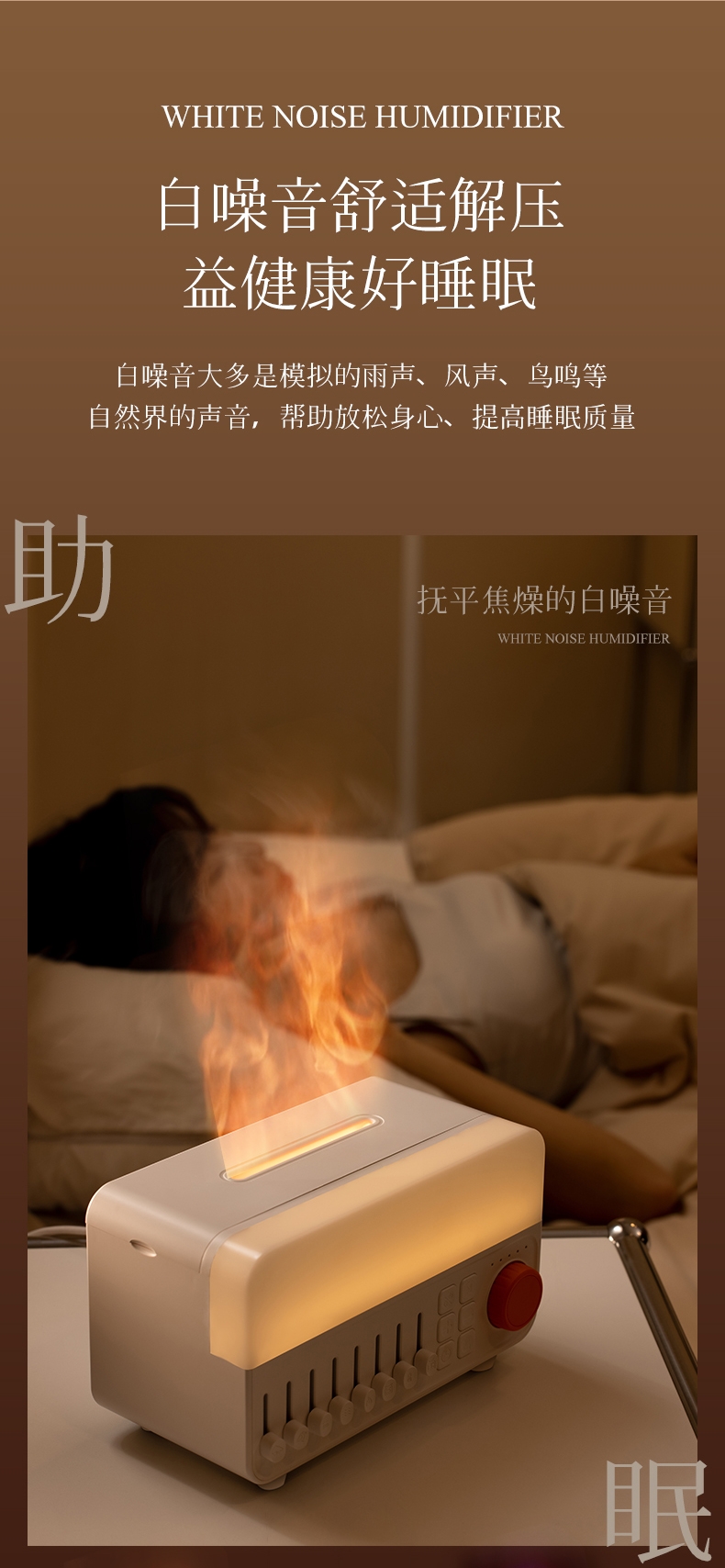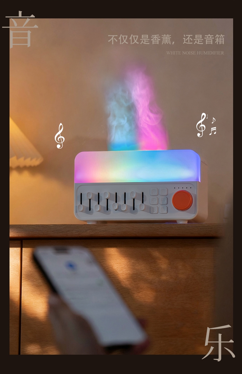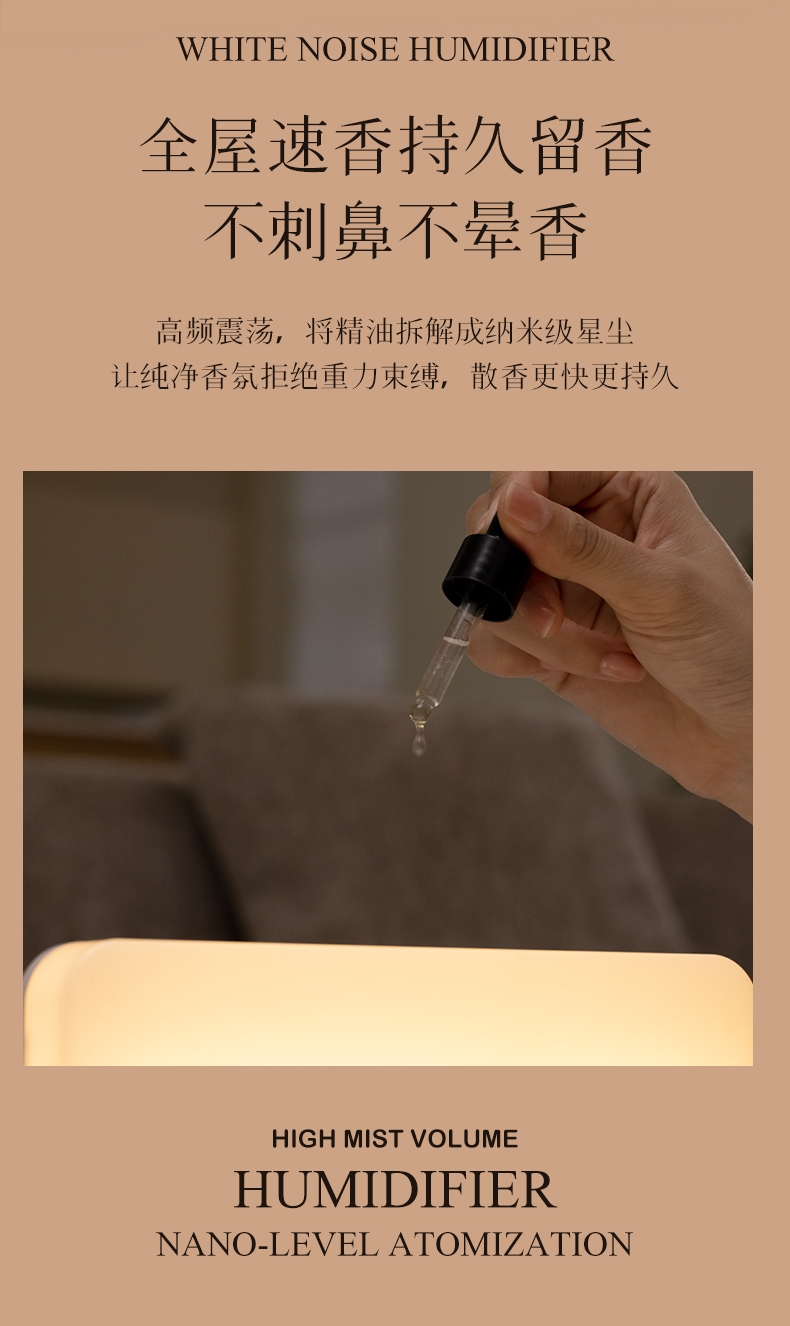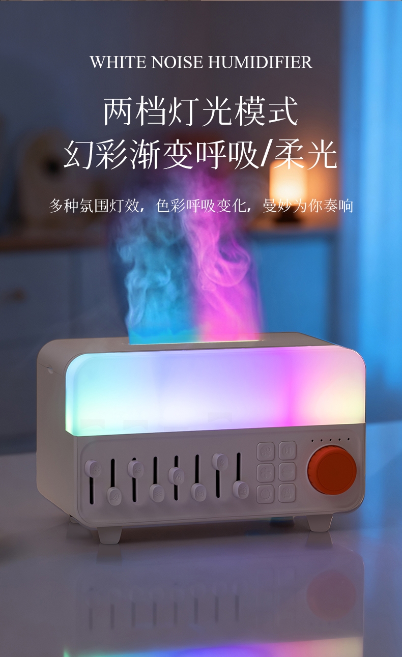 大雾亮加湿+七彩呼吸氛围灯+白噪音助眠;两档调节,1/2/3/4/5小时定时;静音降噪,加湿不扰眠