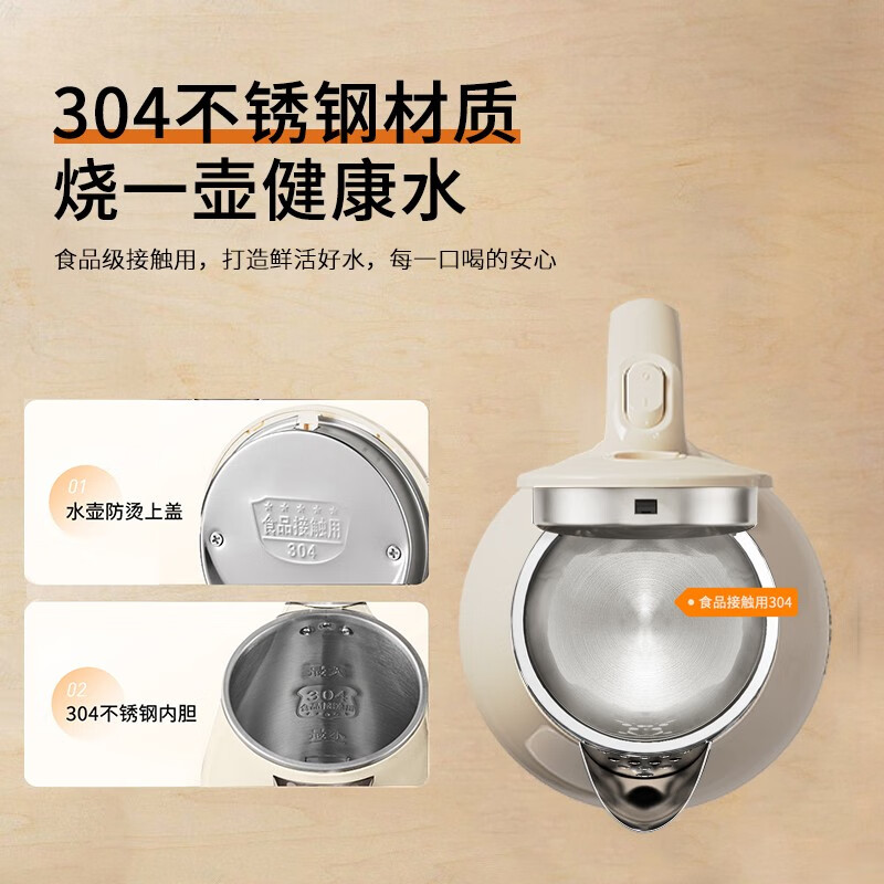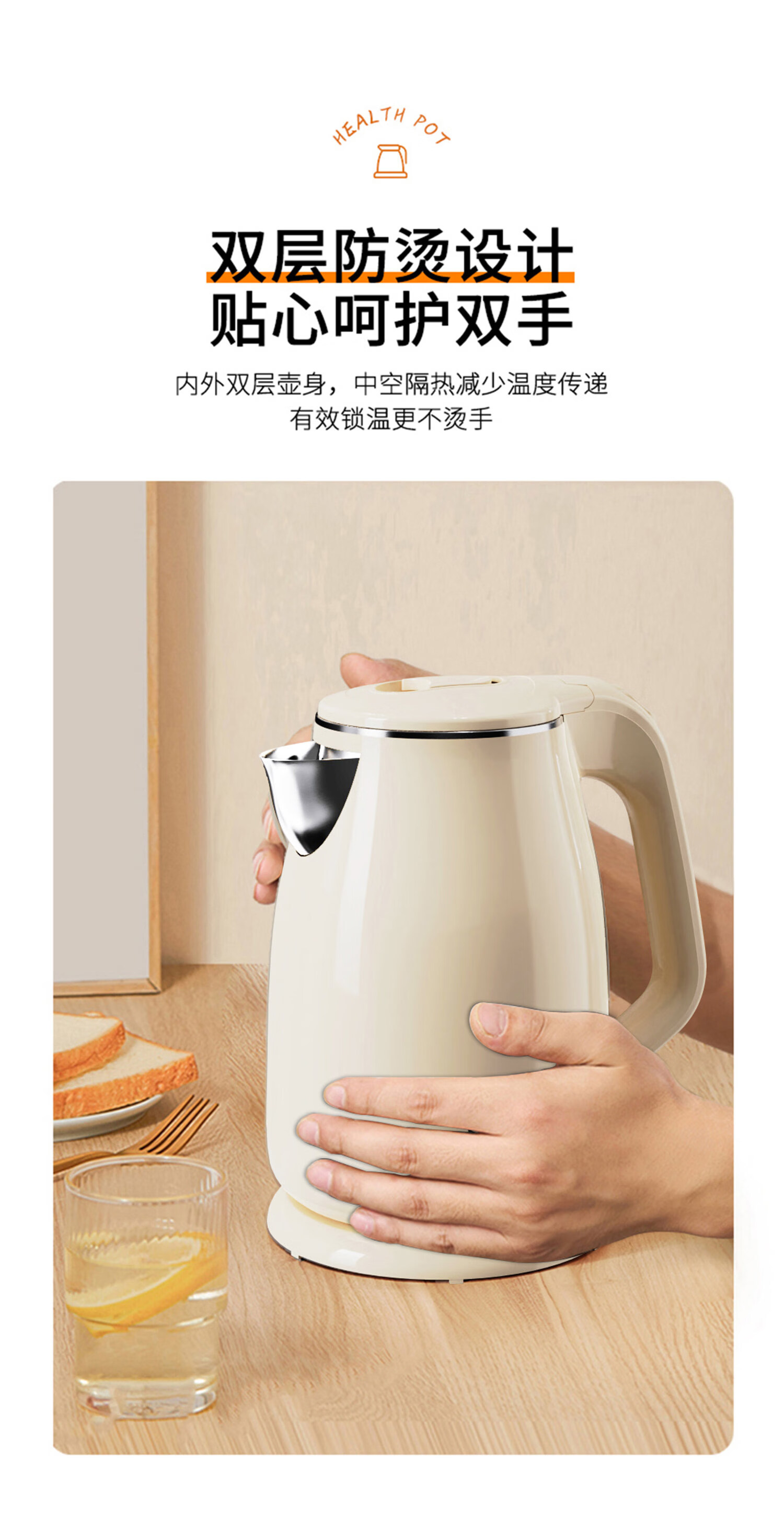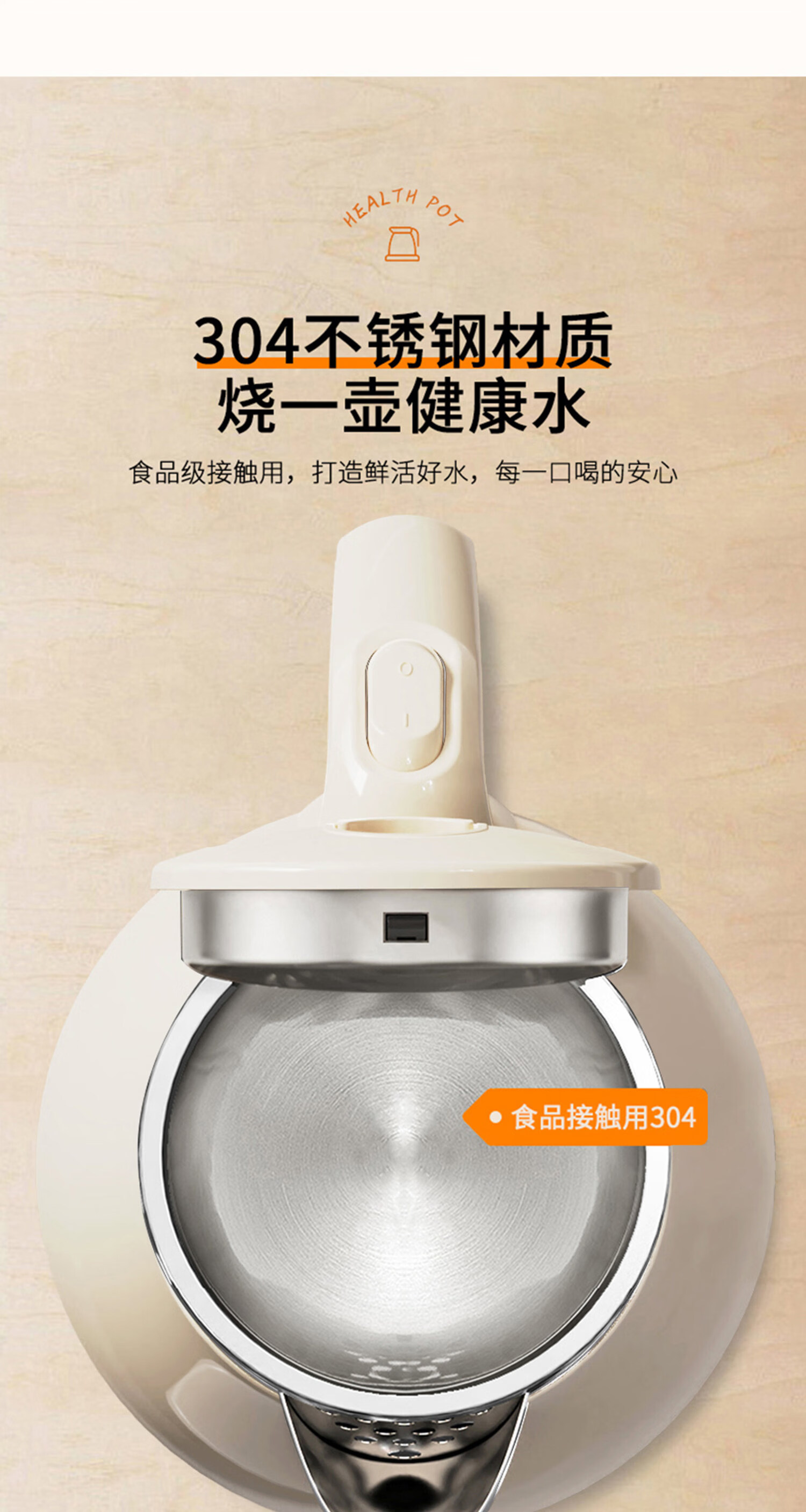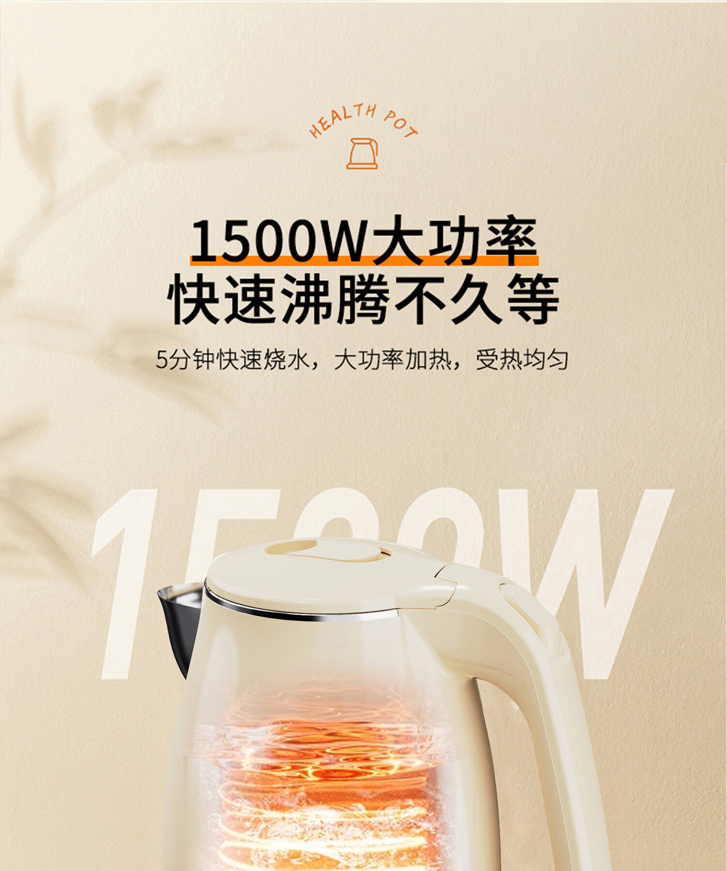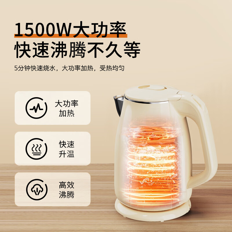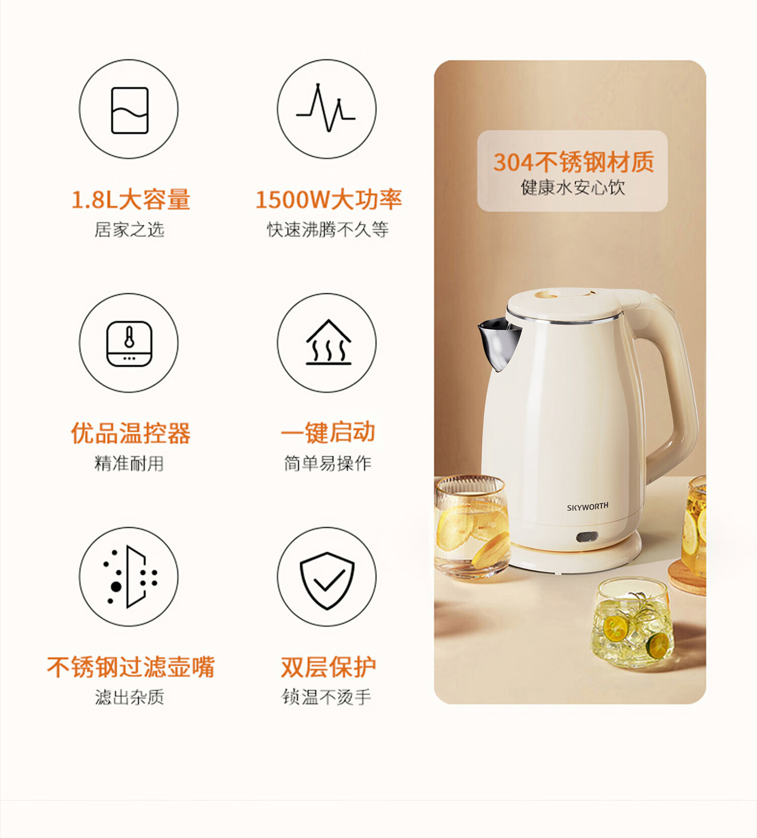 304不锈钢材质,用心选材;1500W大功率,快速沸腾,即烧即饮;双层防烫机身,保温不烫手