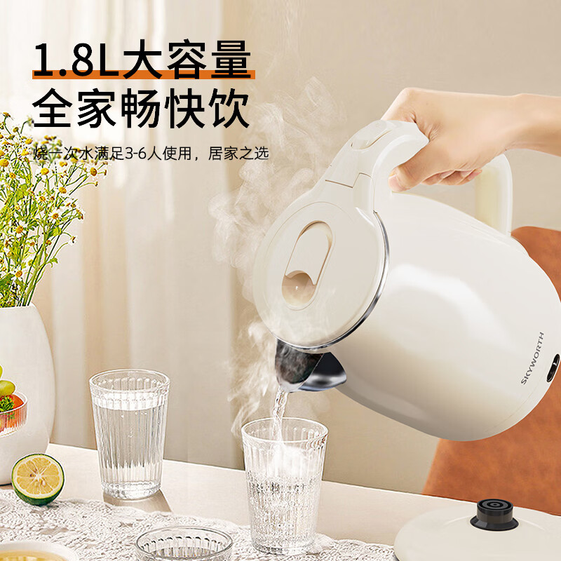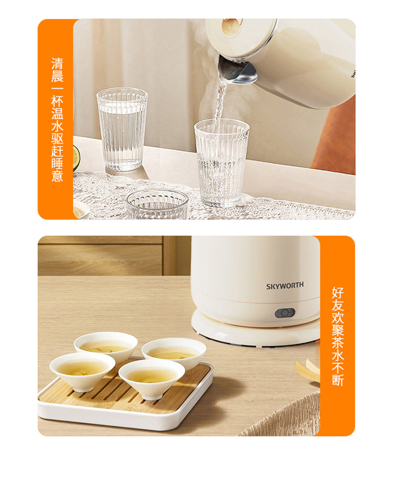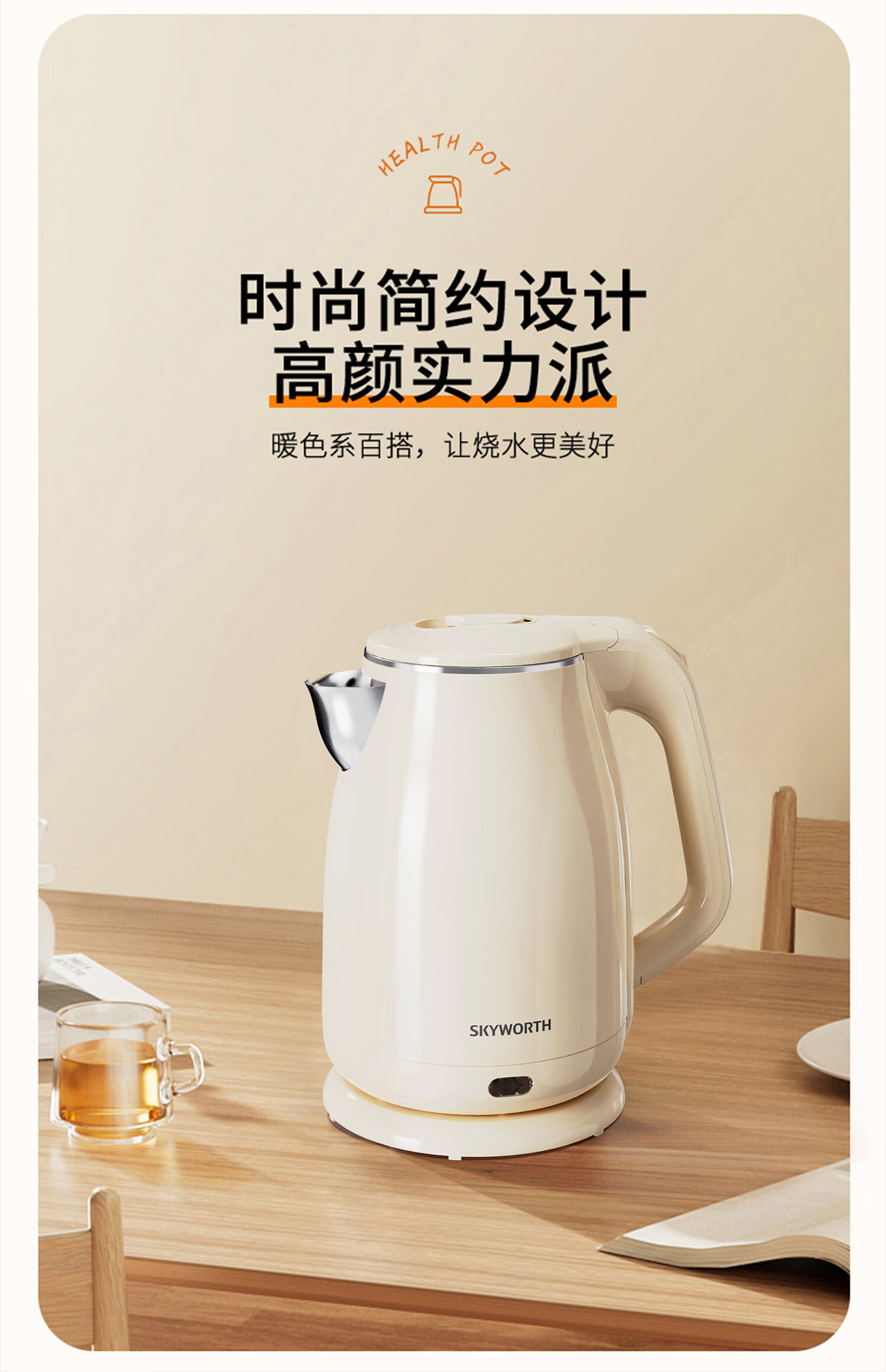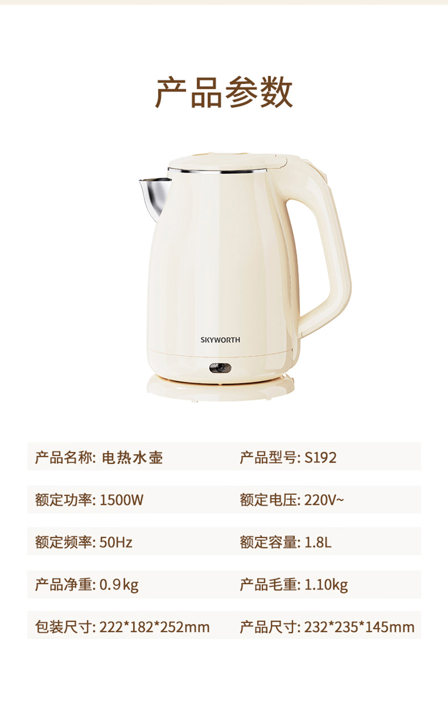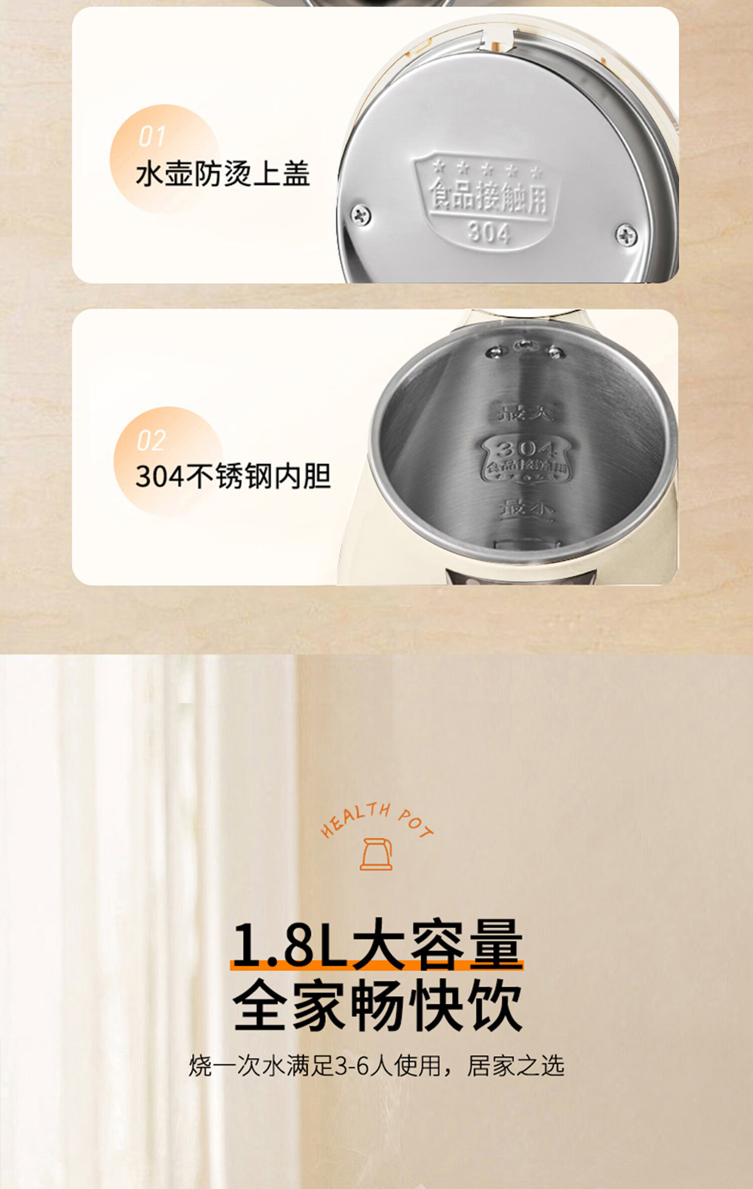 304不锈钢材质,用心选材;1500W大功率,快速沸腾,即烧即饮;双层防烫机身,保温不烫手