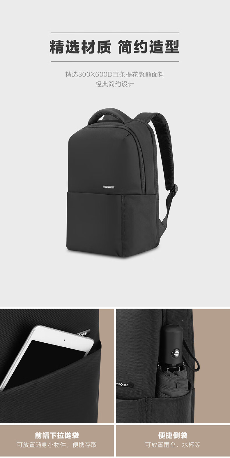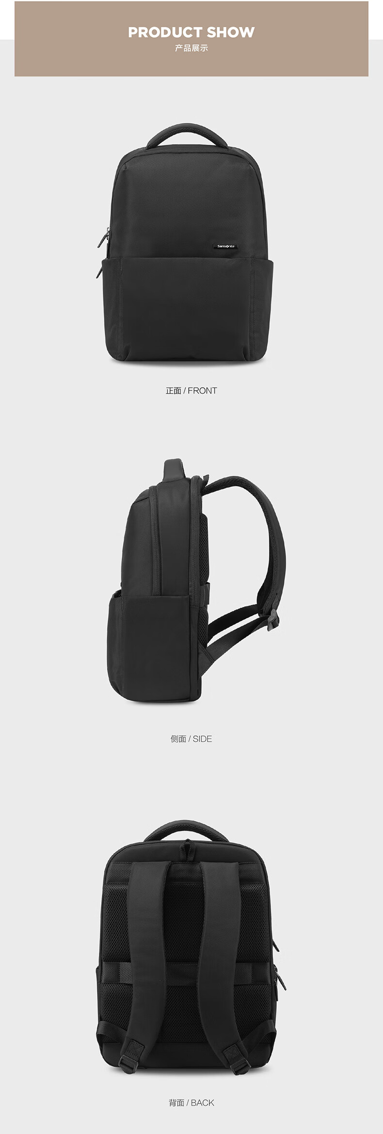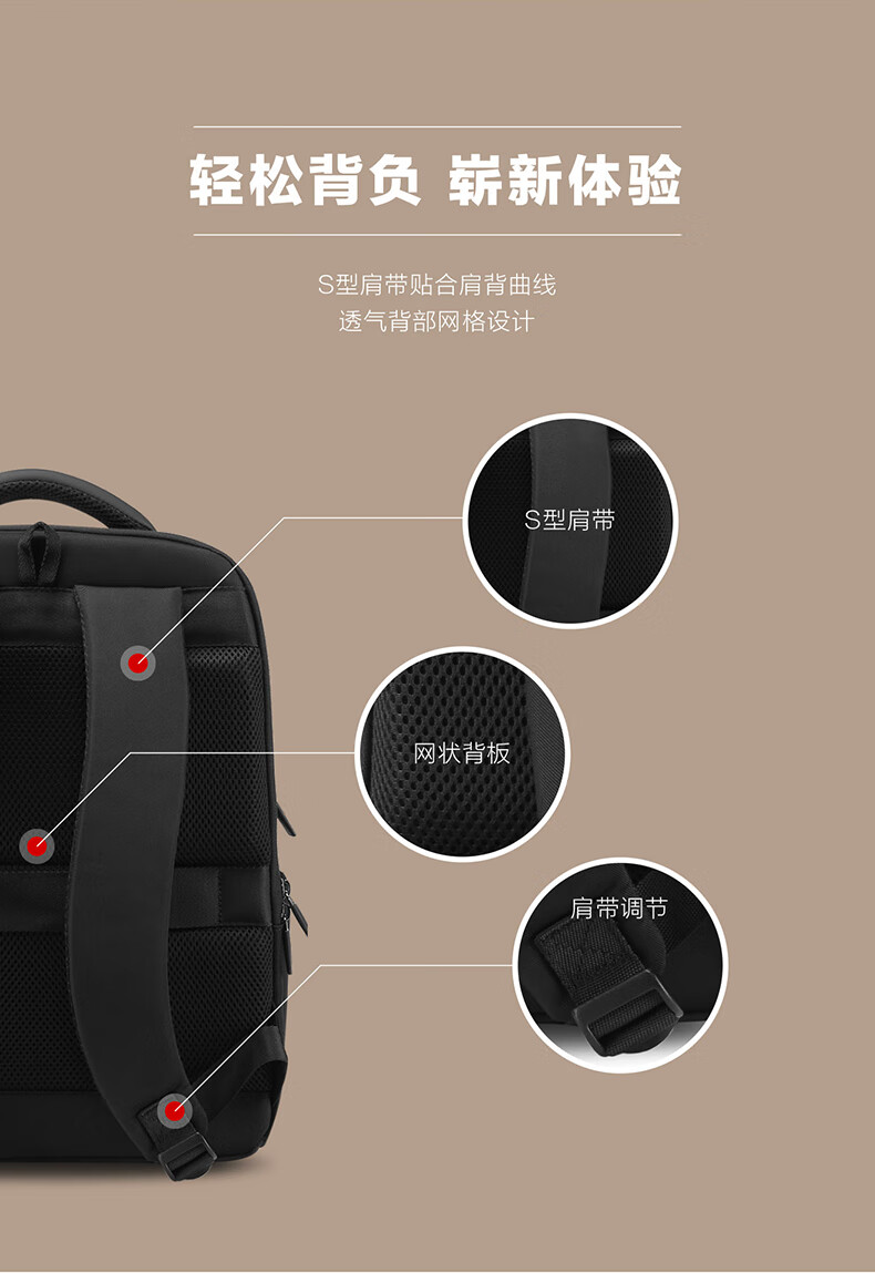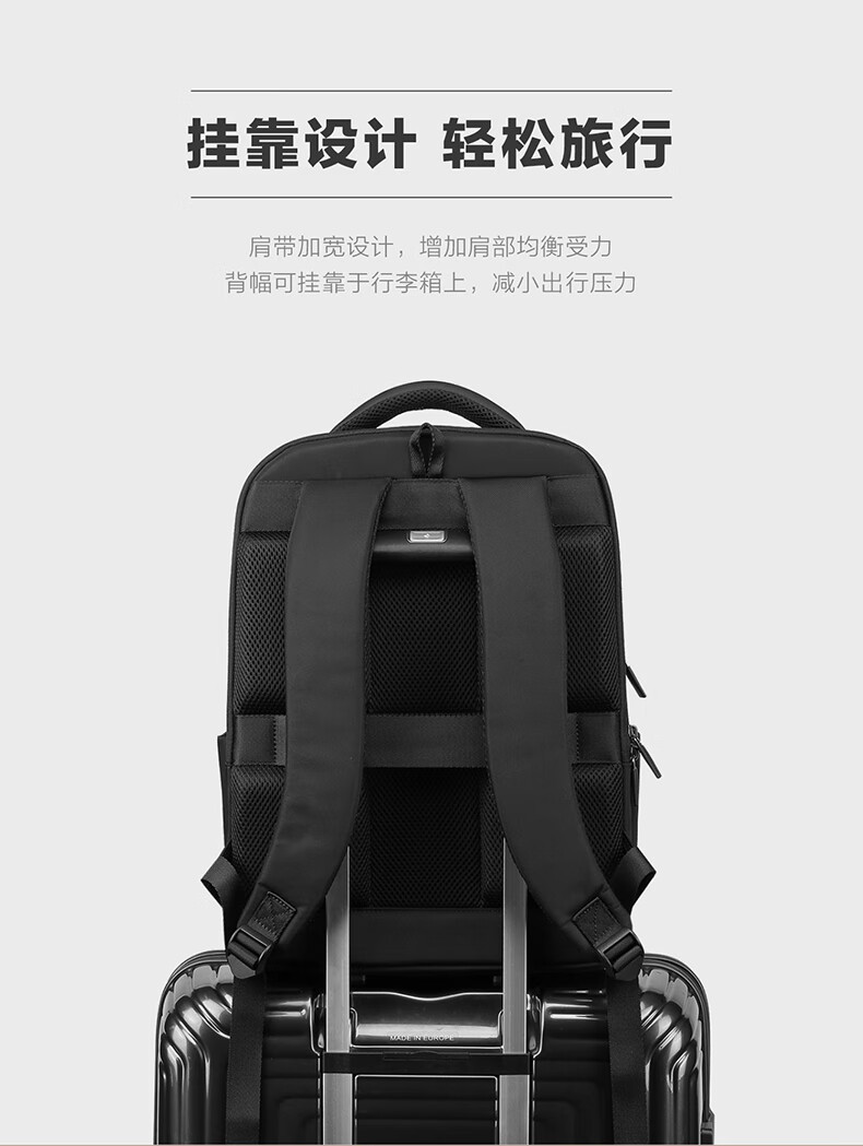 背面拉杆挂套,方便外出时同拉杆箱一起使用;大开口生活仓、平板电脑插袋、文组插袋;加厚提手,舒适减压;附织带挂环