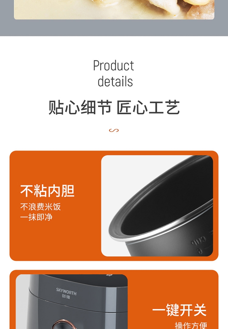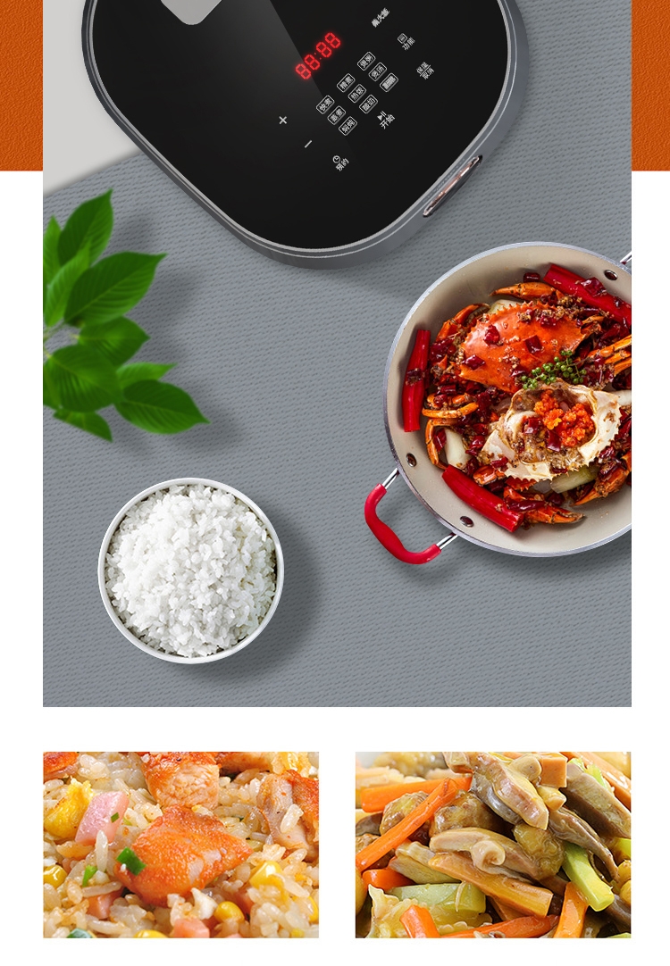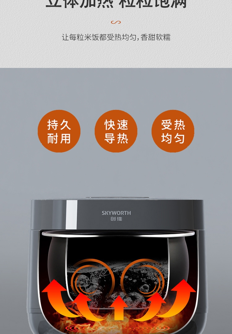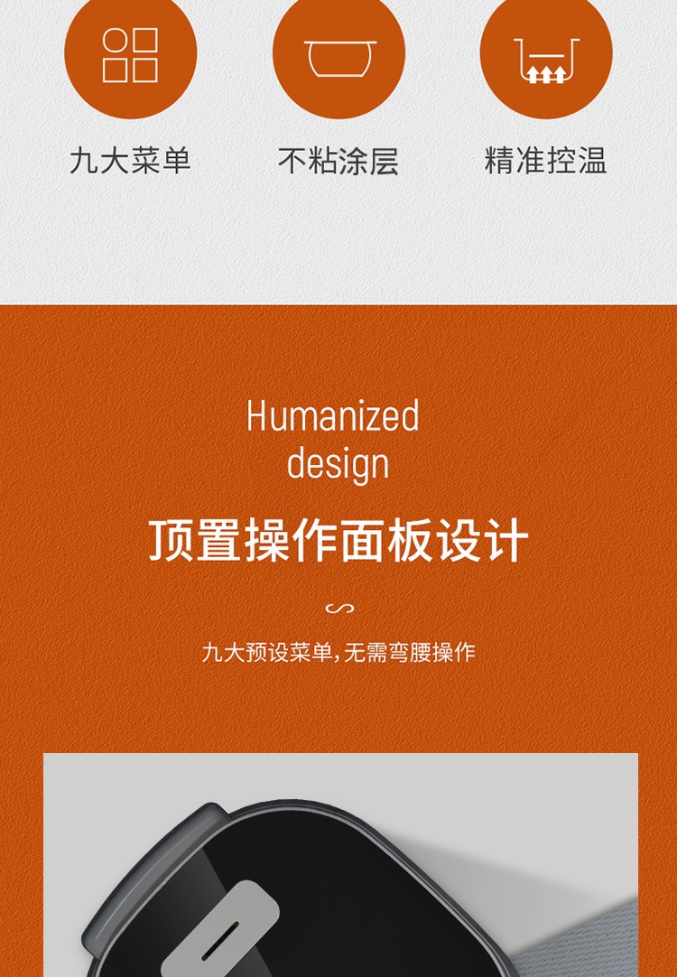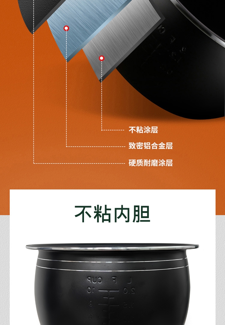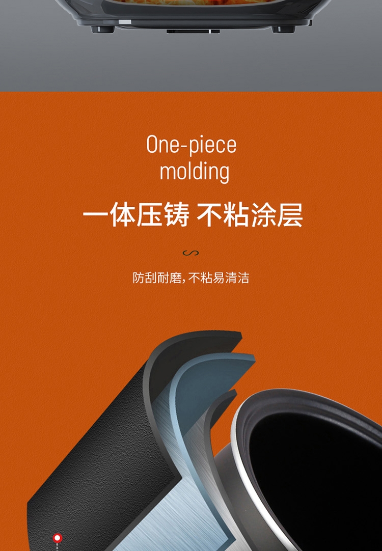 一体压铸、不粘球釜、防刮耐磨、不粘易清洁;层层控温、均匀火速加热,360度循环加热,充分释放;5L大容量