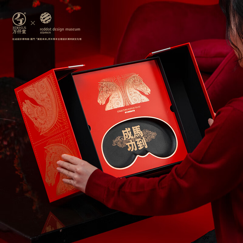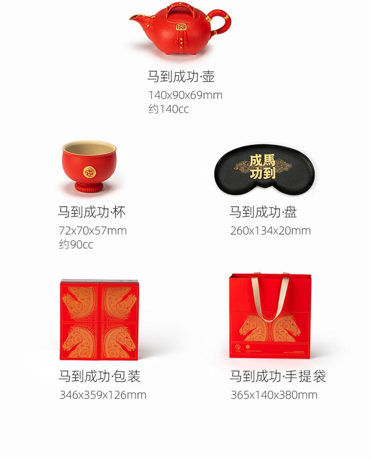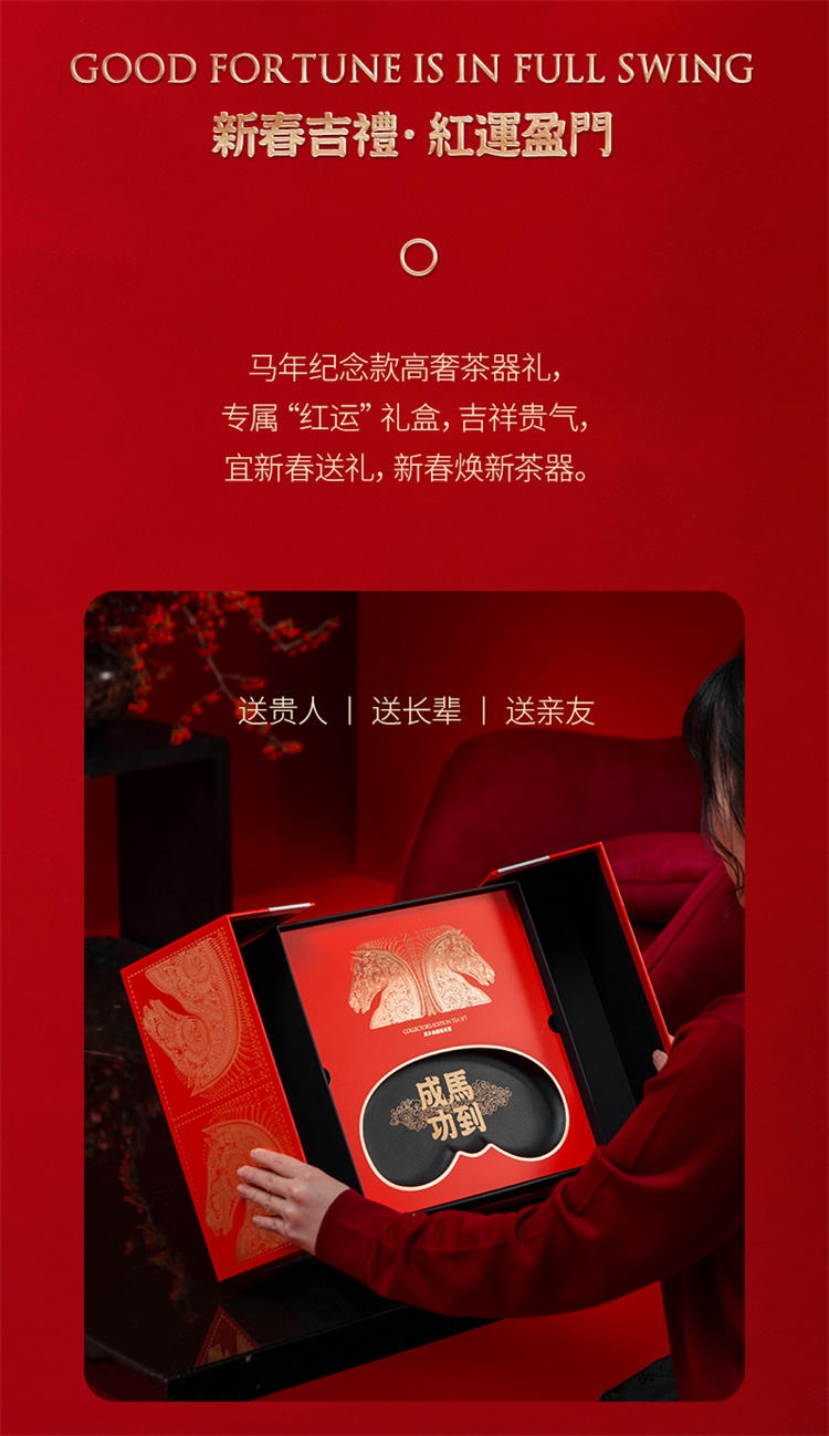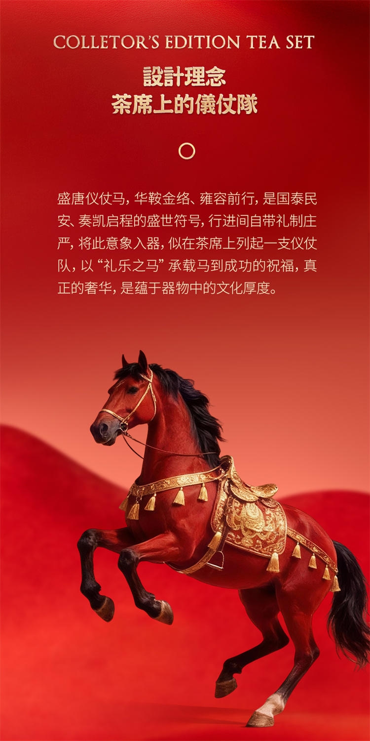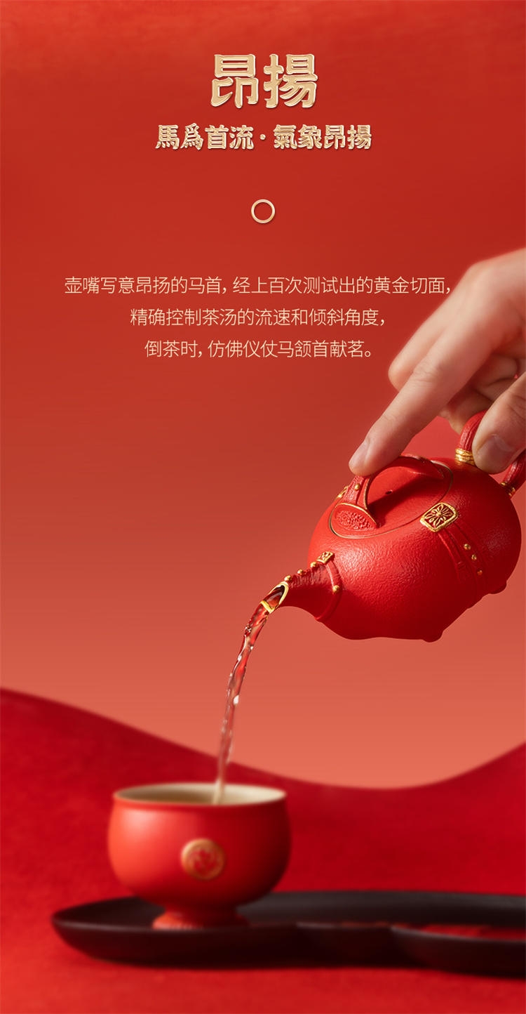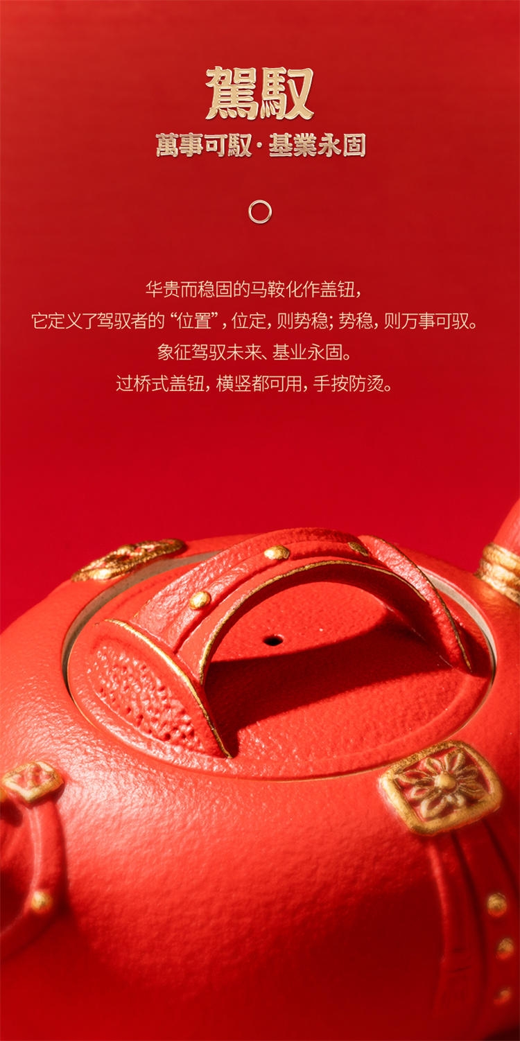 复刻唐代鎏金工艺,华彩熠熠,象征祥瑞环绕,好运连绵;马首为流,马鞍化为盖钮,束尾化作壶把;马到成功·多功能茶盘,以“马鞍”造型承载新岁吉兆