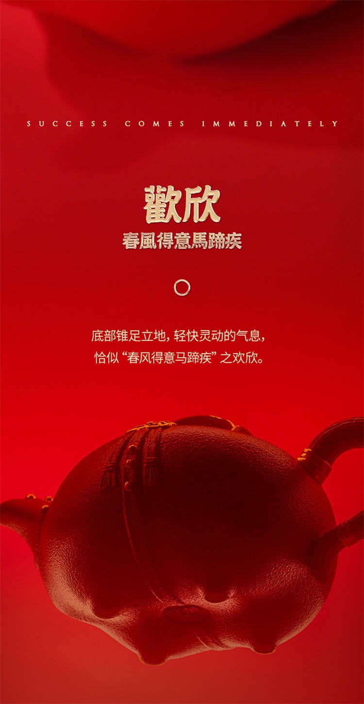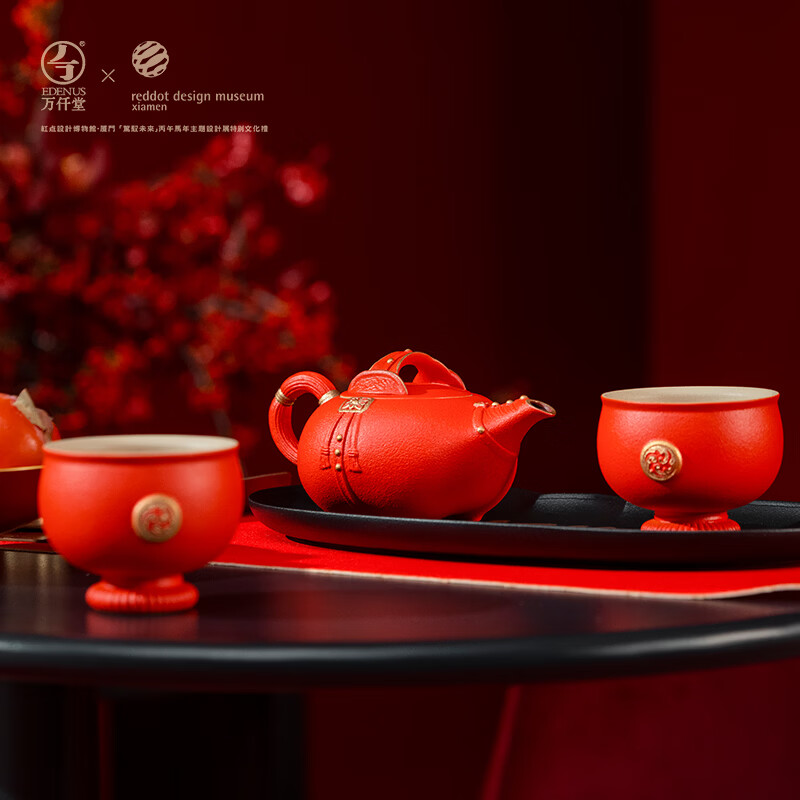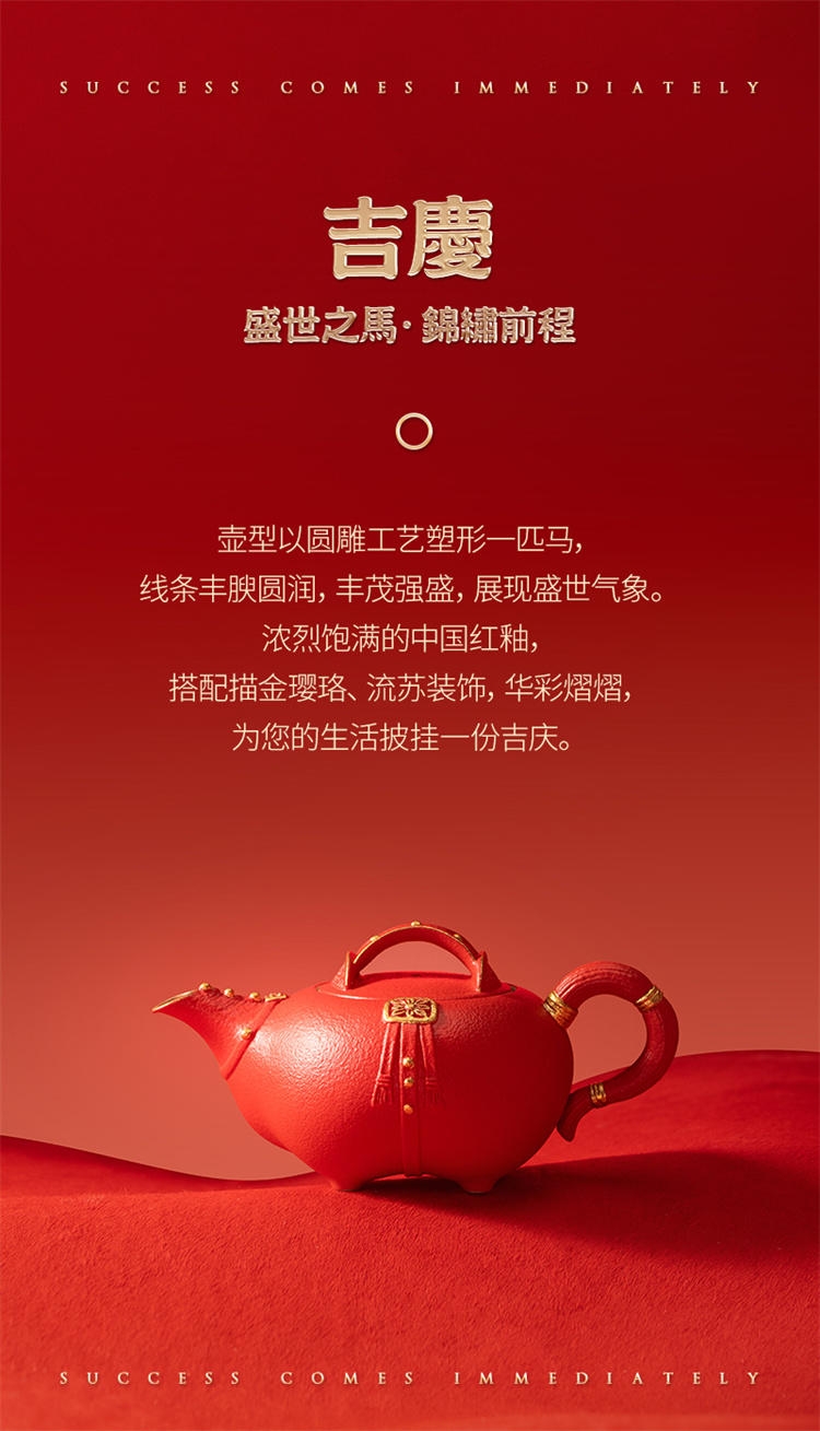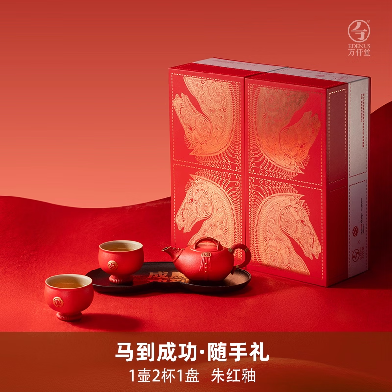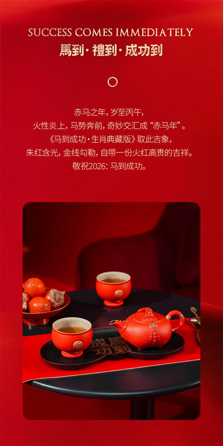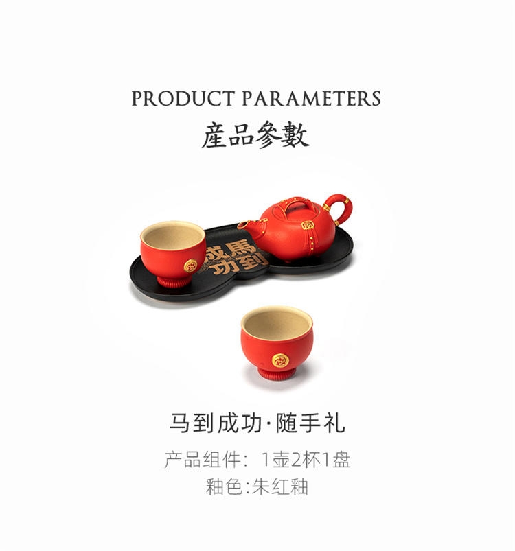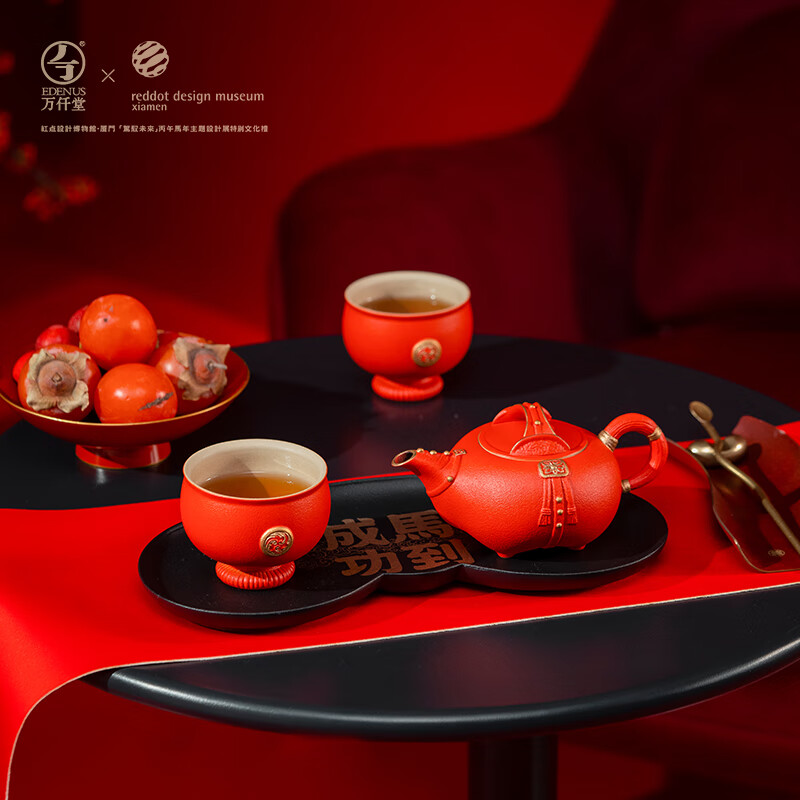 复刻唐代鎏金工艺,华彩熠熠,象征祥瑞环绕,好运连绵;马首为流,马鞍化为盖钮,束尾化作壶把;马到成功·多功能茶盘,以“马鞍”造型承载新岁吉兆
