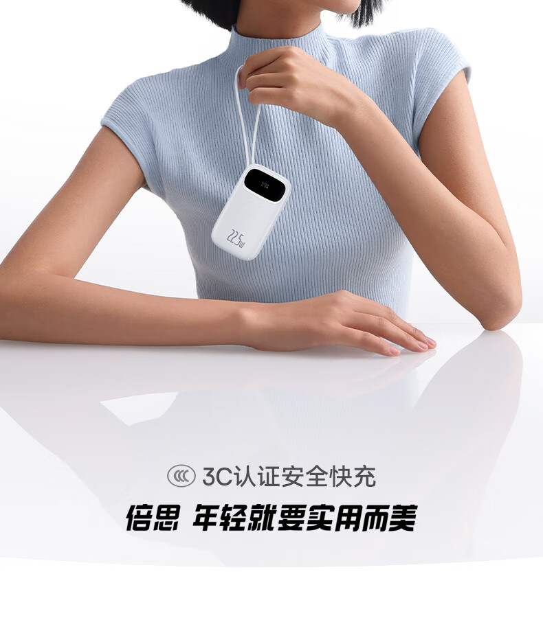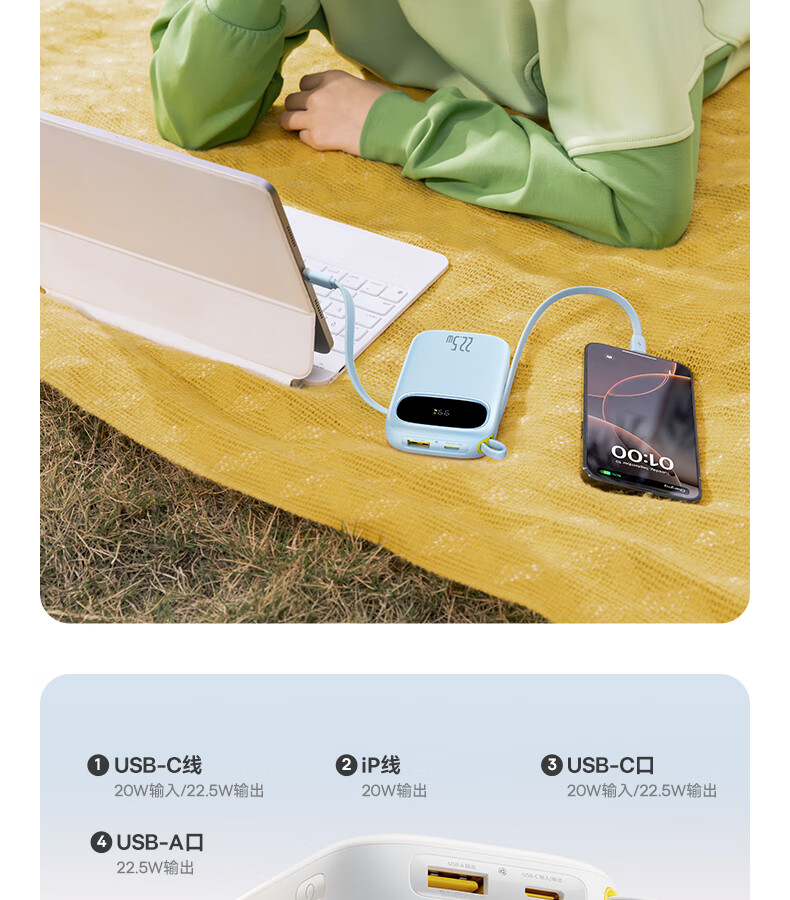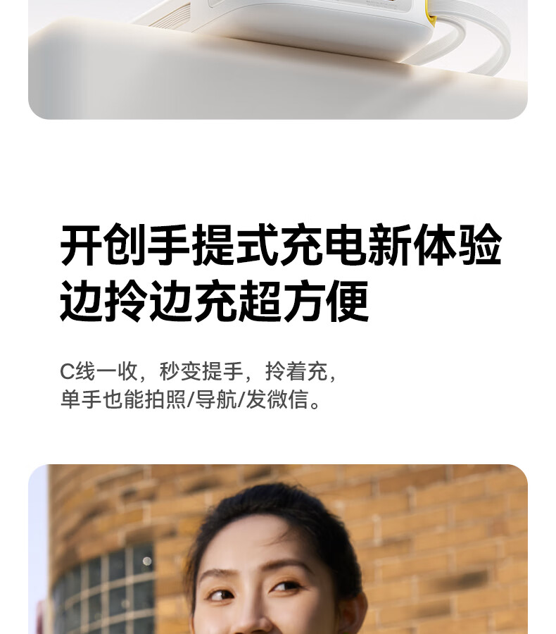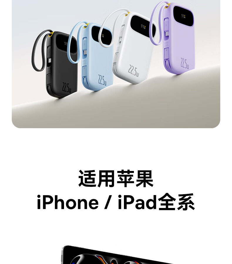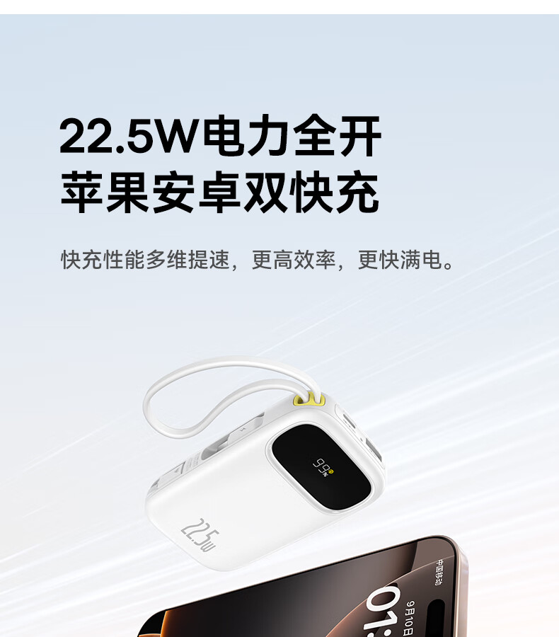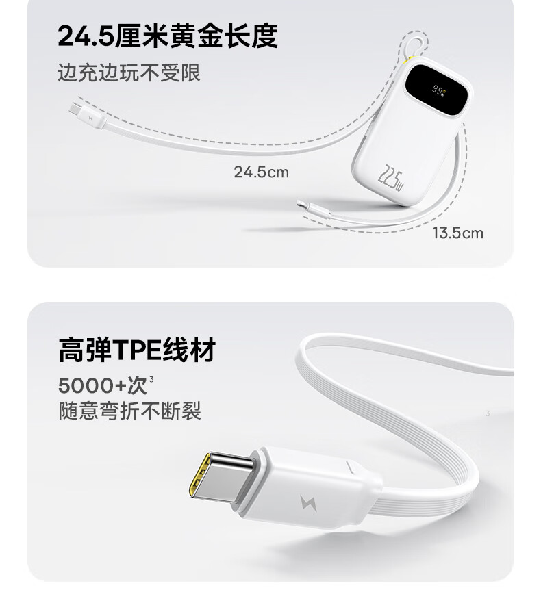 22.5W电力全开 苹果安卓双快充;开创手提式充电新体验 边拎边充超方便;高弹TPE线材5000+次 随意弯折不断裂