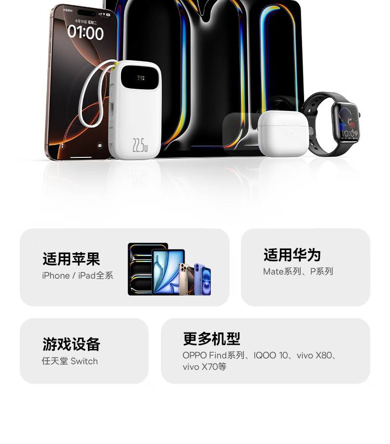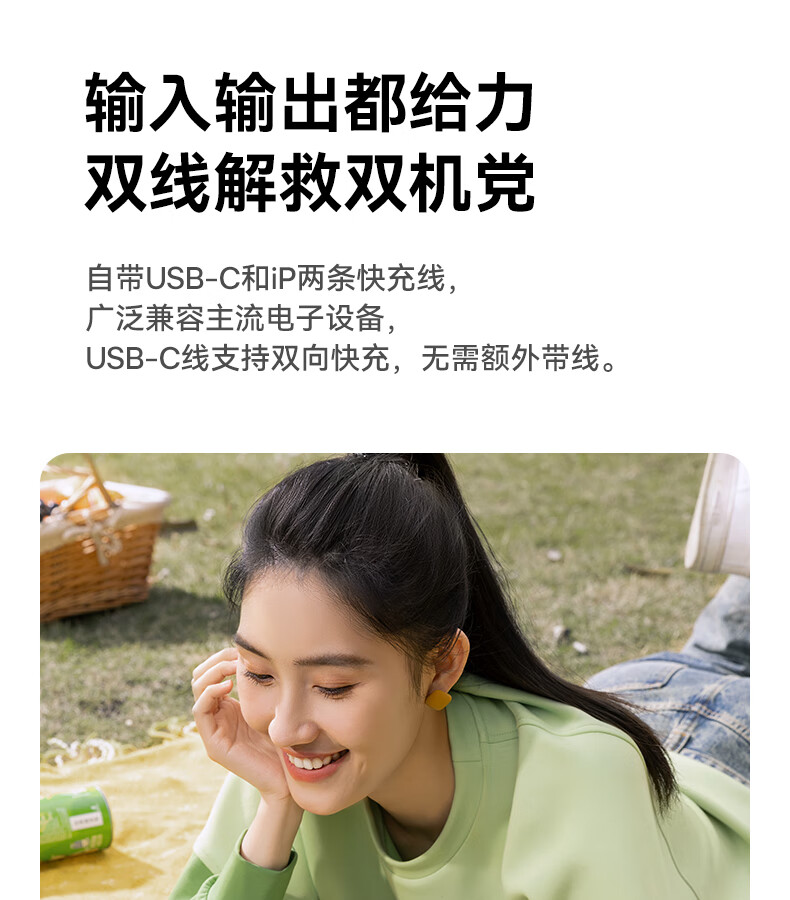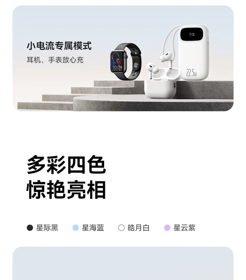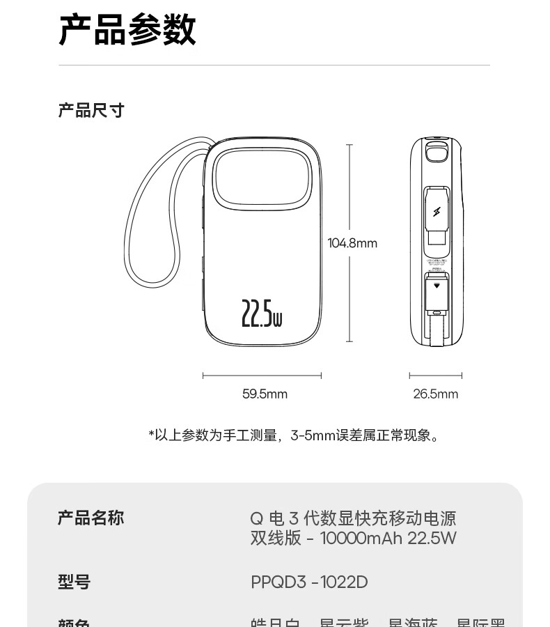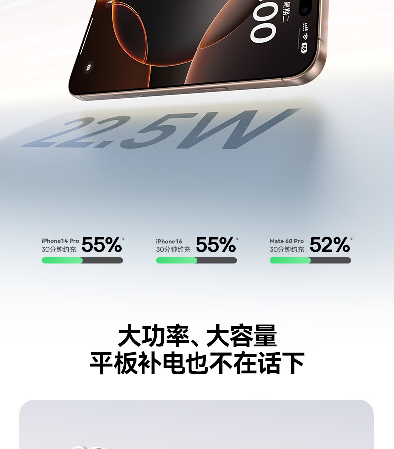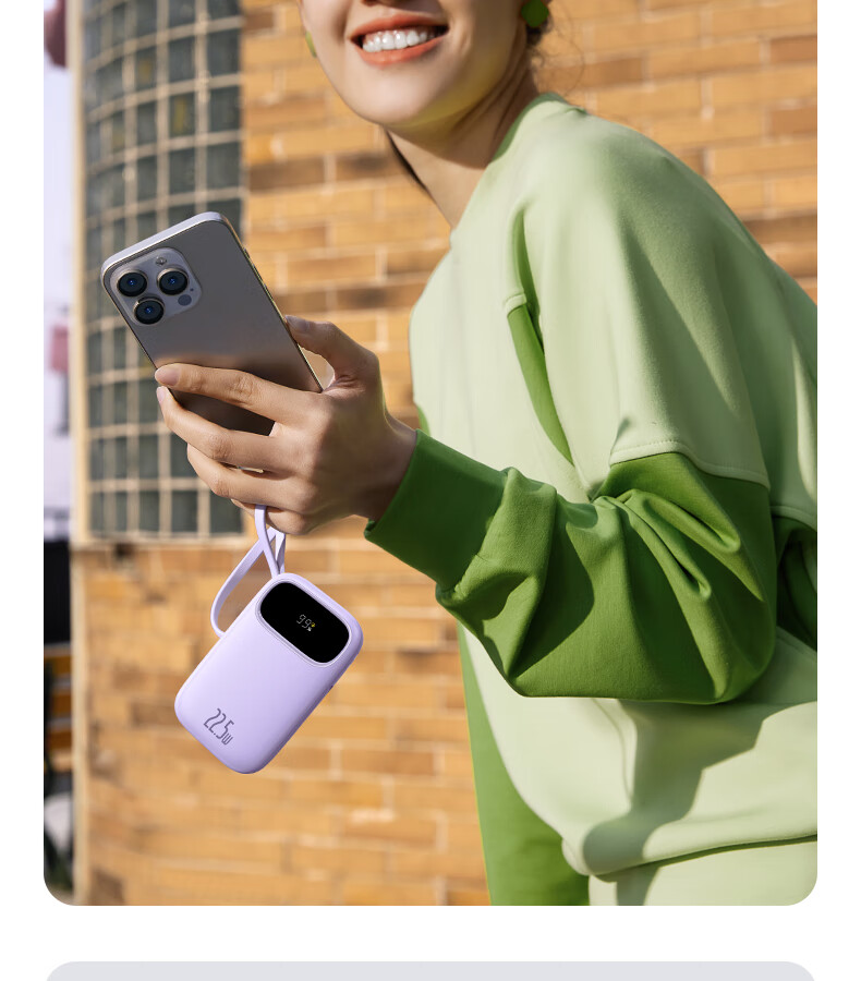 22.5W电力全开 苹果安卓双快充;开创手提式充电新体验 边拎边充超方便;高弹TPE线材5000+次 随意弯折不断裂