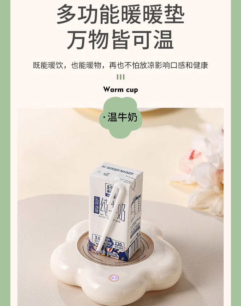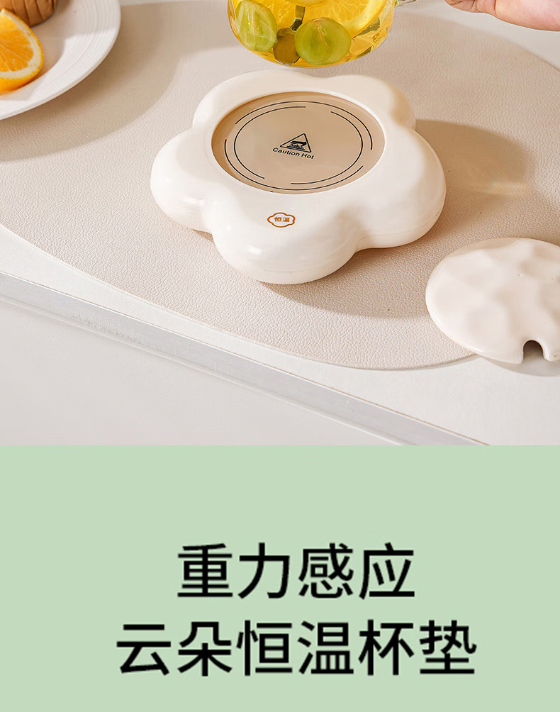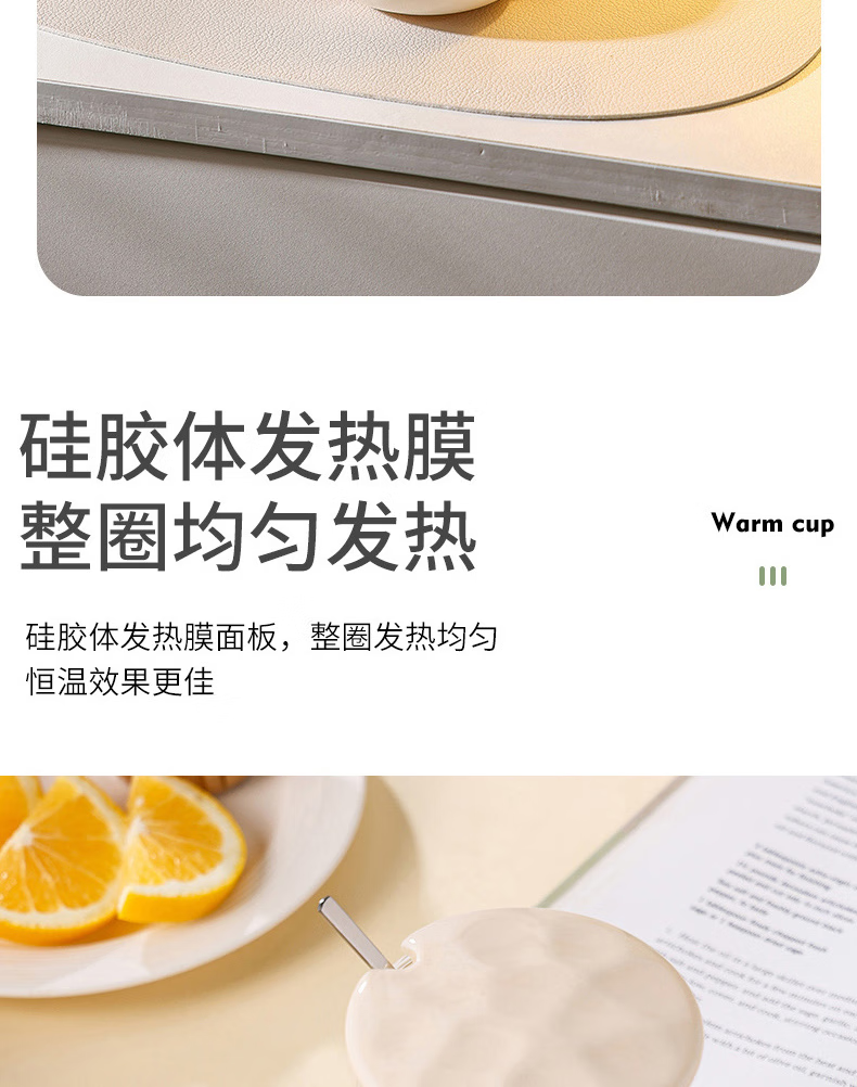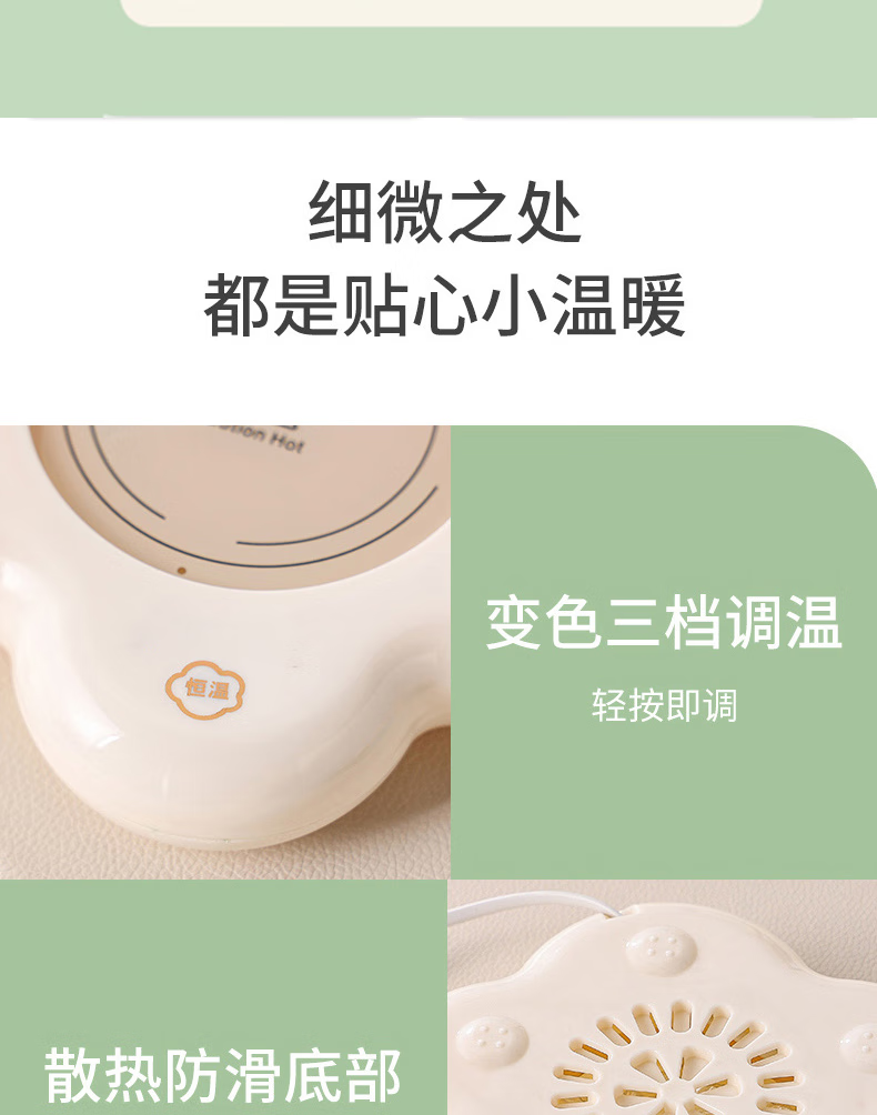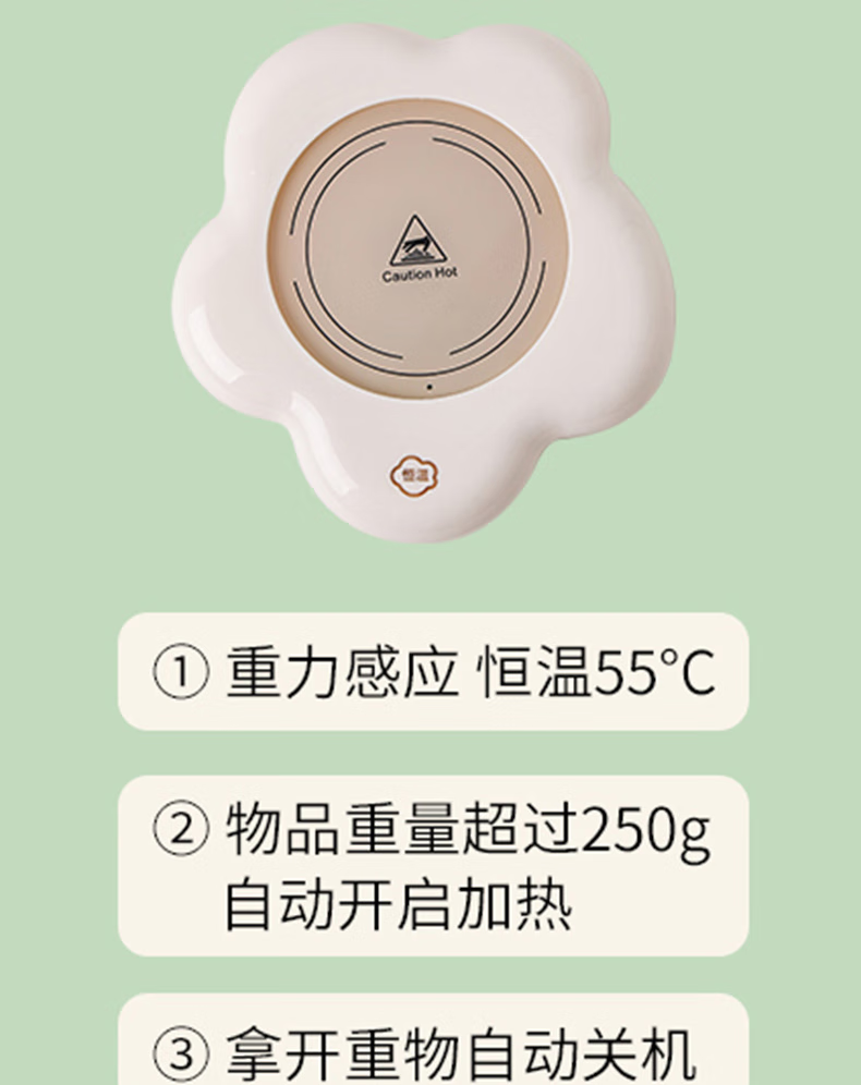55度保暖恒温,照料每个生活瞬间,暖暖的很贴心;;重力感应设计,物品超过250g自动开启,拿开自动关;硅胶体发热膜,整圈发热,恒温均匀