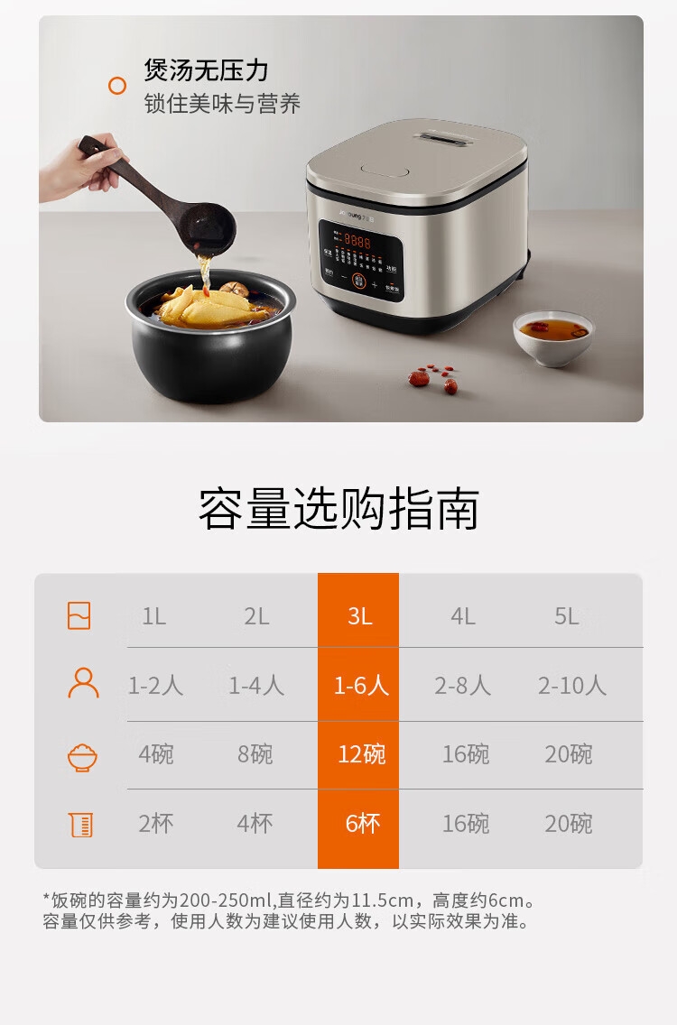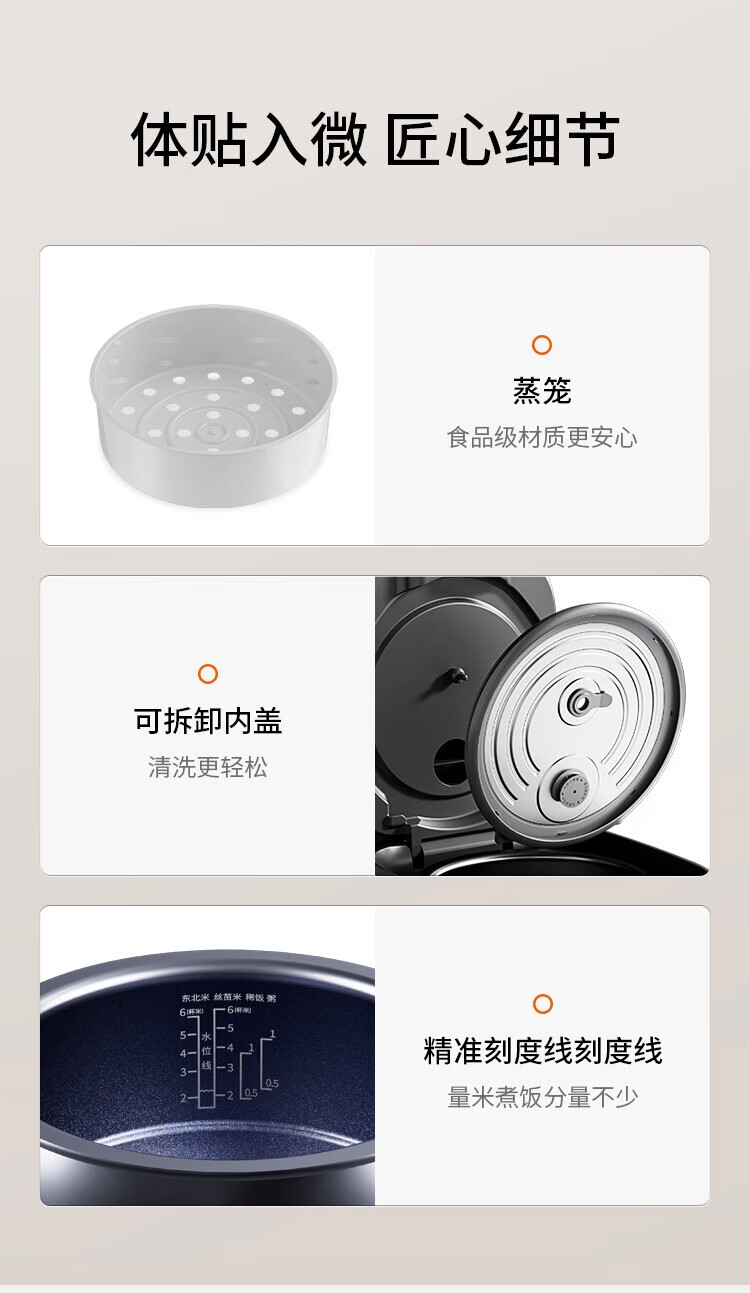 配置清单:主机、蒸笼、电源线、饭勺、量杯、说明书