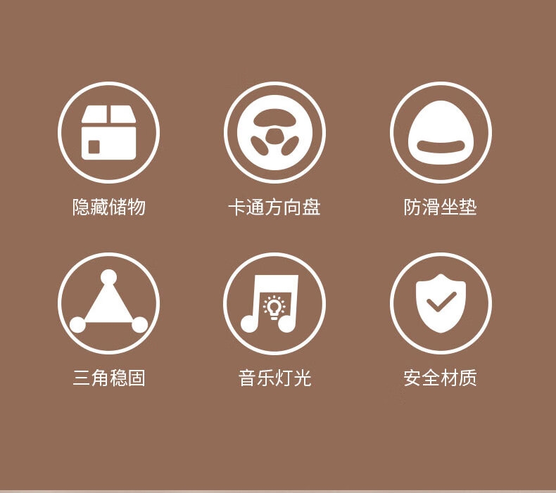 新颖颜色搭配;;多模式玩耍不局限宝宝天性;;前部炫彩音乐灯光;;重心平稳稳固不侧翻;
