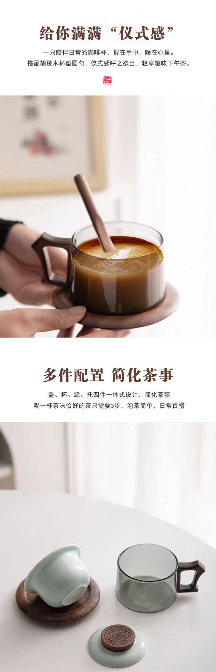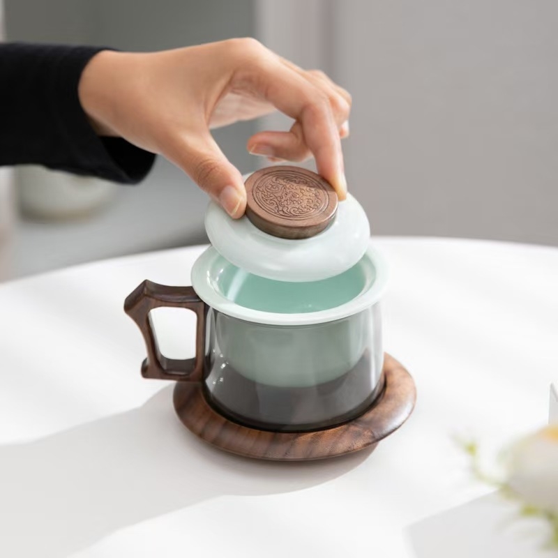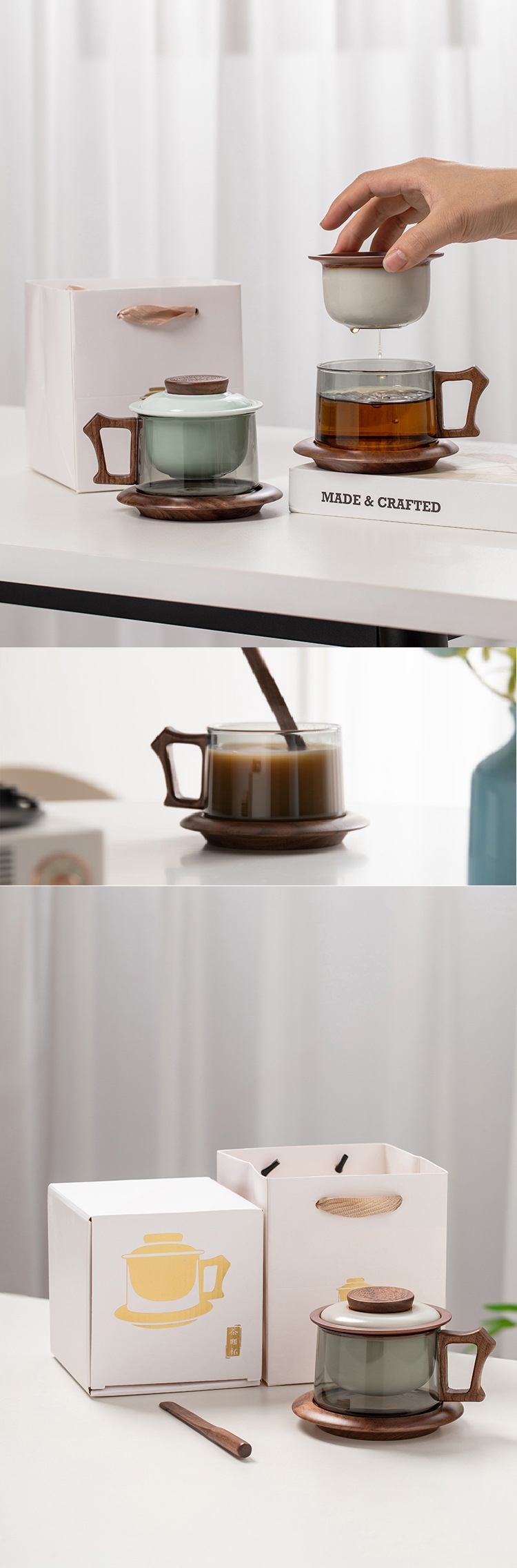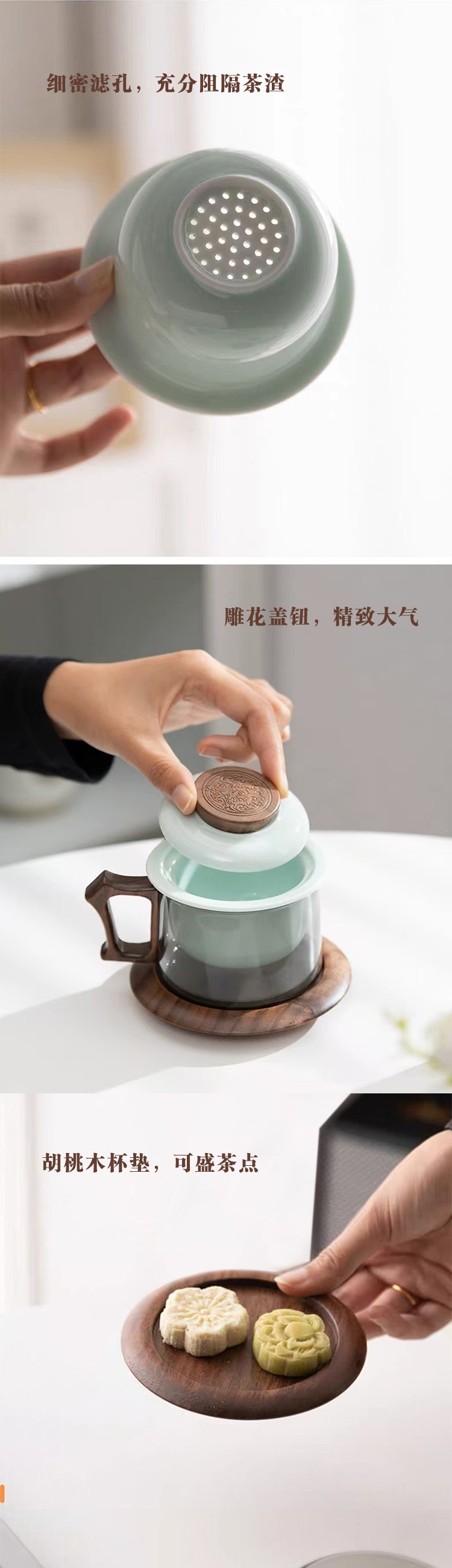 年会礼品佳选,两用办公杯,既可泡茶、又可做咖啡杯;采用上等天青汝瓷,胡桃木雕刻祥云纹理木盖;底碟中间卡槽设计,防止杯子晃动。食品级高硼硅玻璃,