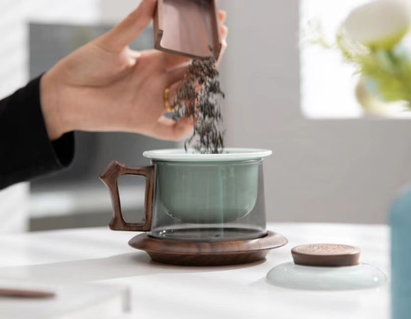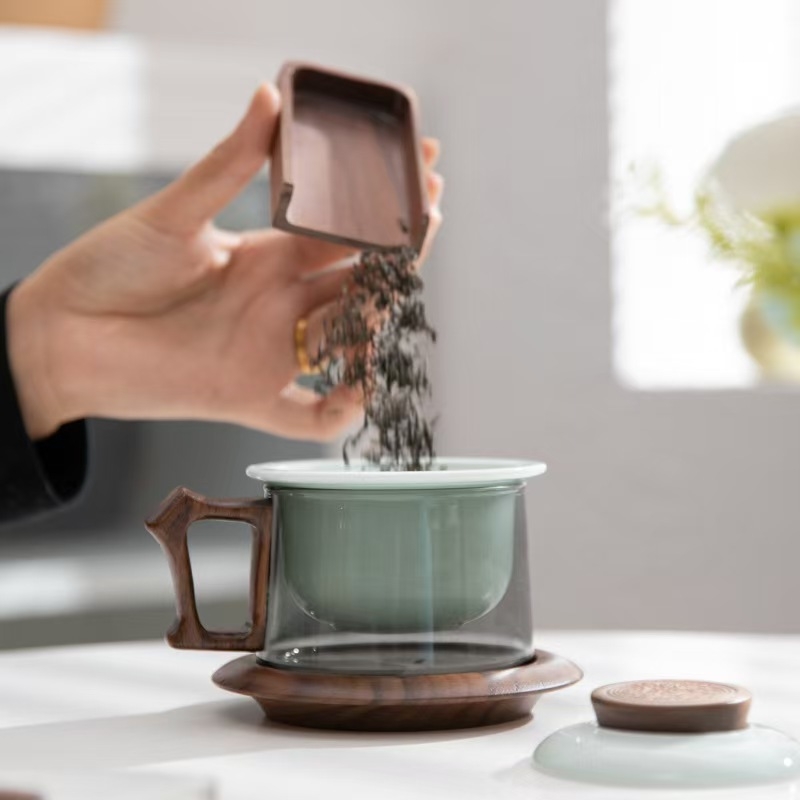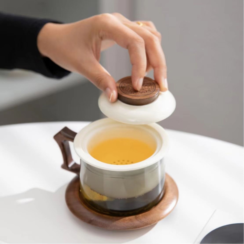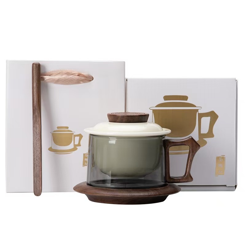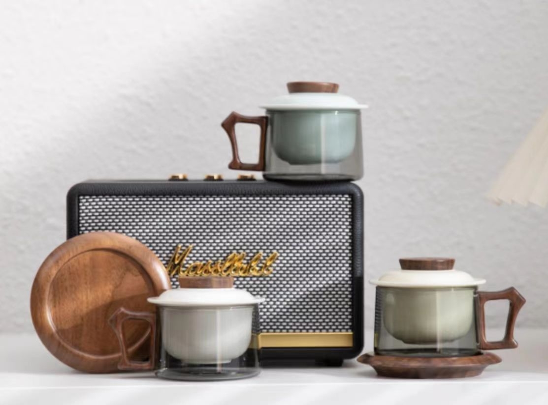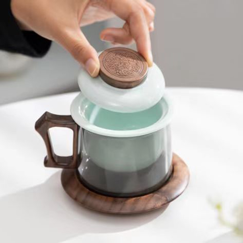 年会礼品佳选,两用办公杯,既可泡茶、又可做咖啡杯;采用上等天青汝瓷,胡桃木雕刻祥云纹理木盖;底碟中间卡槽设计,防止杯子晃动。食品级高硼硅玻璃,