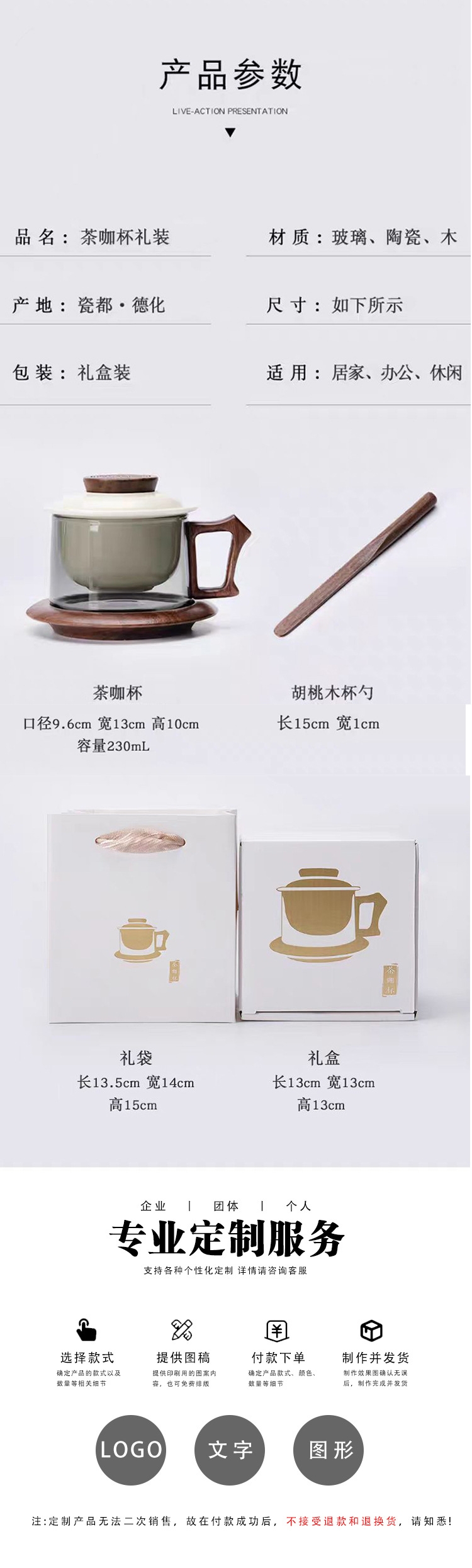 配 制:1杯 1盖 1茶漏 1木碟 1木勺 1礼盒手提袋