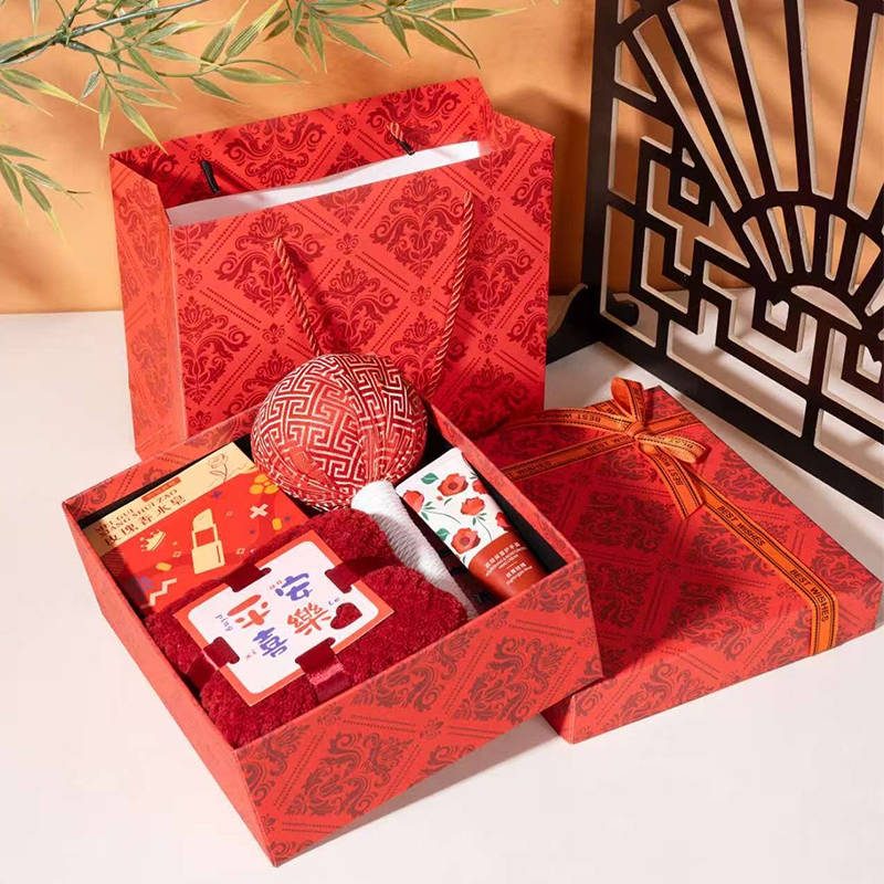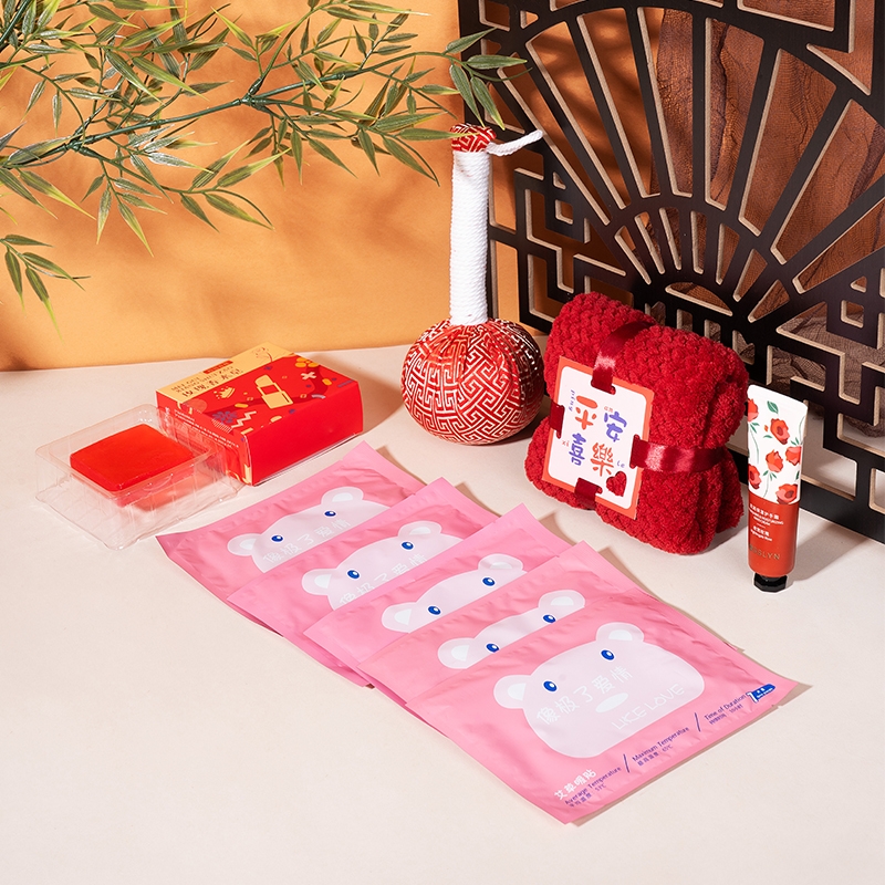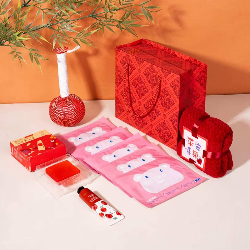 配置清单:金丝缎面红色艾草锤20cm*1 玫瑰香水皂60g*1块、国潮红平安喜乐毛巾*1 艾草暖贴*5包、夜莺玫瑰护手霜*1支、天地盖精品礼盒*1 、精美手提袋*1