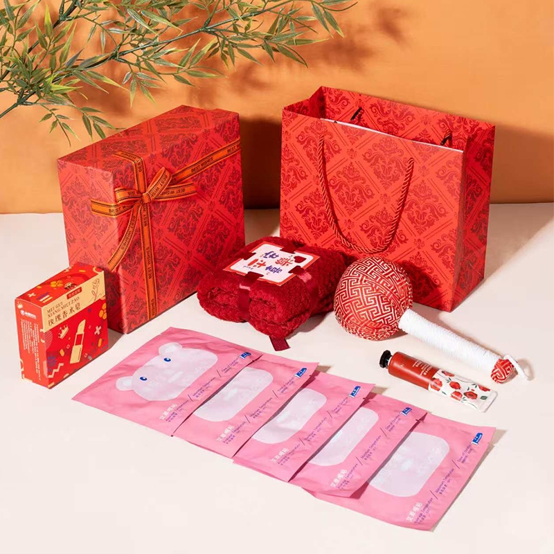 中国红喜庆国潮风礼盒,搭配同风格手提袋,高端大气;红色金丝缎面艾草锤,喜庆吉祥,锤出安康;小熊艾草暖贴,温暖呵护,全身可用