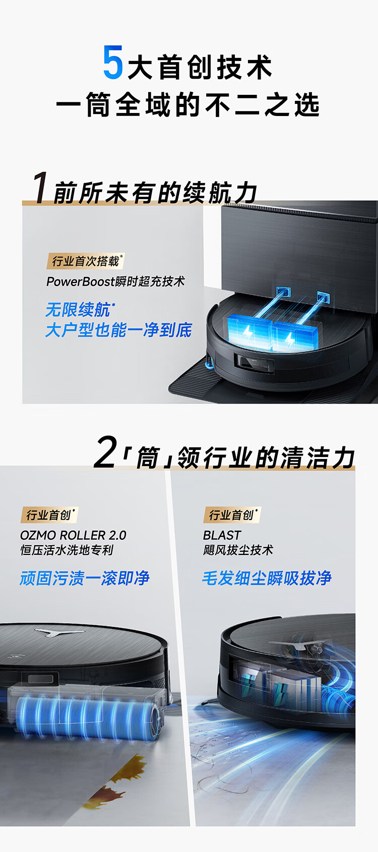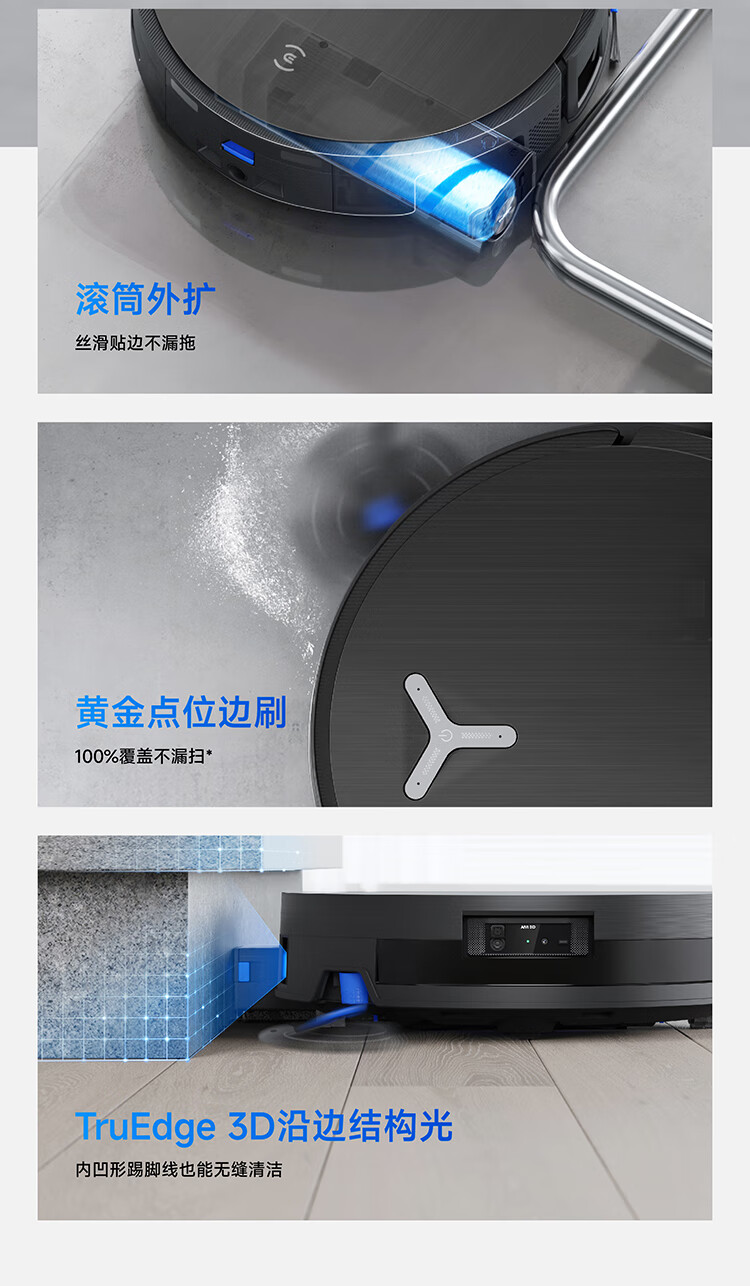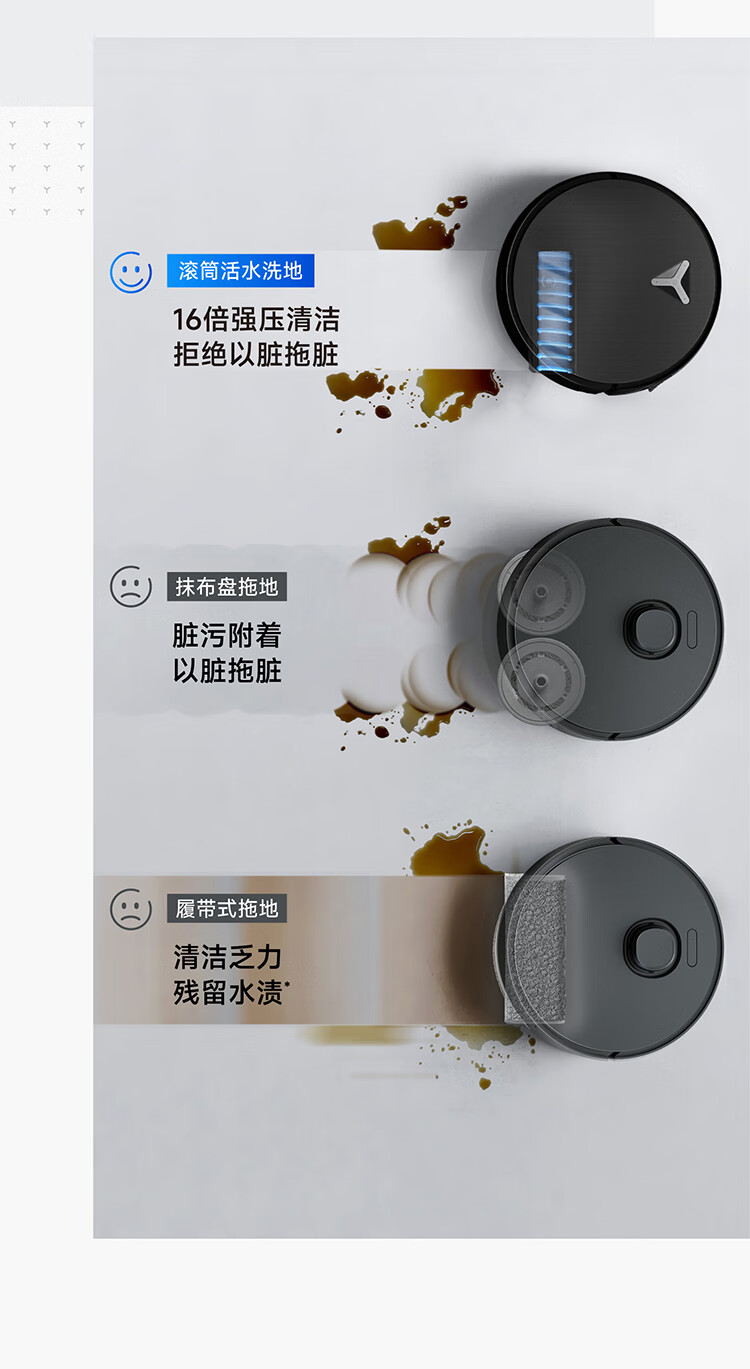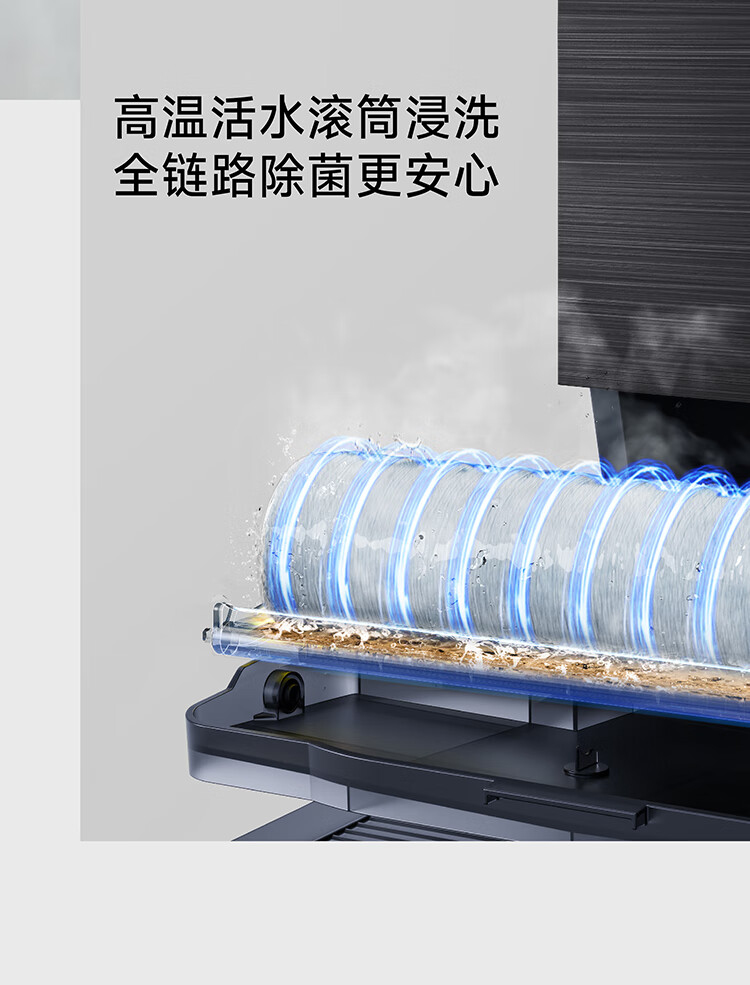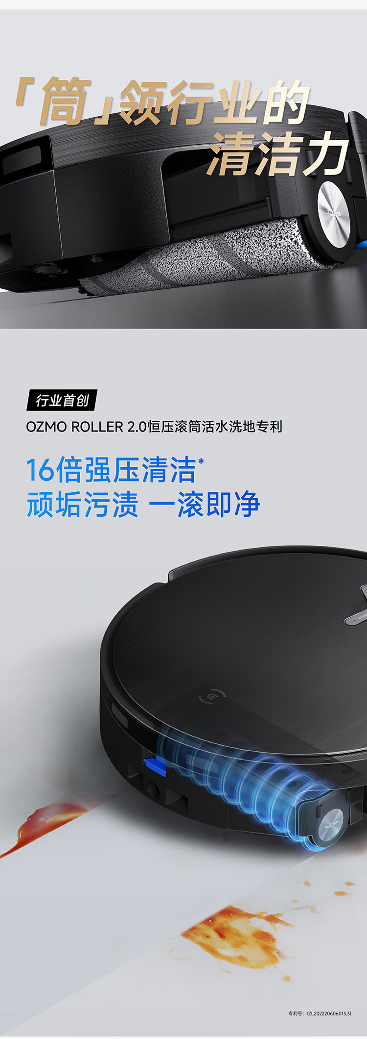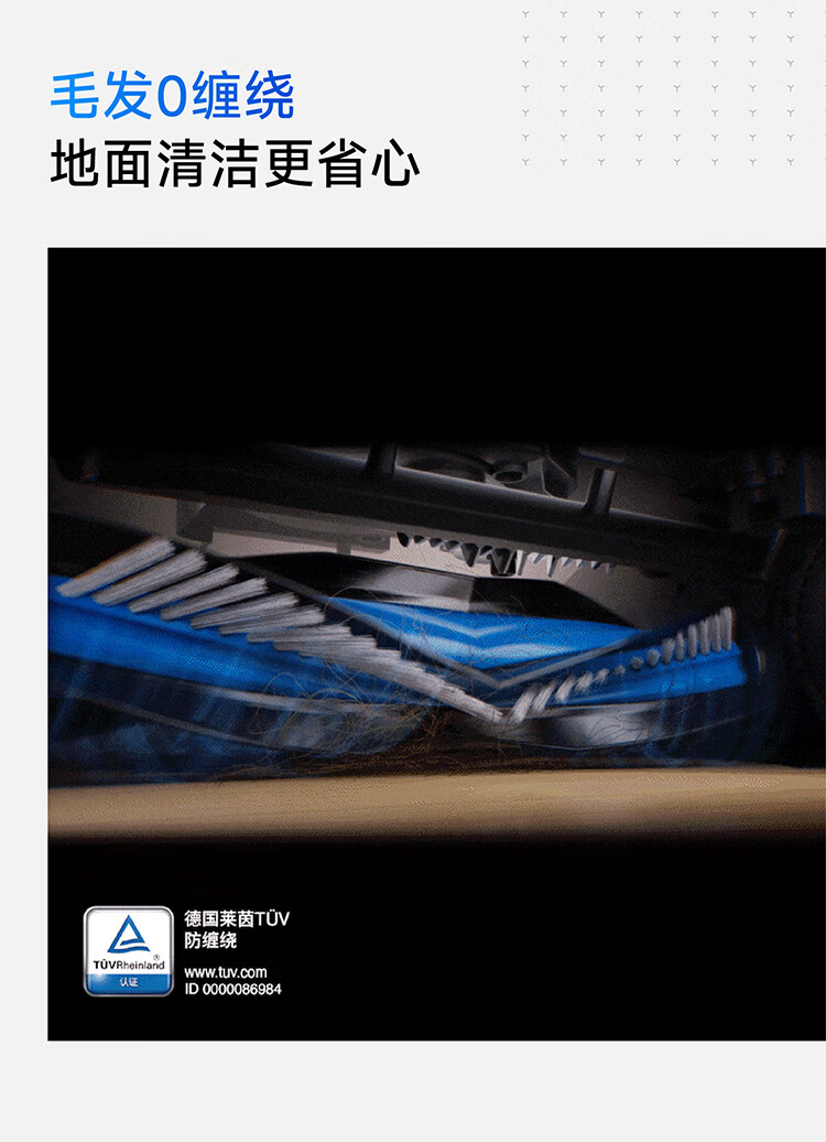 顽固污渍,一滚即净;毛发细尘,瞬吸拔净;无限续航,大户型也能一净到底