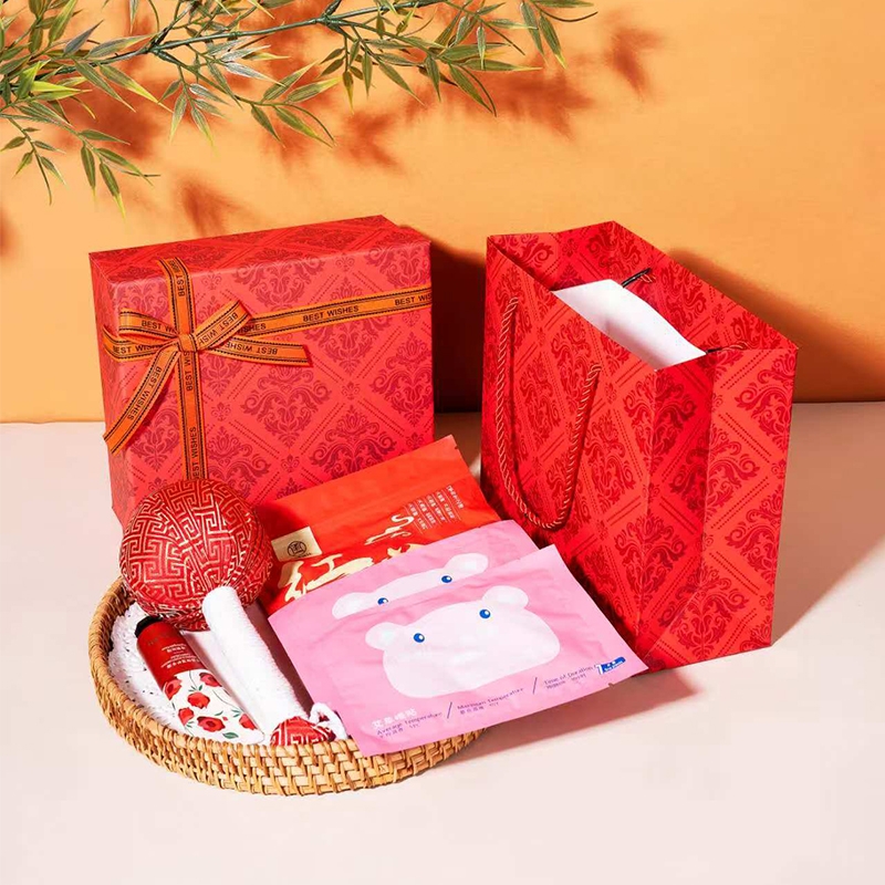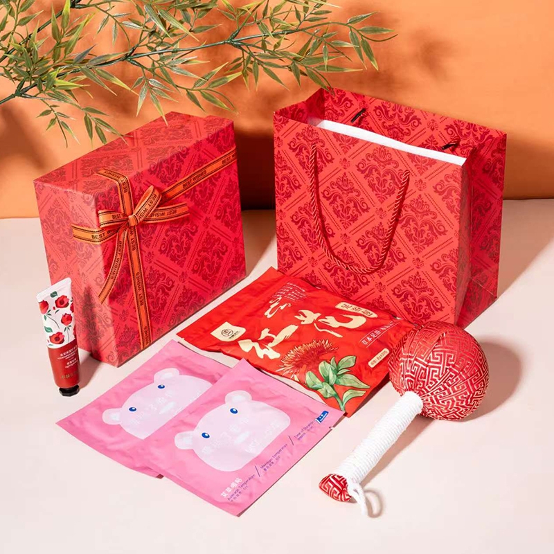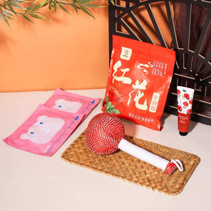 红色喜庆国潮风礼盒,搭配同风格手提袋,大气有质感;红色金丝缎面艾草锤,喜庆吉祥;红足浴包,祛湿排寒;小熊艾草暖贴,温暖呵护全身
