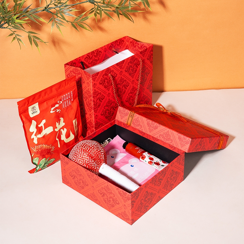配置清单:金丝缎面红色艾草锤20cm*1 红花足浴包6g*30包、 艾草暖贴*2包 夜莺玫瑰护手霜*1支、天地盖精品礼盒*1 精美手提袋*1