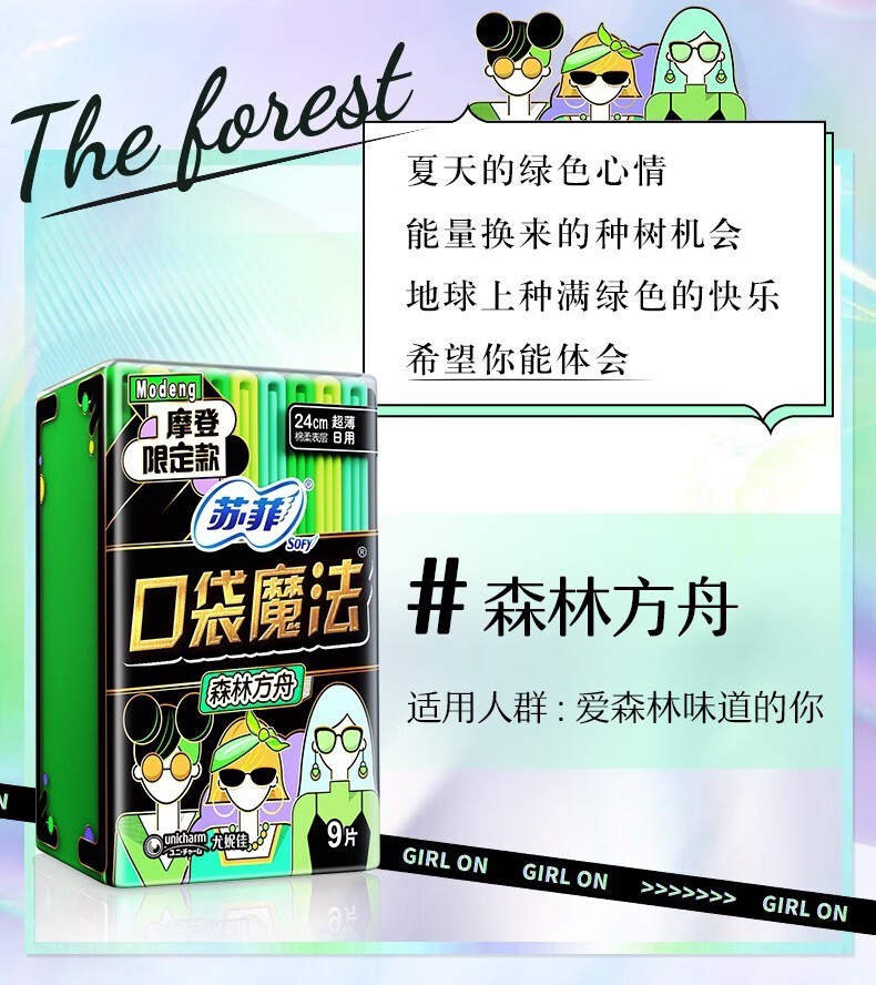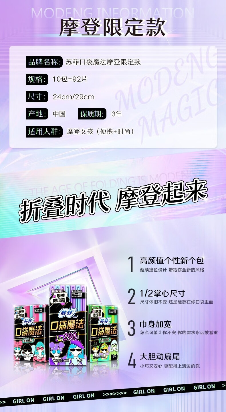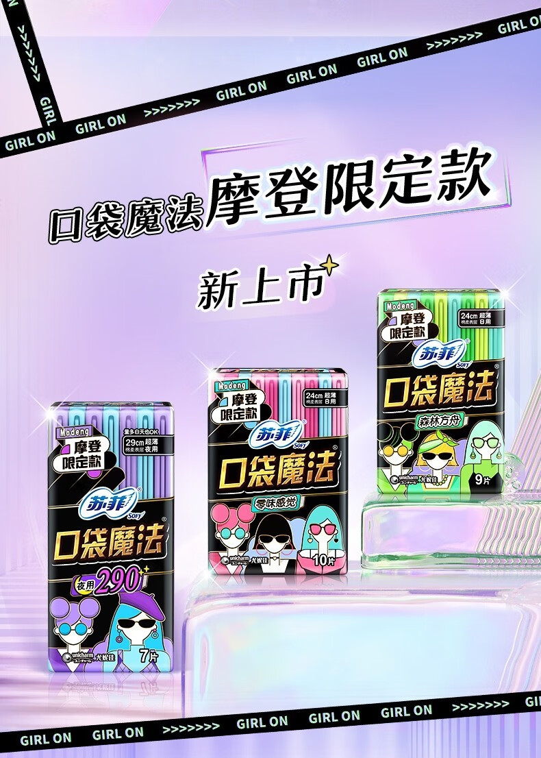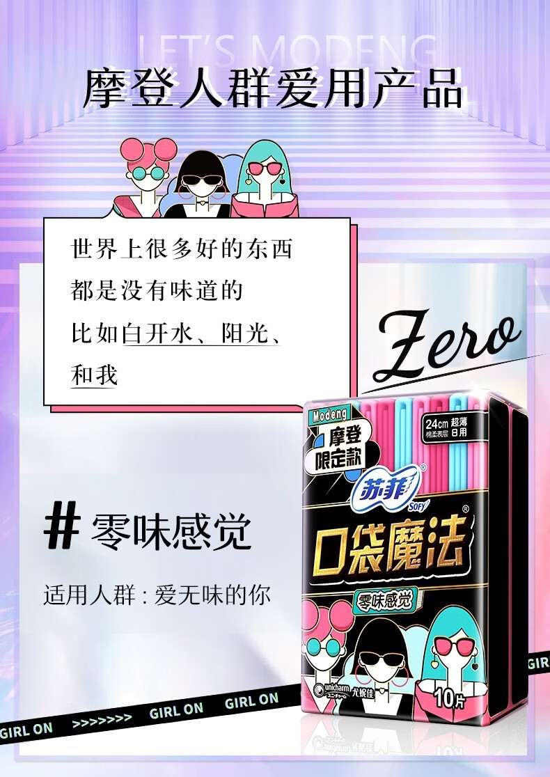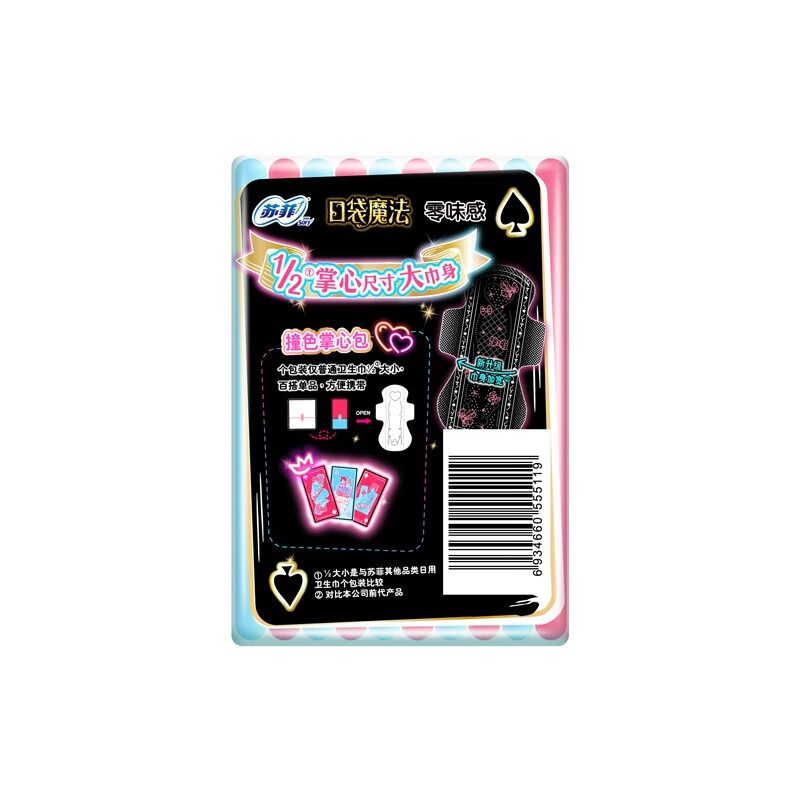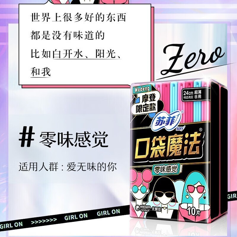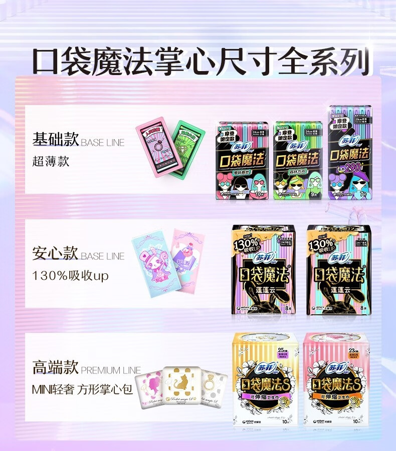 配置清单:苏菲零敏肌140丝薄柔滑无香型护垫20片 * 1 苏菲口袋魔法零味感240超薄棉柔洁翼型日用10片 * 4 苏菲口袋魔法零味感290超薄棉柔洁翼型夜用14片 * 2 苏菲超熟睡安心裤 少女型 F(均码)2片 * 3 ABC卫生护理液200ml * 1