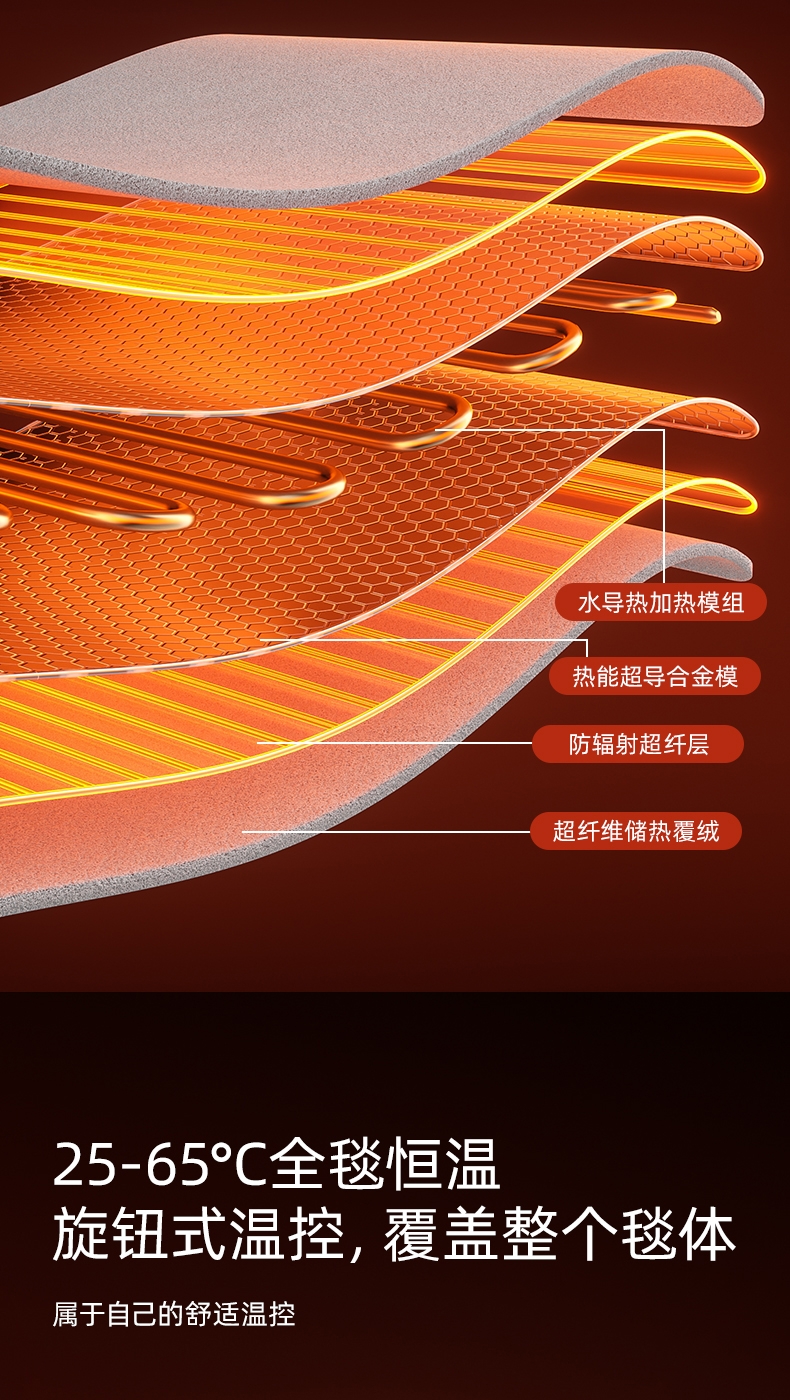 水电分离 安全不漏电;持久恒温可整晚使用,不上火!不干燥!;加厚五层锁温 温泉暖流热循环牢牢锁住毯体温度