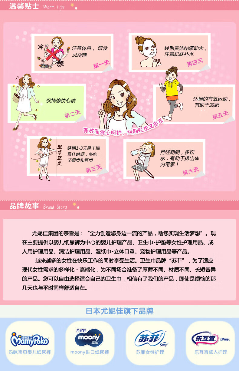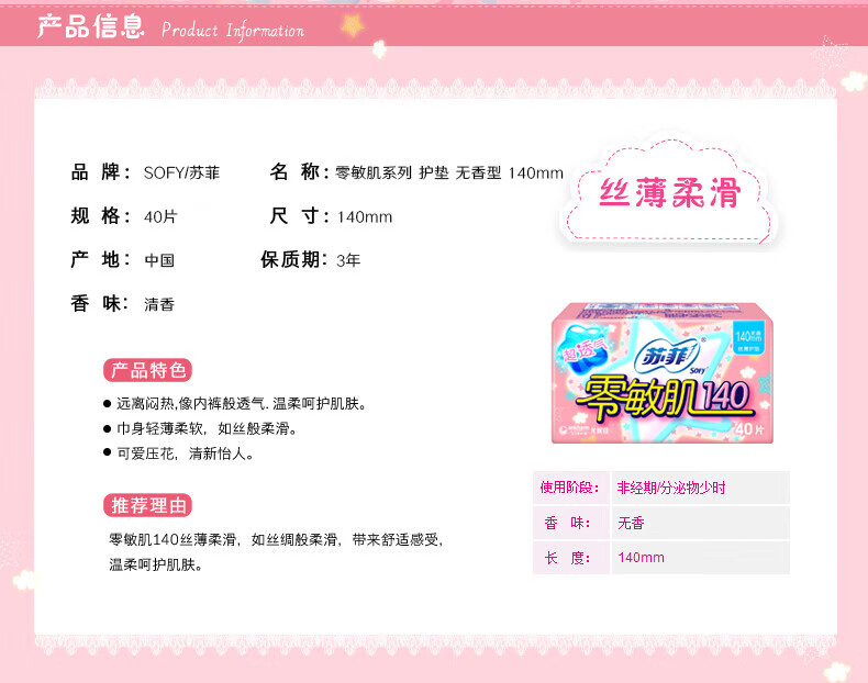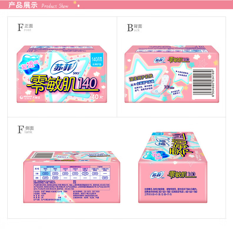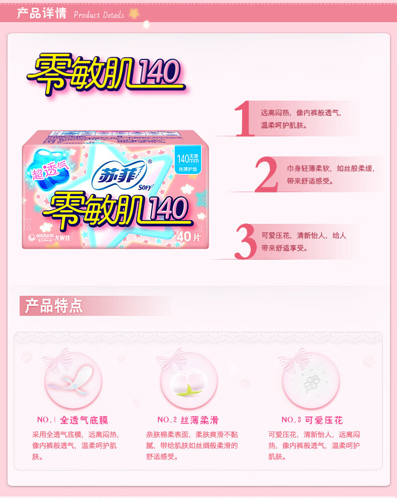 远离闷热,像内裤般透气,温柔呵护肌肤;巾身轻薄柔软,如丝般柔滑;可爱压花,清新怡人