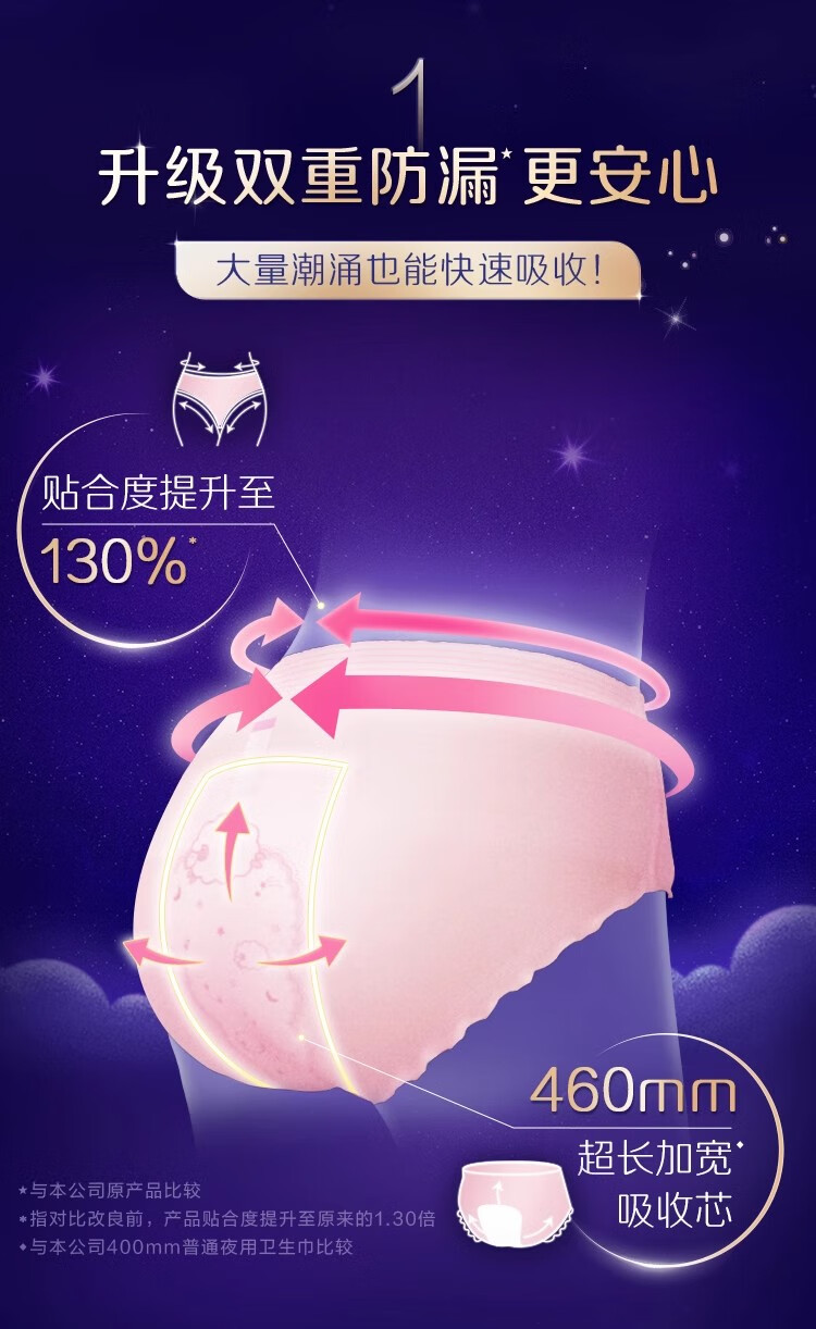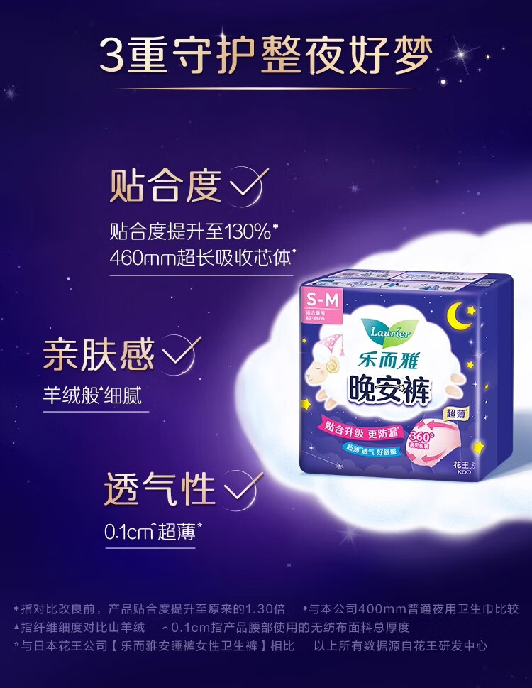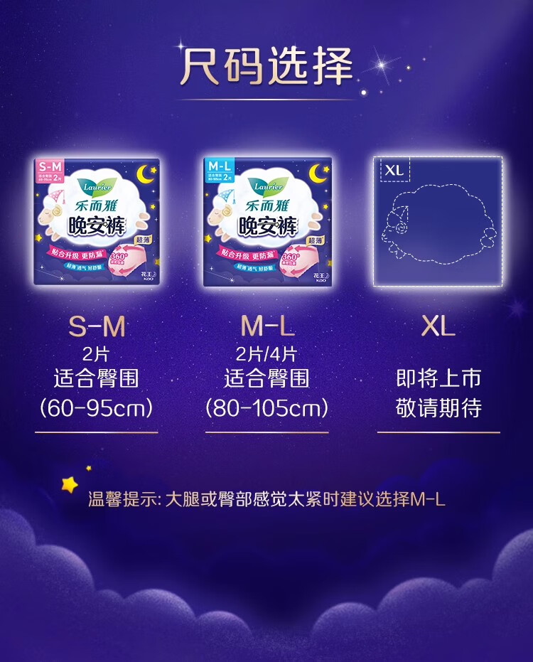 配置清单:乐而雅零触感特薄250日用 8片 * 2 乐而雅超瞬吸纤巧棉柔350夜用 8片 * 2 乐而雅超瞬吸舒睡棉柔400夜用 8片 * 1 乐而雅晚安裤2片(M-L码) * 4 ABC抑菌护理液(草本护理配方)80ml * 1