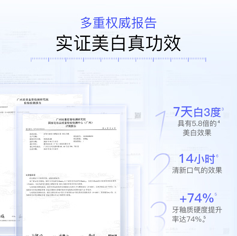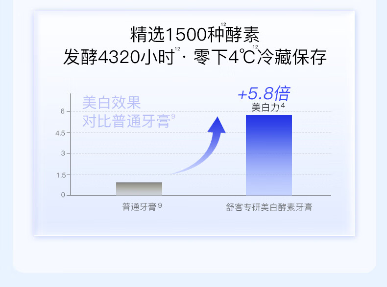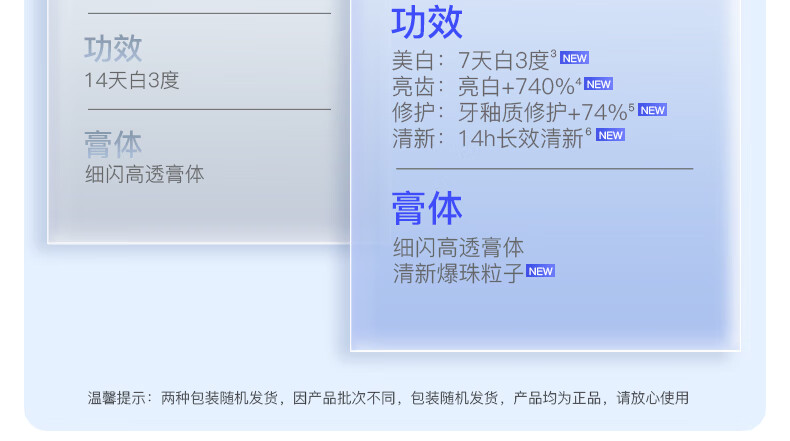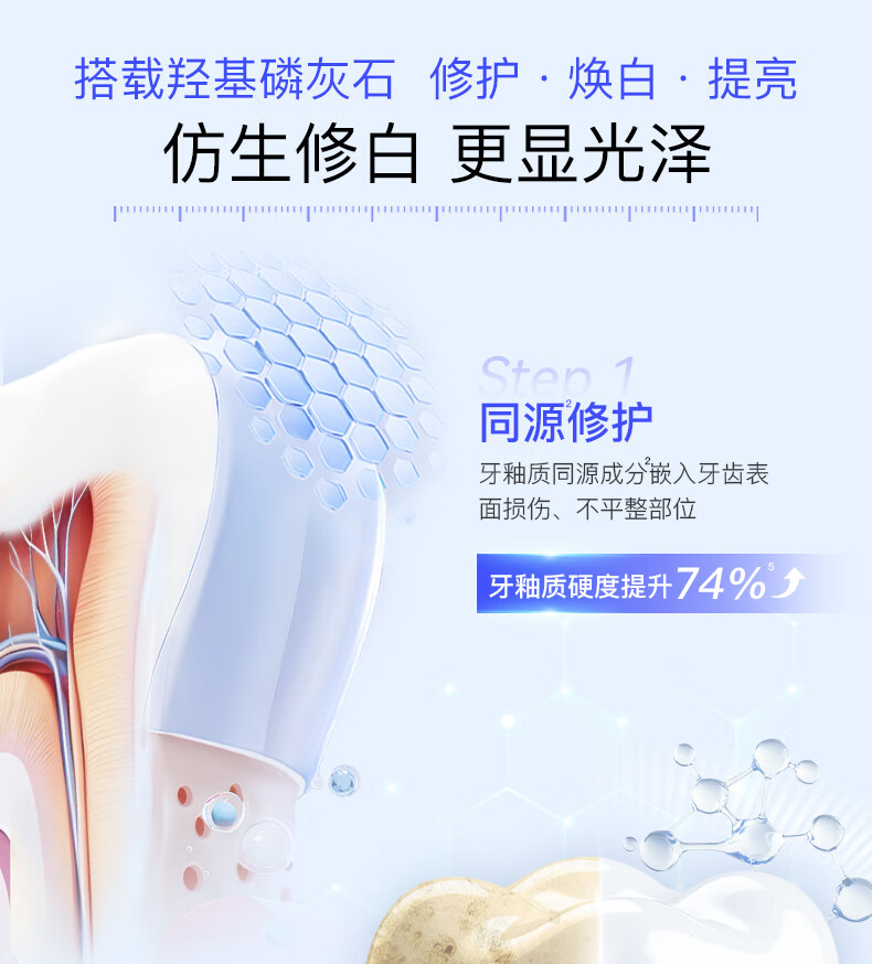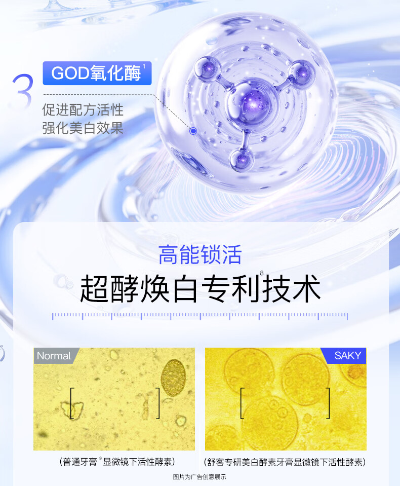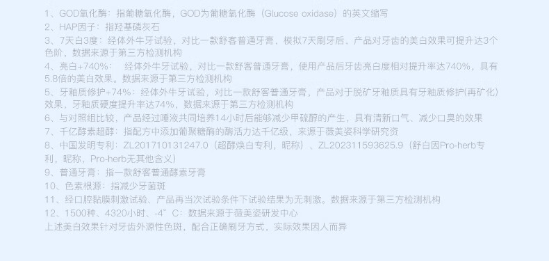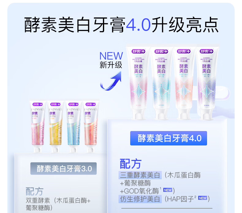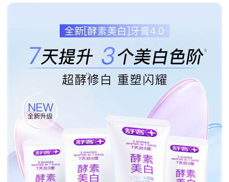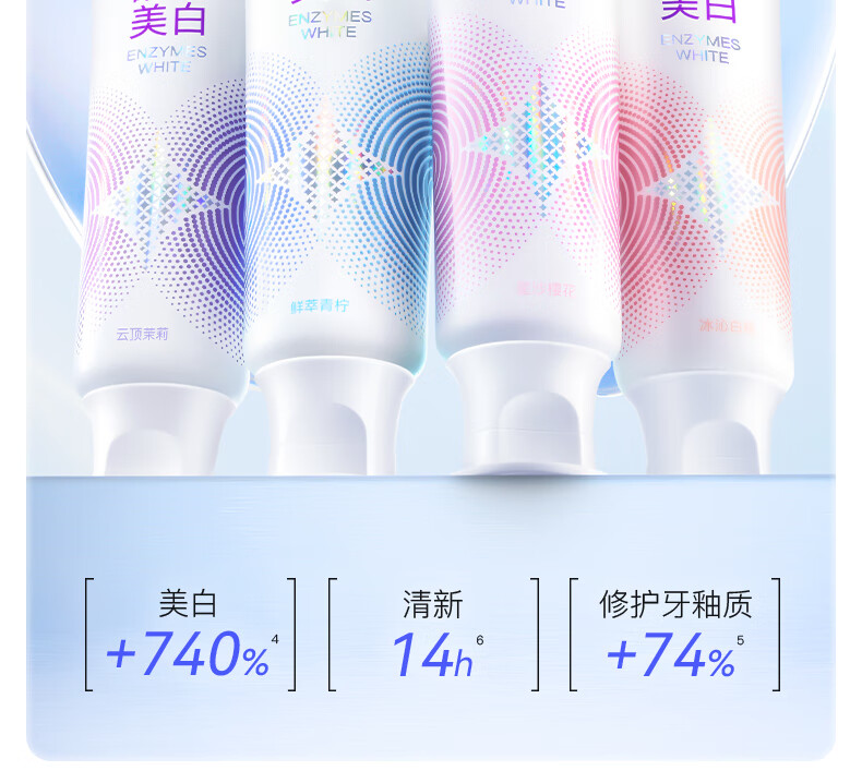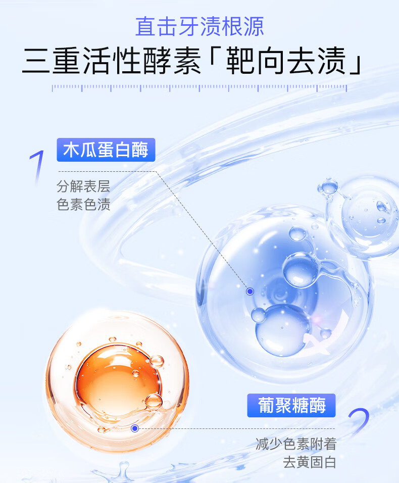 双重酵素(木瓜蛋白酶+ 葡聚糖酶);细闪高透膏体清新爆珠粒子;三重活性酵素「靶向去渍;多维协同全面严防牙渍