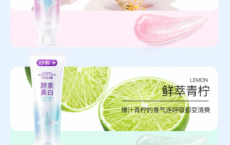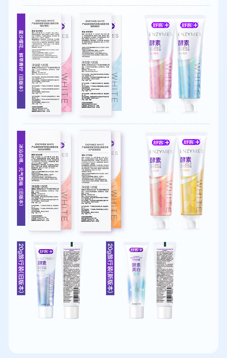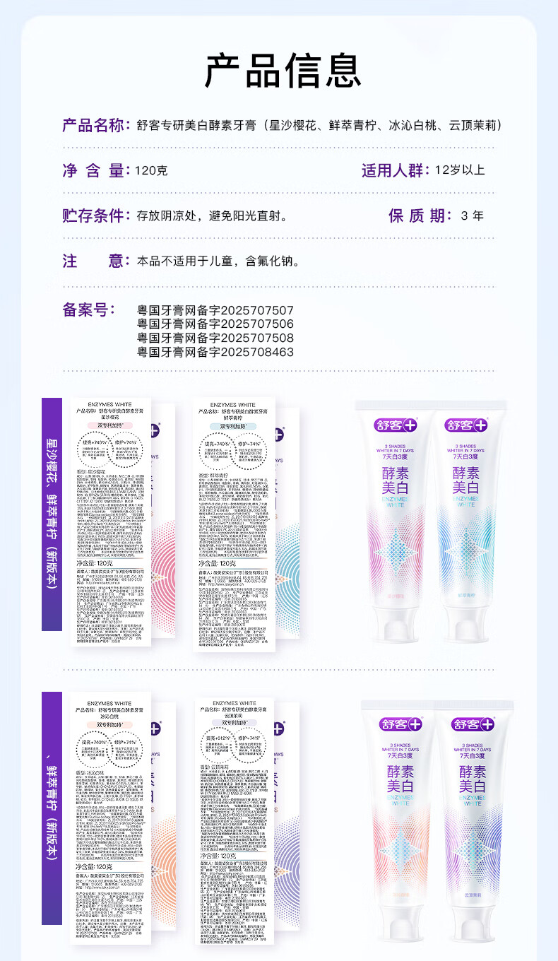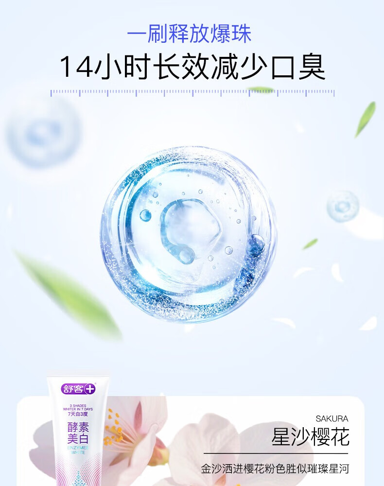 配置清单:舒客星沙樱花酵素美白牙膏120g+舒客专研美白酵素牙膏(冰沁蜜桃)120克-电商专供-V01+舒客色修美白牙膏(活意初生香型)110g(京仓京配)