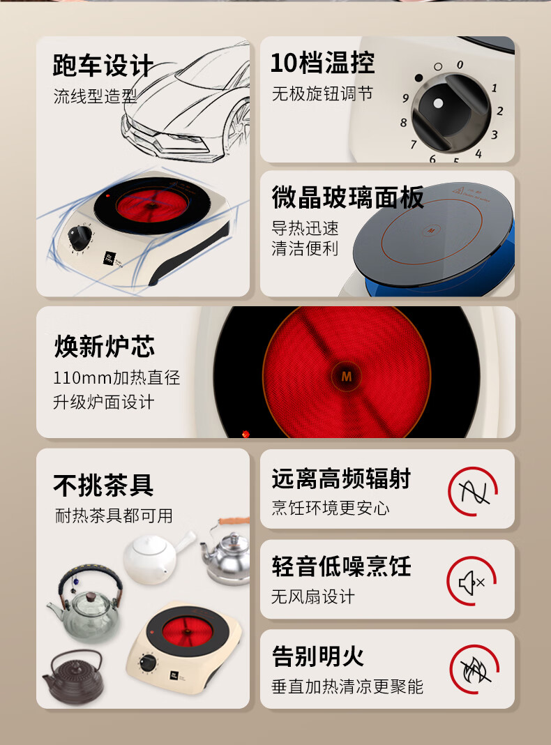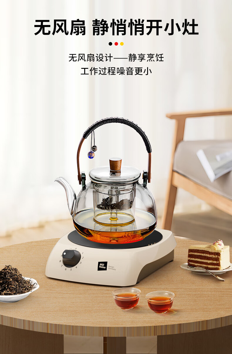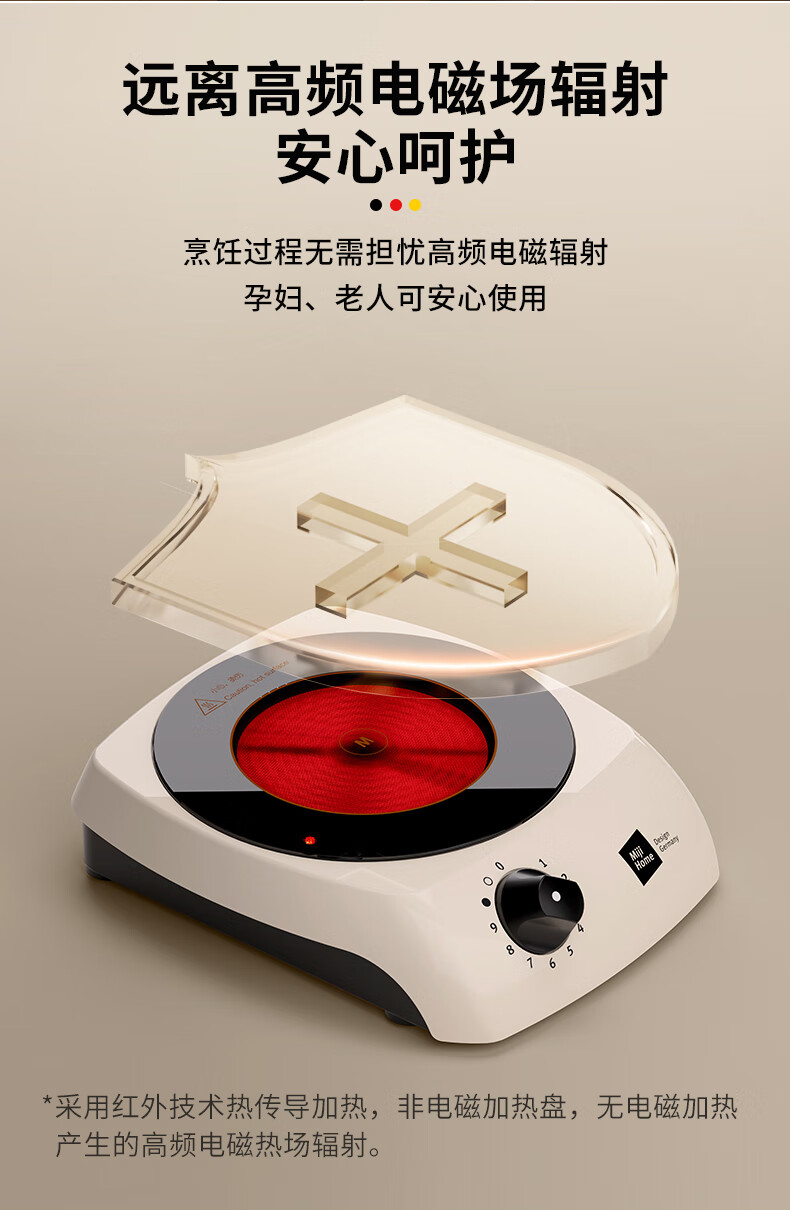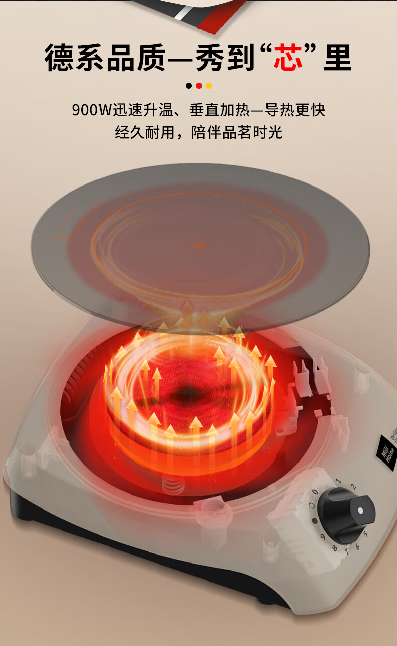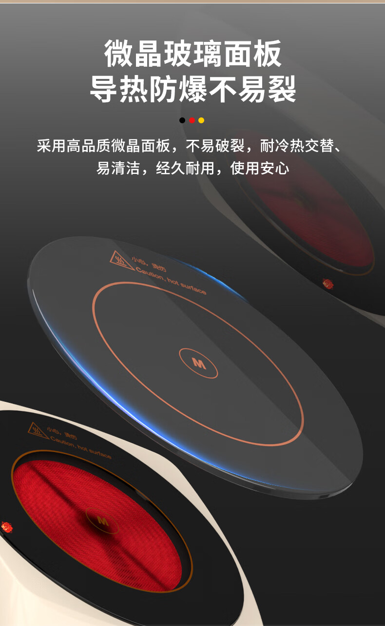 米技炉不挑锅具,让烹饪更自由。;900W火力,通断式节能控制;耐高温黑晶面板,可承受750℃高温,骤冷骤热不爆裂