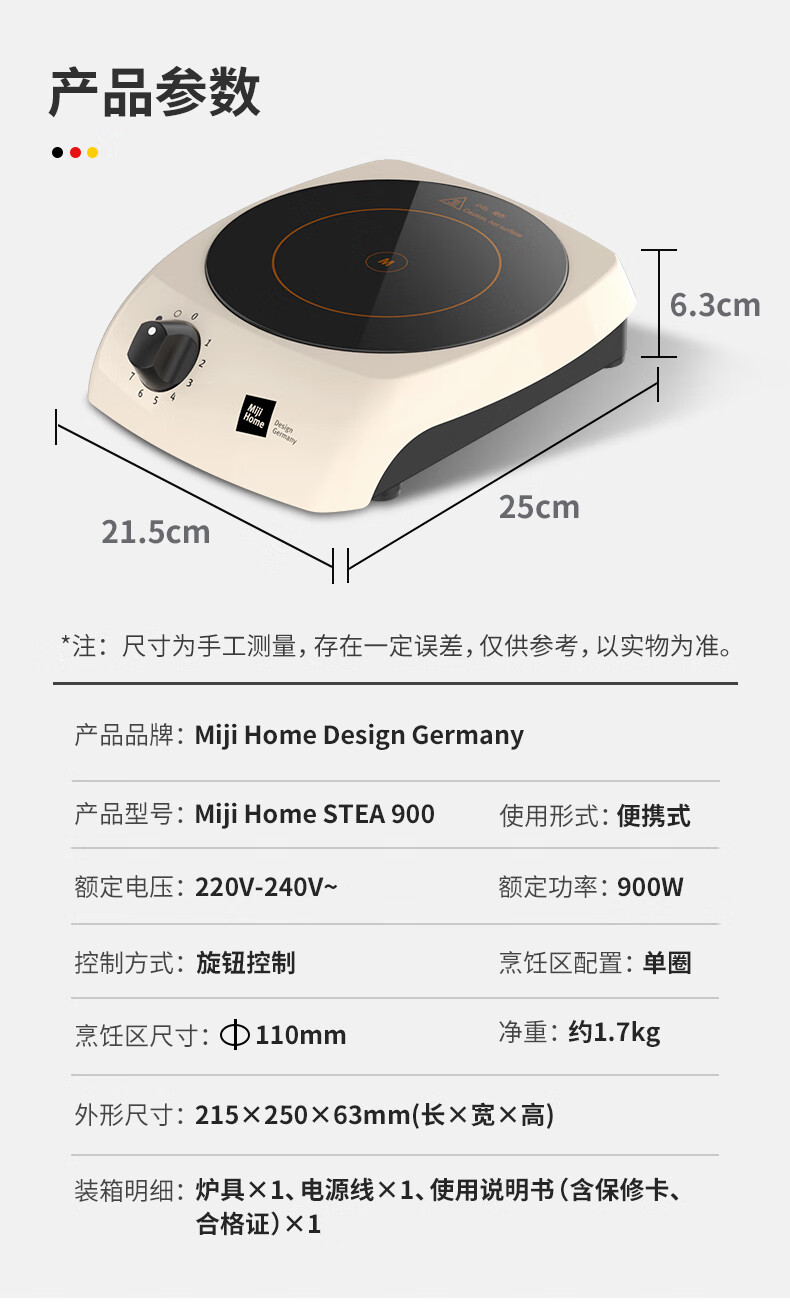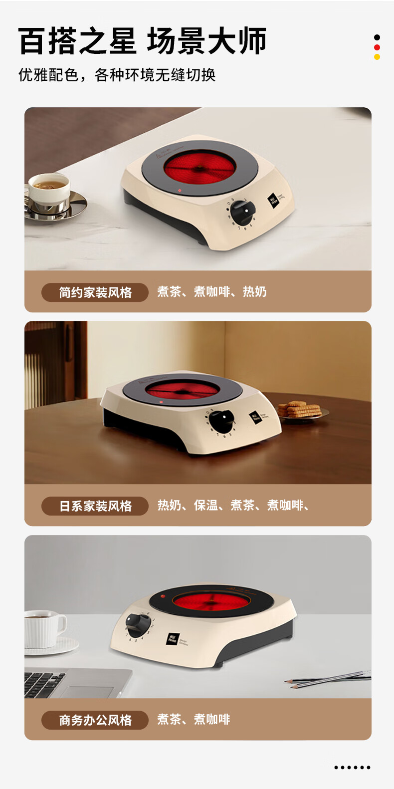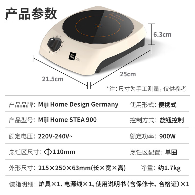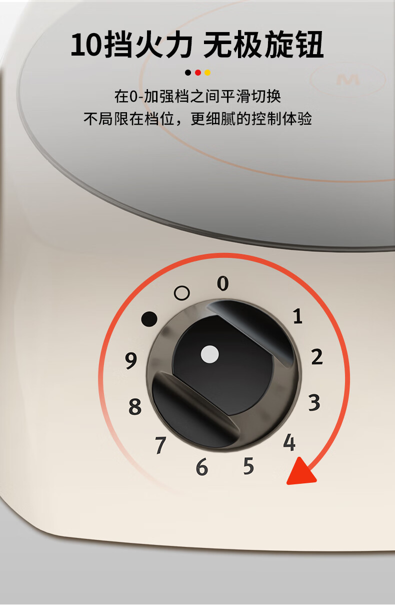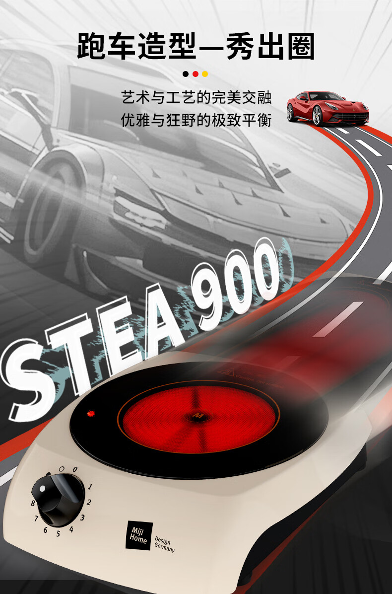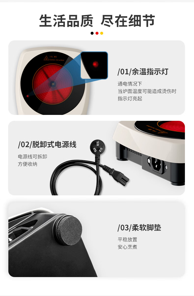 米技炉不挑锅具,让烹饪更自由。;900W火力,通断式节能控制;耐高温黑晶面板,可承受750℃高温,骤冷骤热不爆裂