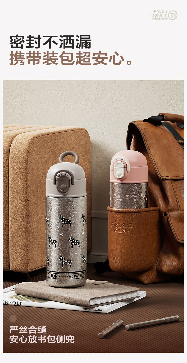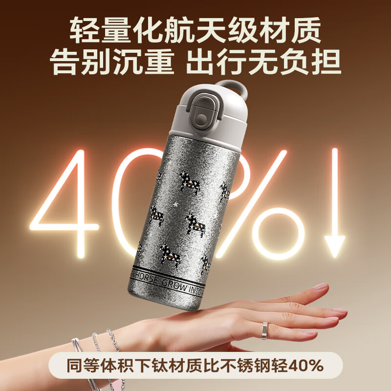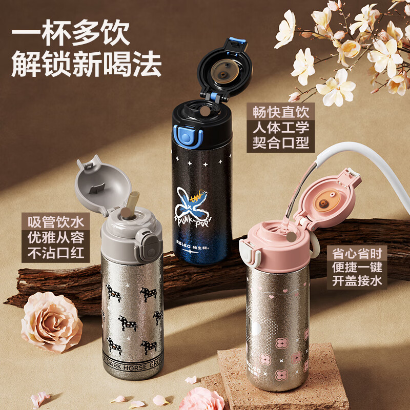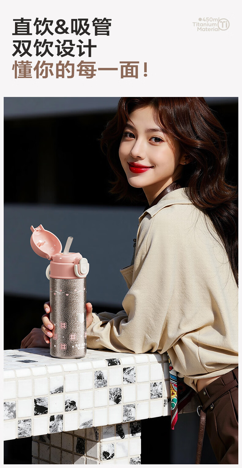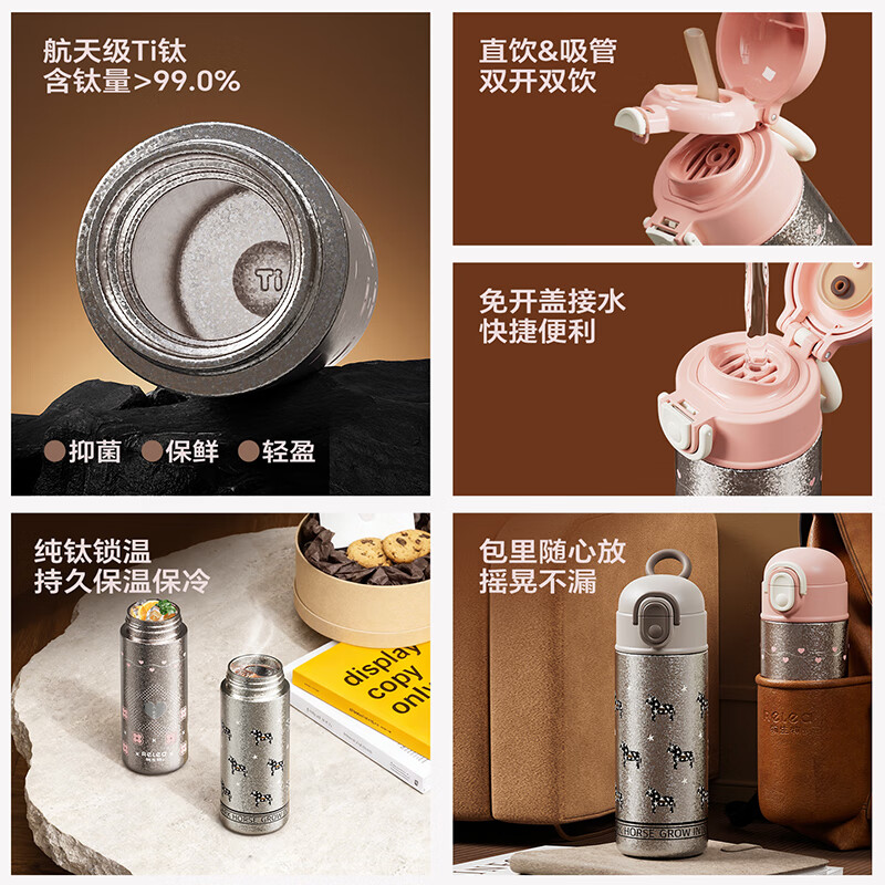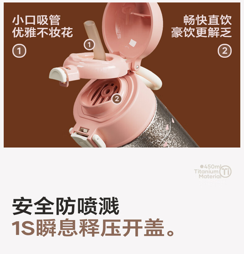 纯钛内胆,抑菌锁鲜;免开盖接水,方便快捷;直饮/吸管一杯双饮,冷热随心
