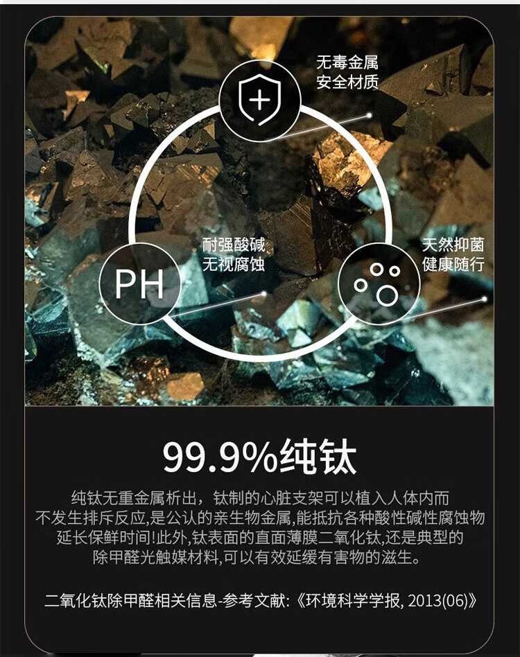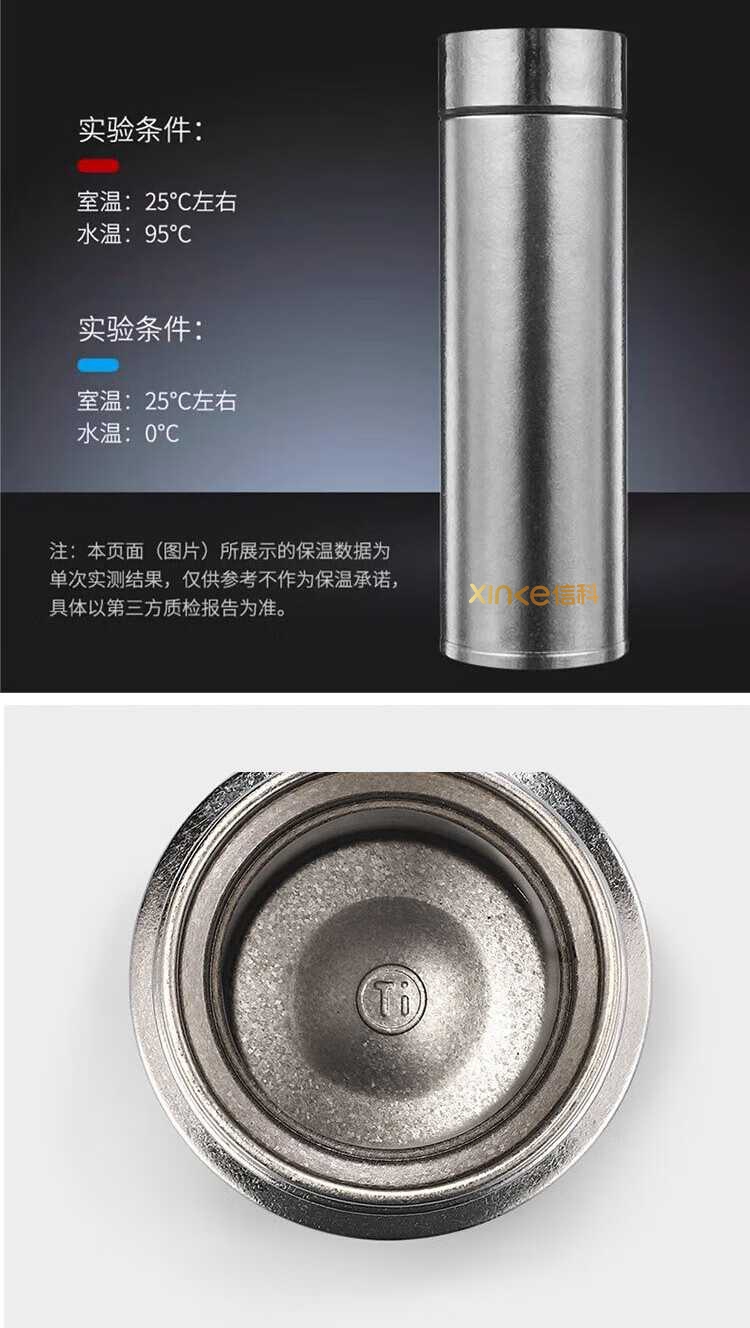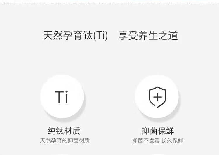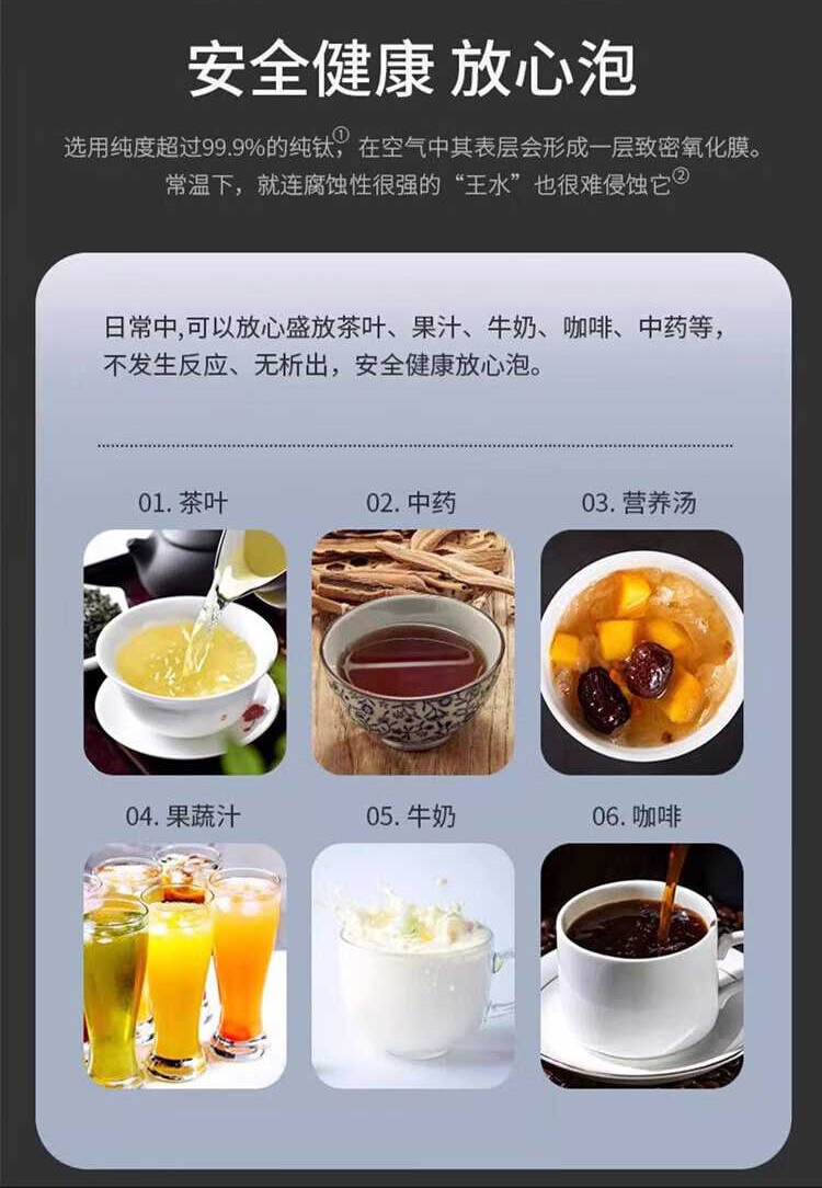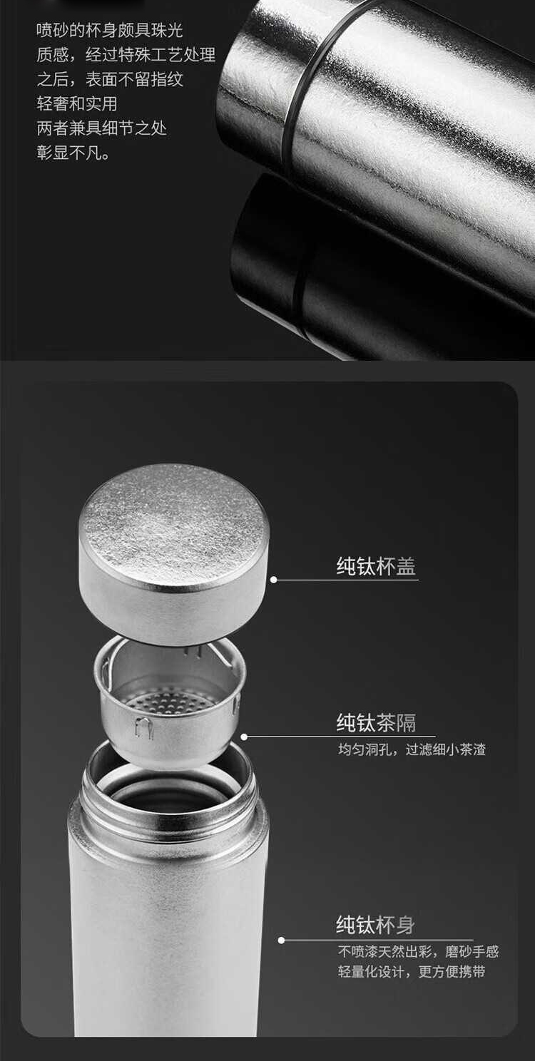 内外双层纯钛材质,采用无铅真空技术;纯钛轻量材质,简约有型,出行便捷使用方便;内外纯钛茶水分离,净化水质抗菌养生