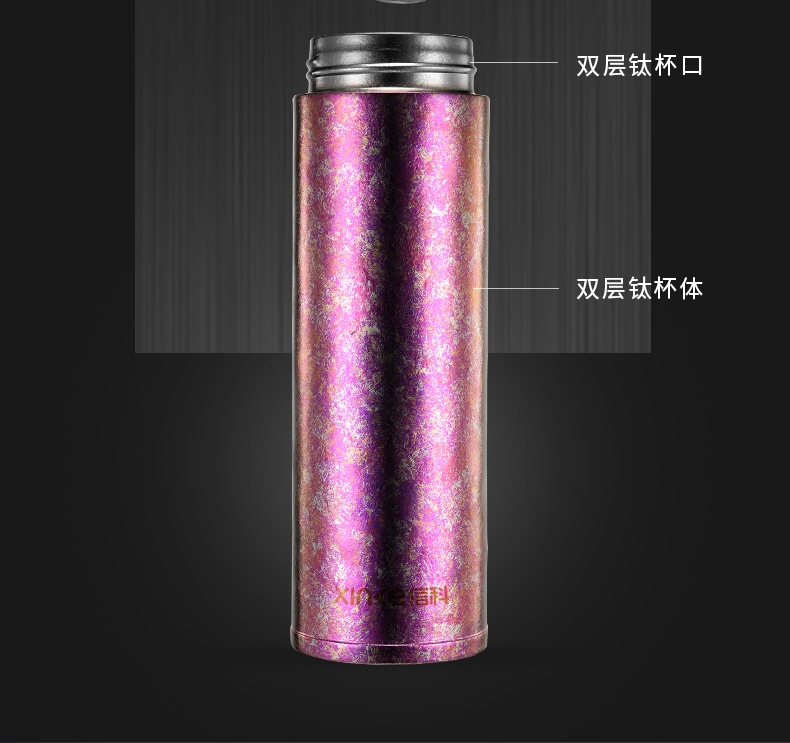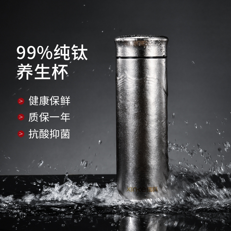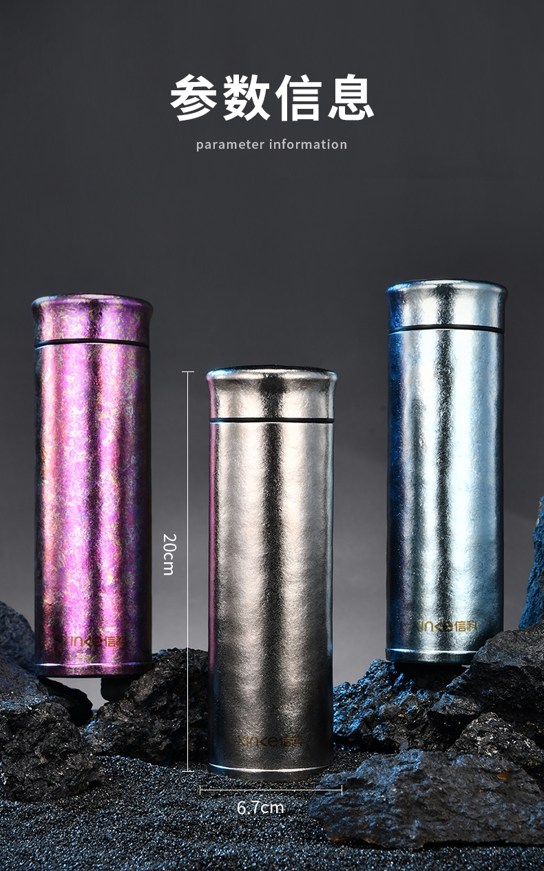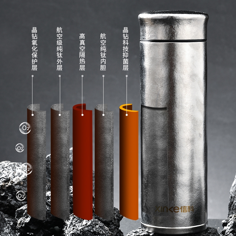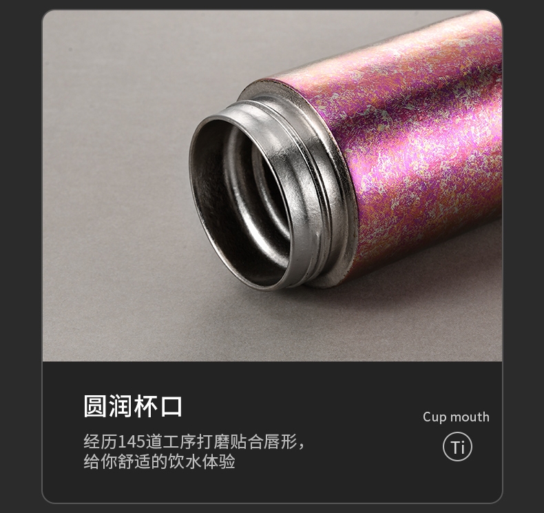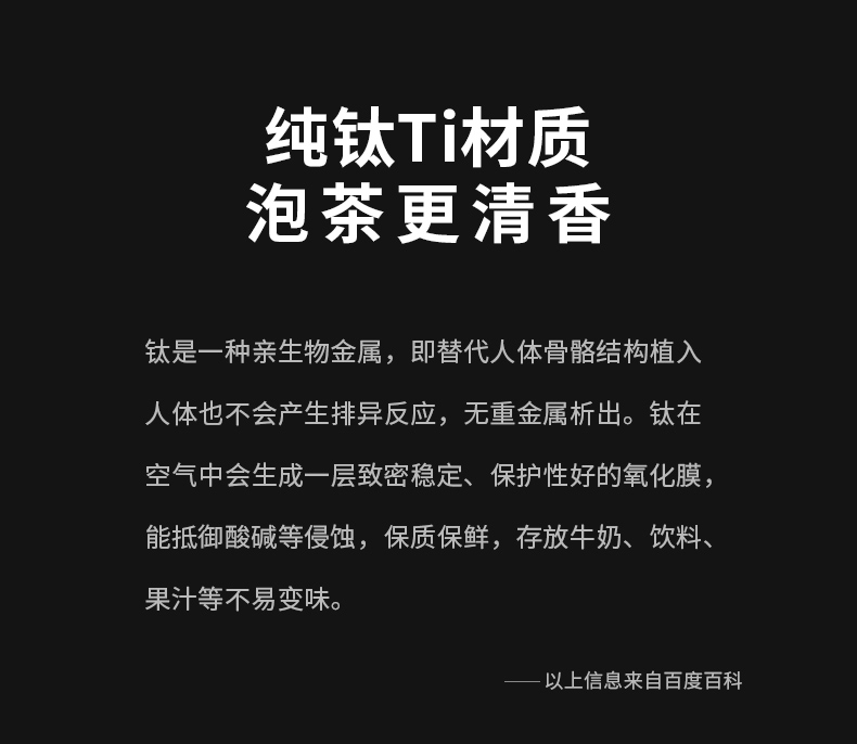 内外纯钛抗菌保鲜,1000°C高温锤炼,长效保温;高奢纯钛轻量无感鲜泡鲜饮;钛”全身所见金属皆为纯钛