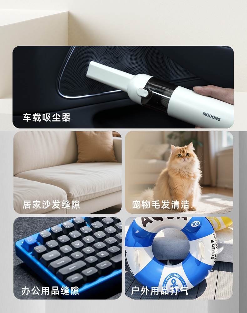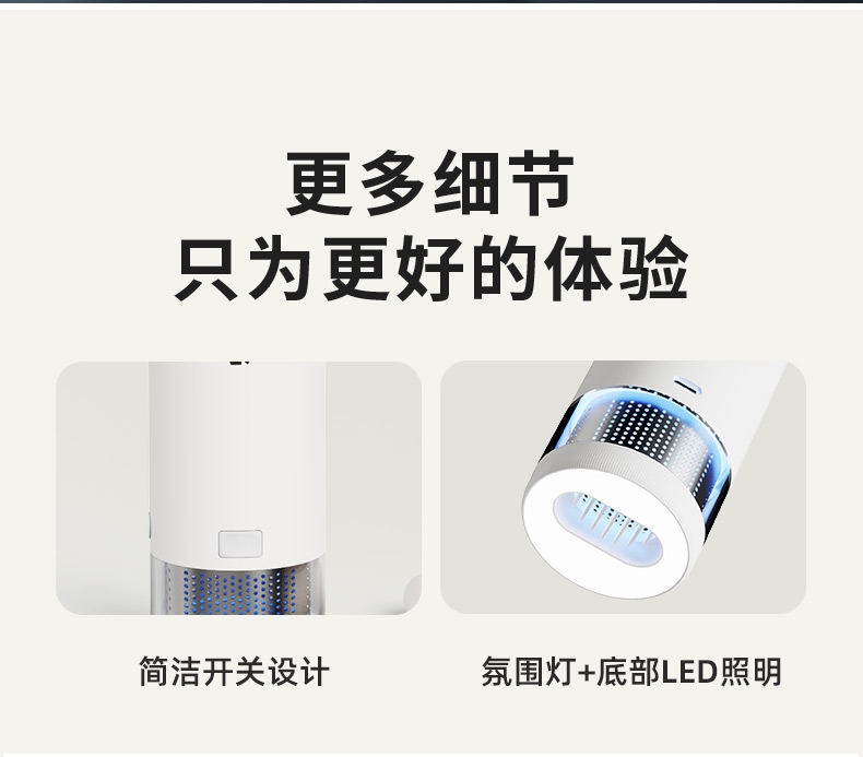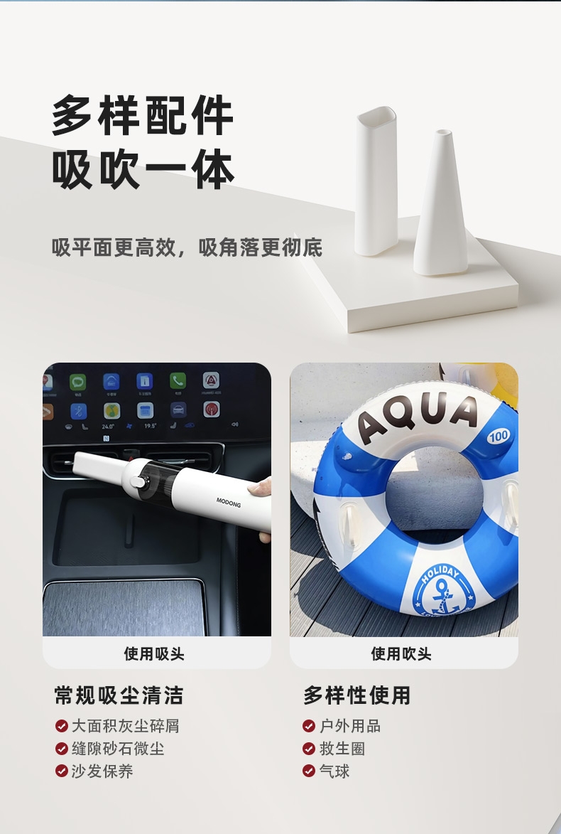 工作模式:一键开关;双重高效过滤:高效HEPA过滤;可拆卸吸嘴:吸嘴可拆卸,可以吸气,吹气