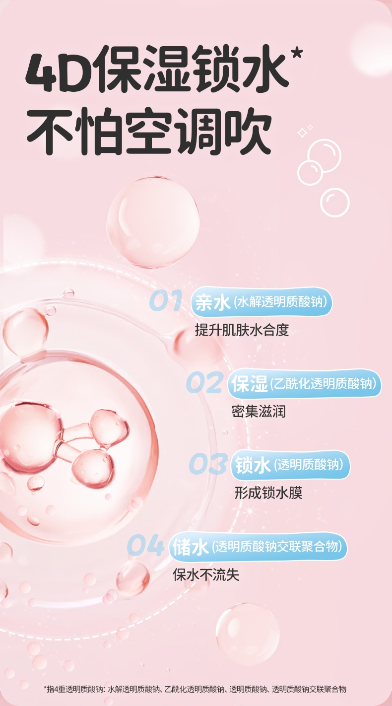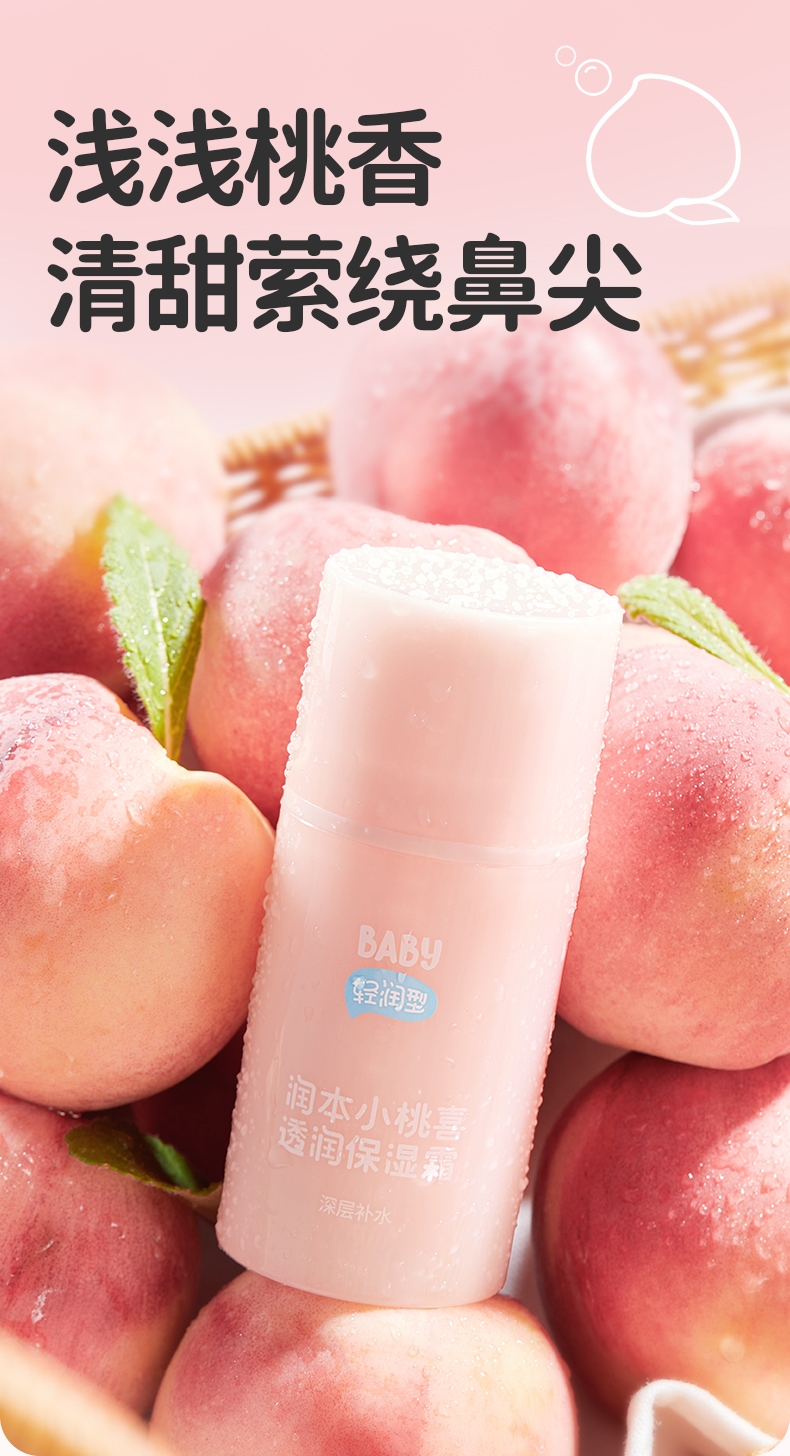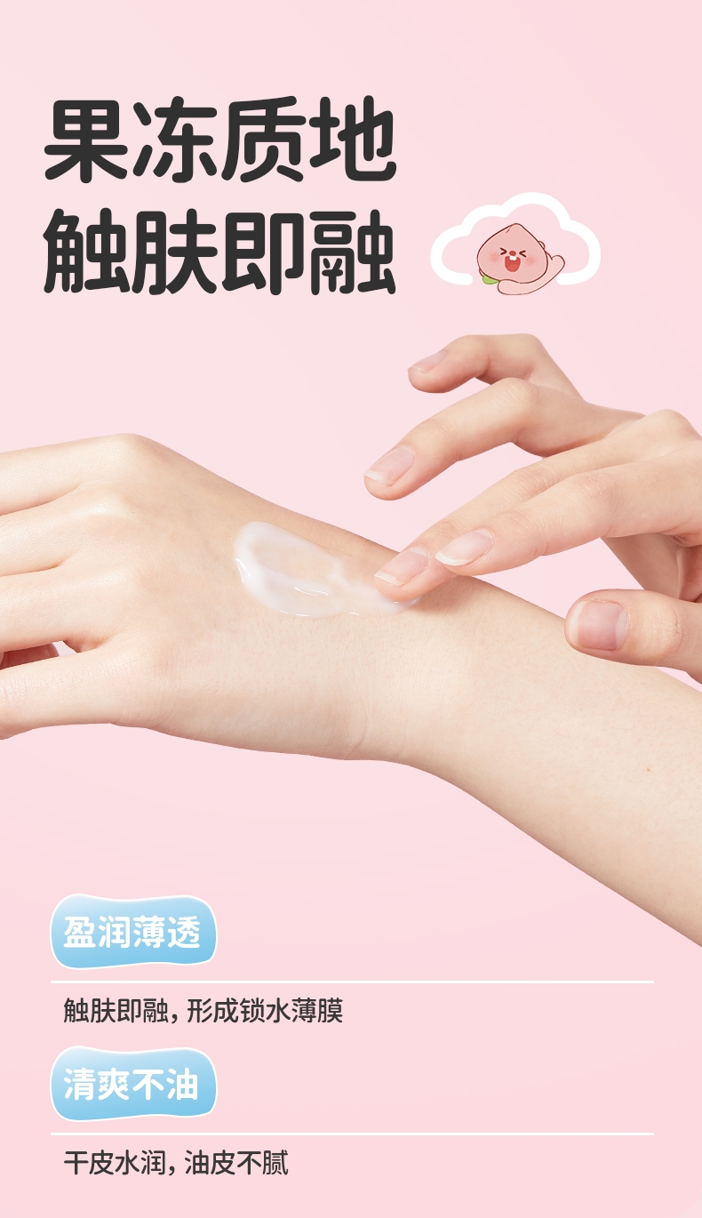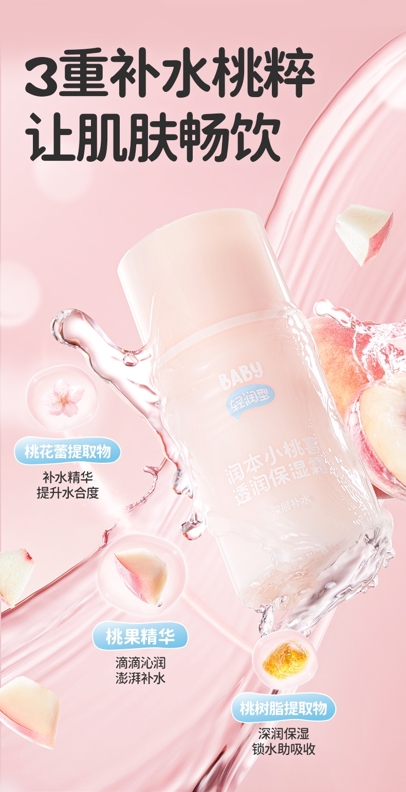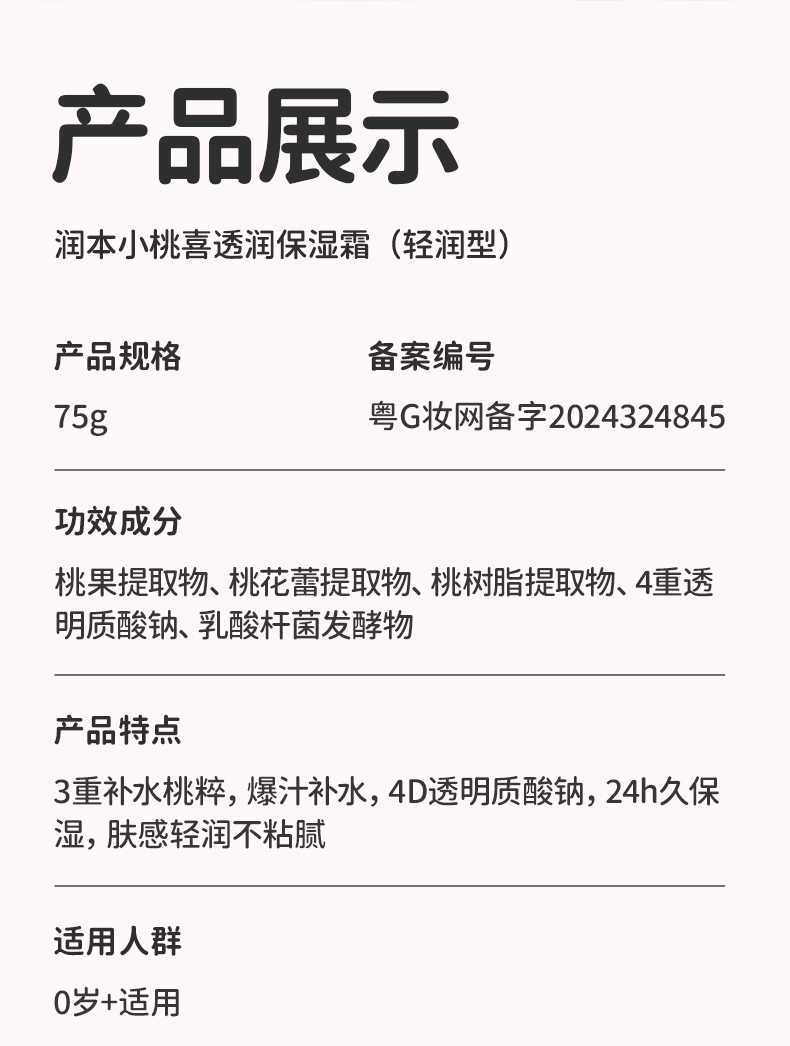 3重补水桃粹,爆汁补水;4D透明质酸钠,24h久保湿;肤感轻润不粘腻