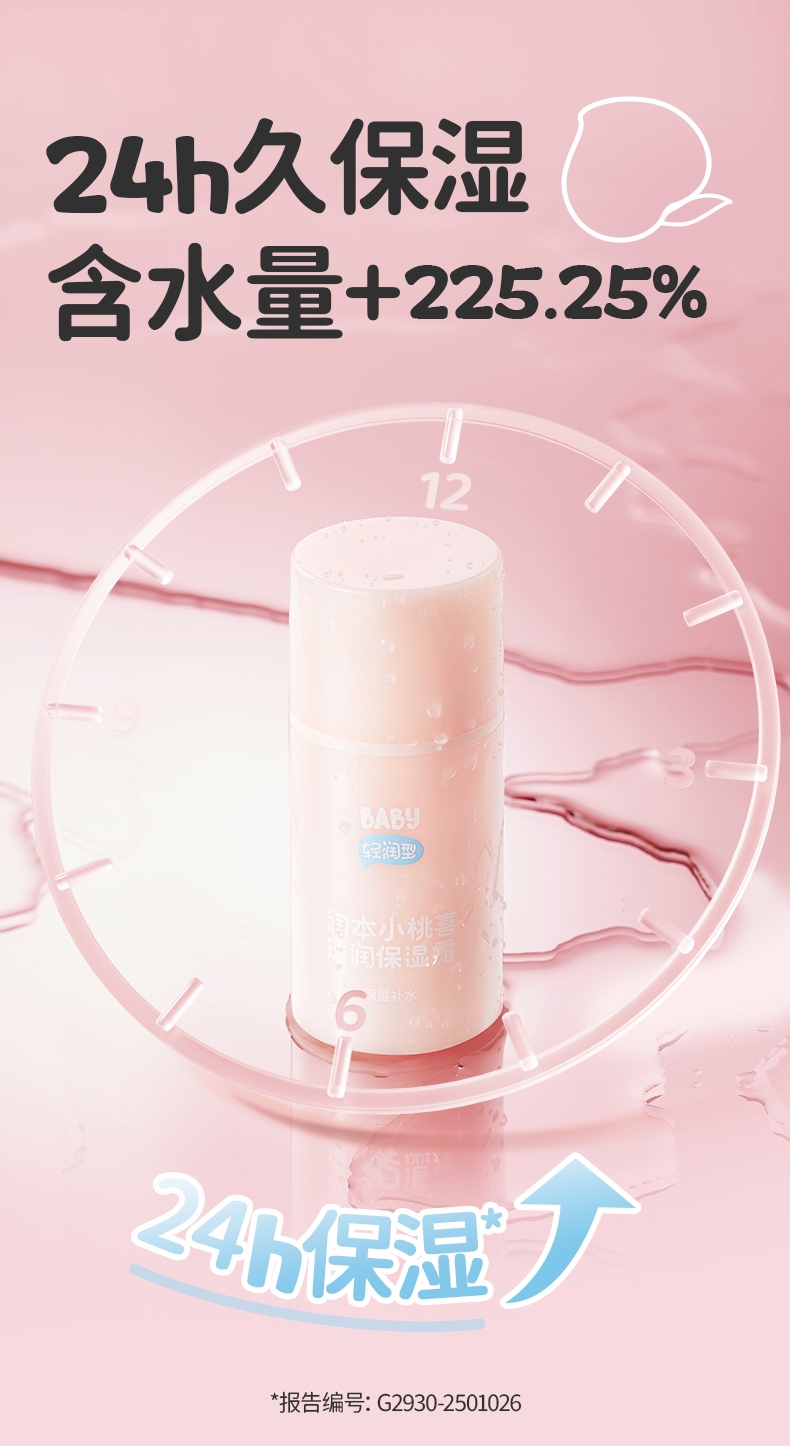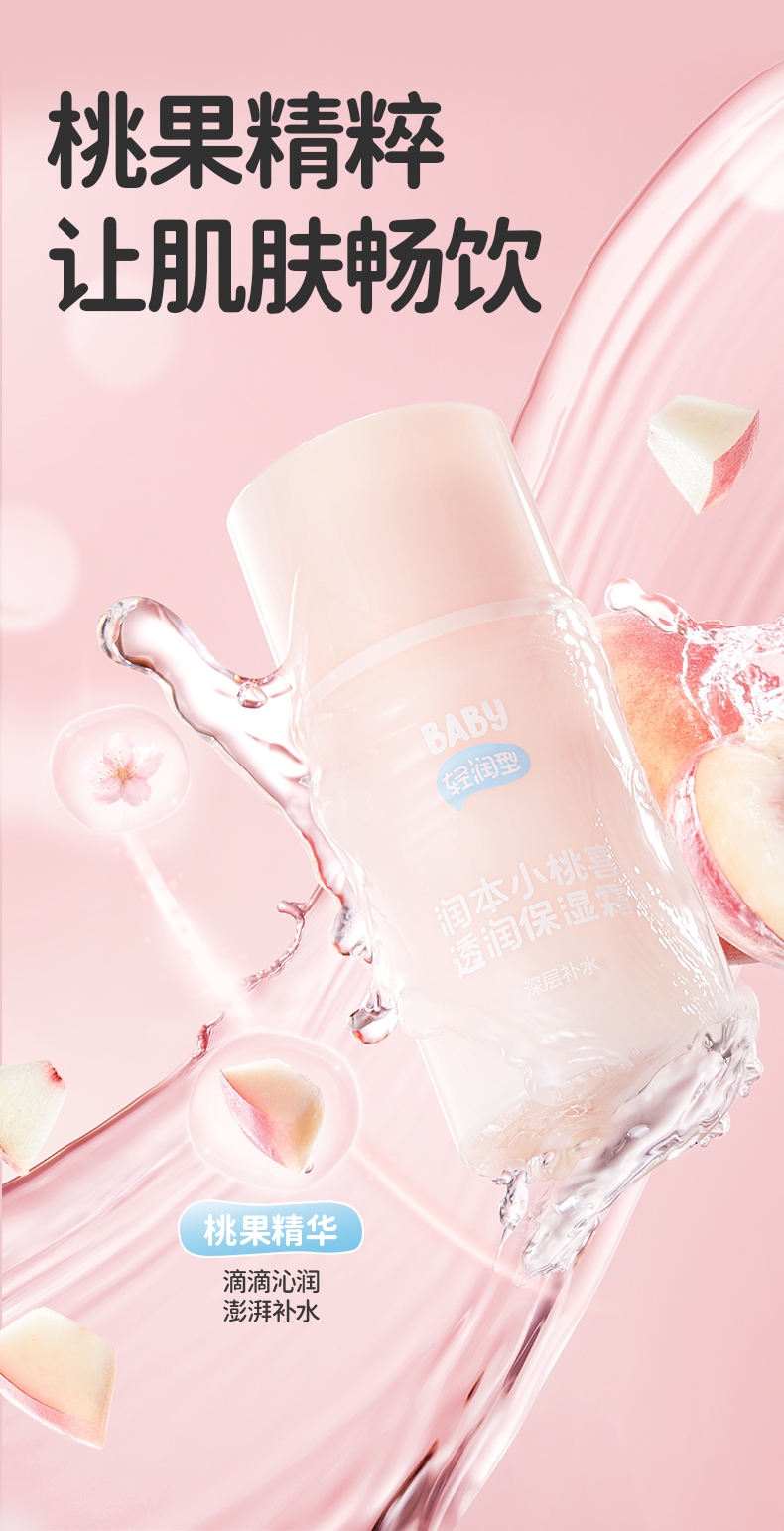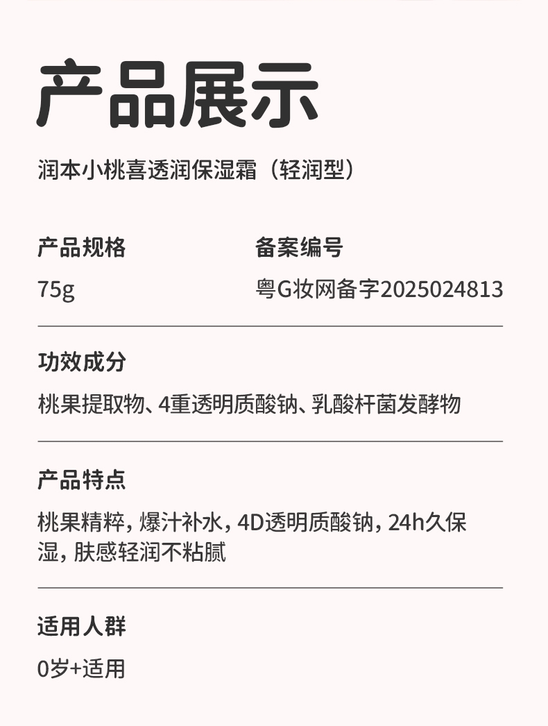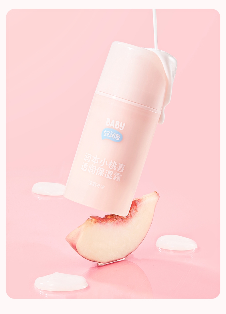 3重补水桃粹,爆汁补水;4D透明质酸钠,24h久保湿;肤感轻润不粘腻