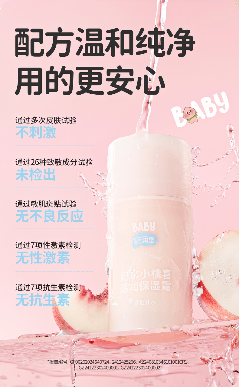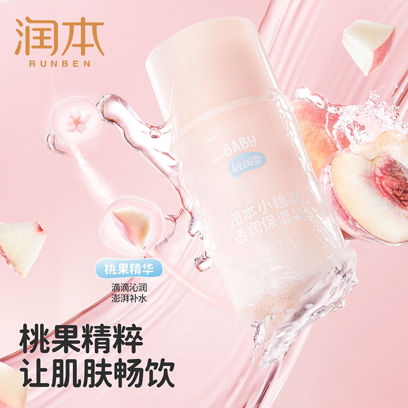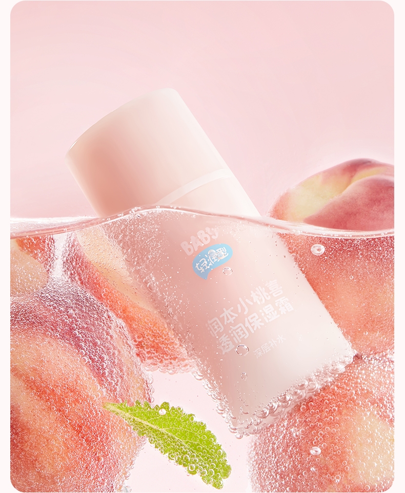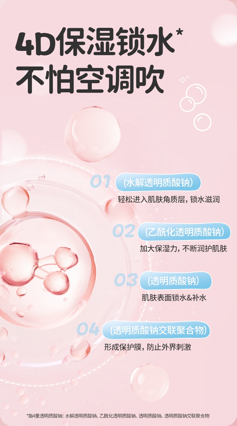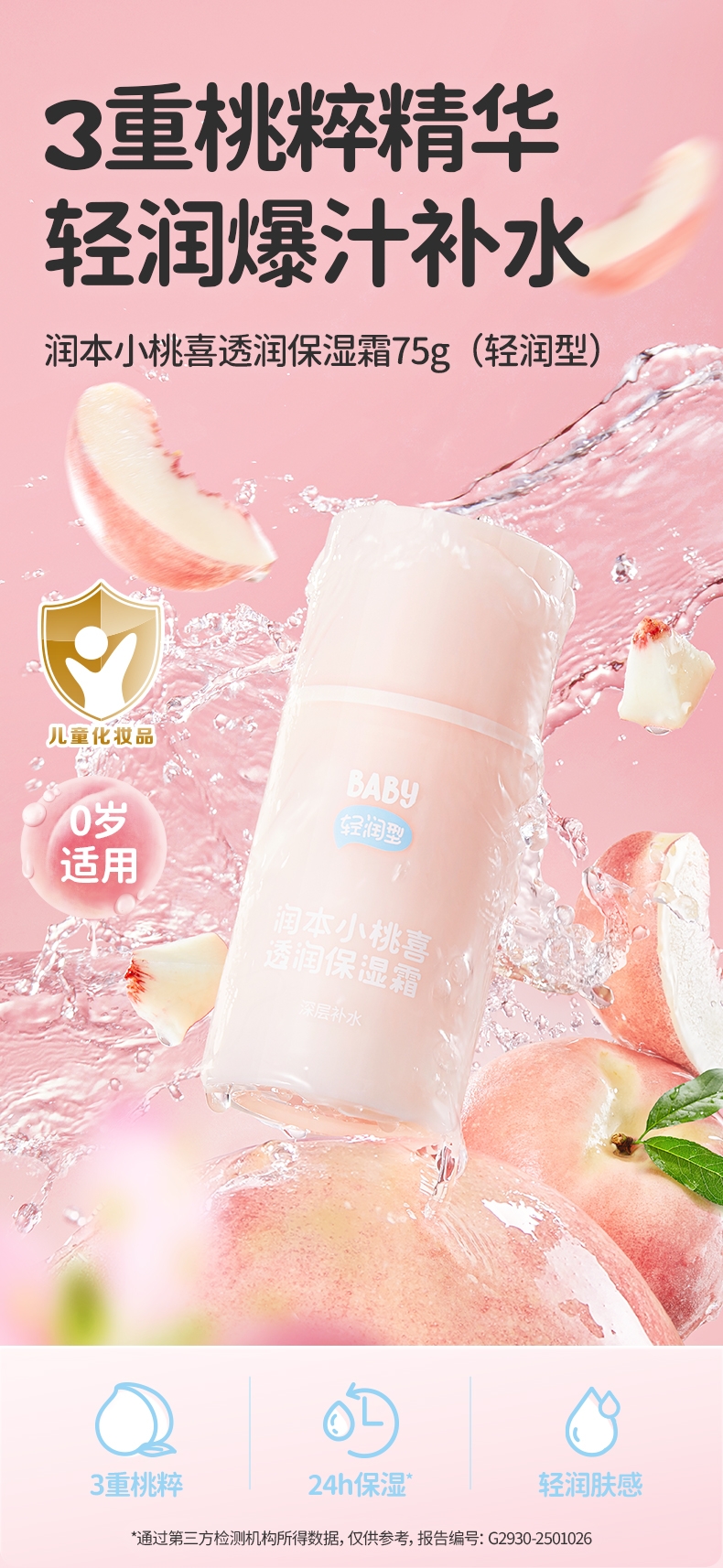 3重补水桃粹,爆汁补水;4D透明质酸钠,24h久保湿;肤感轻润不粘腻