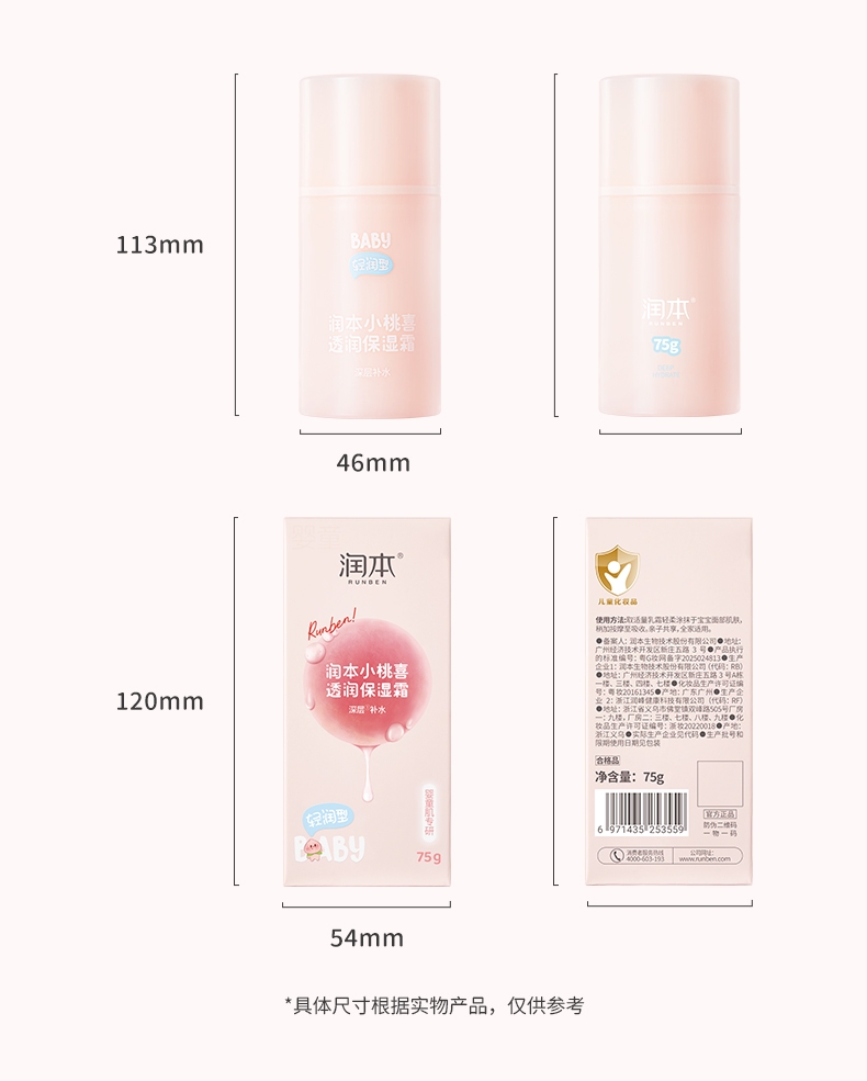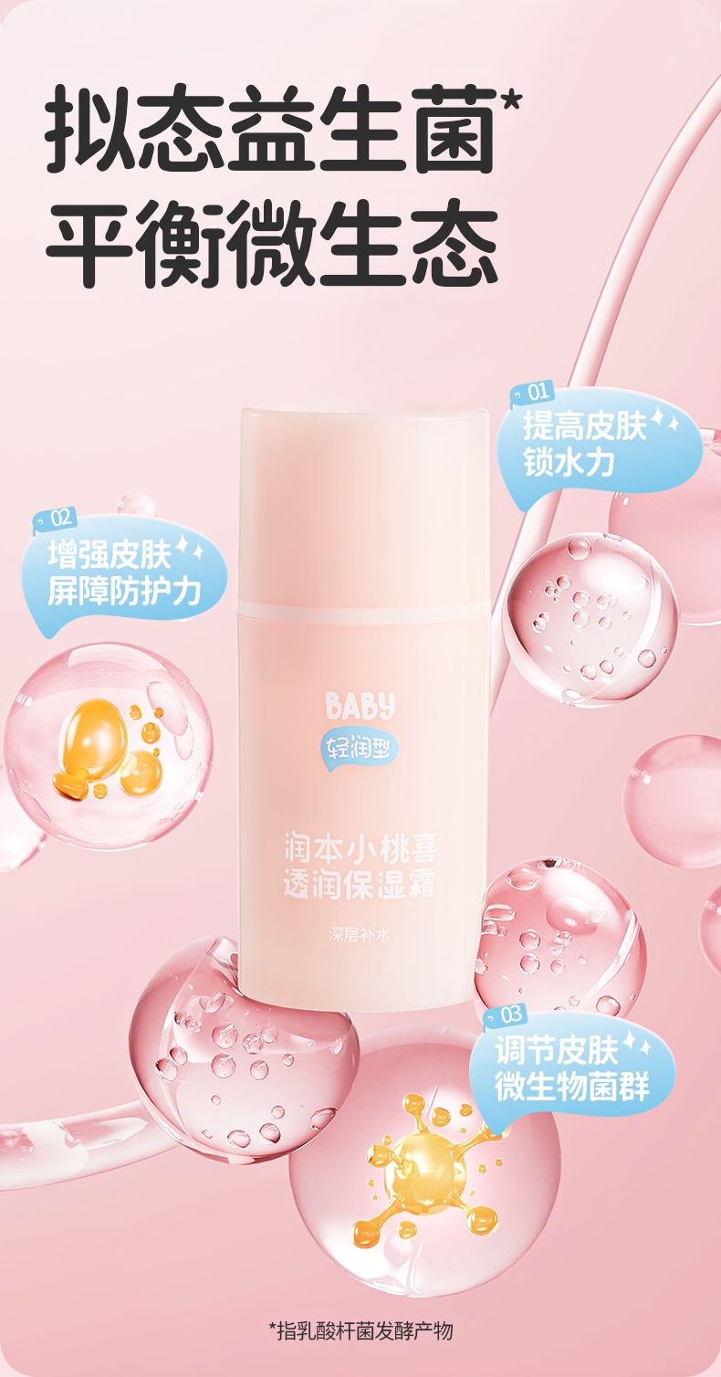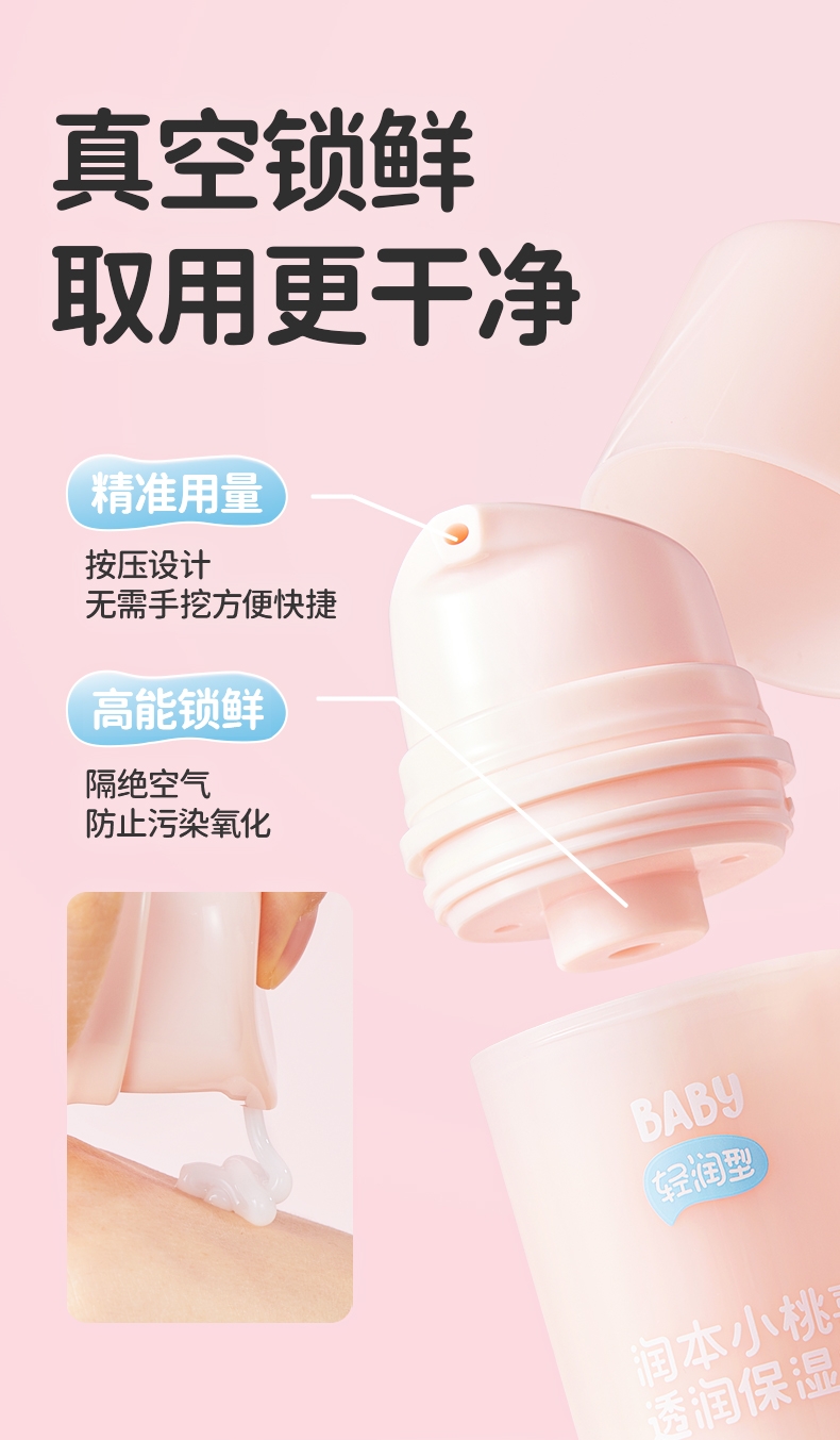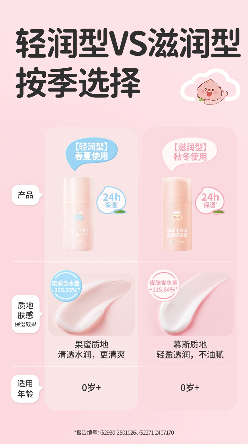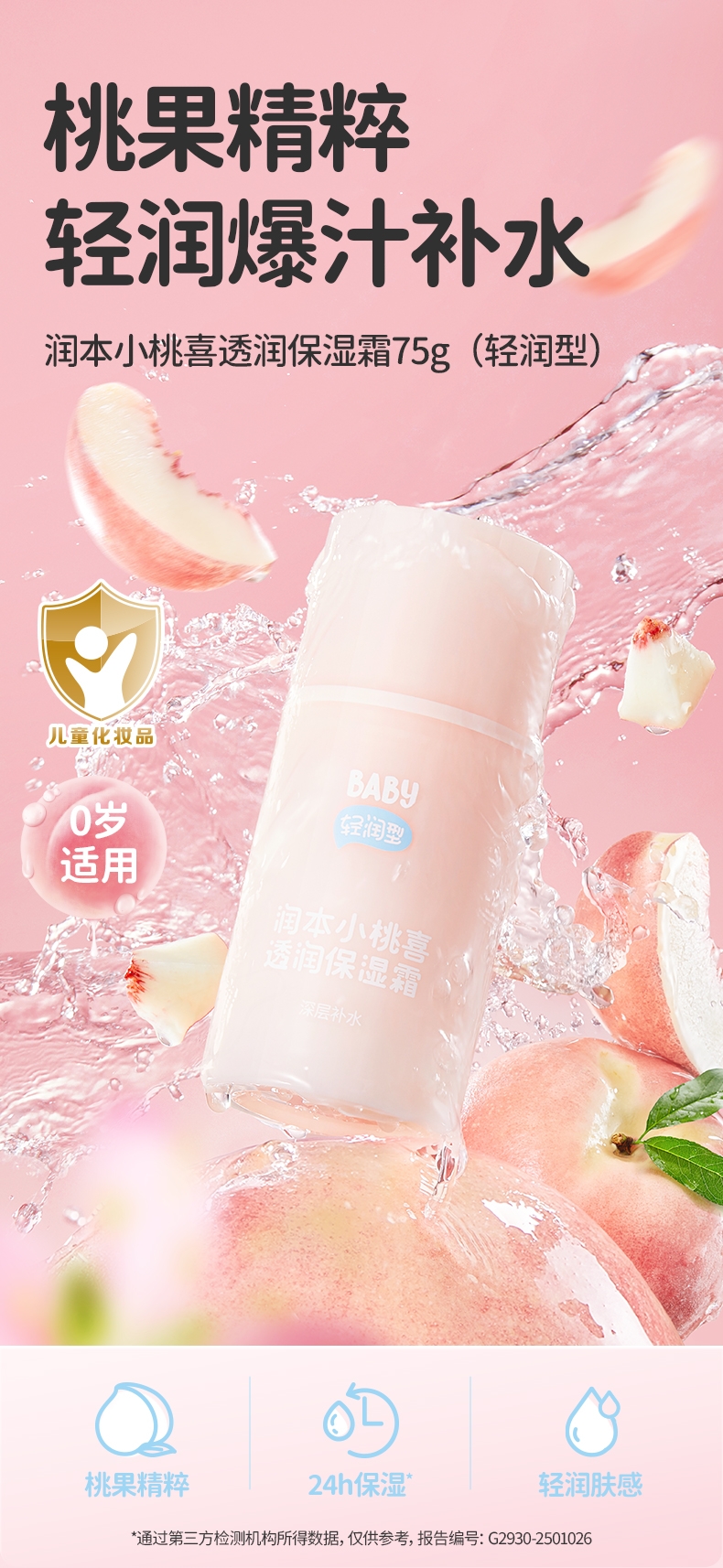 3重补水桃粹,爆汁补水;4D透明质酸钠,24h久保湿;肤感轻润不粘腻